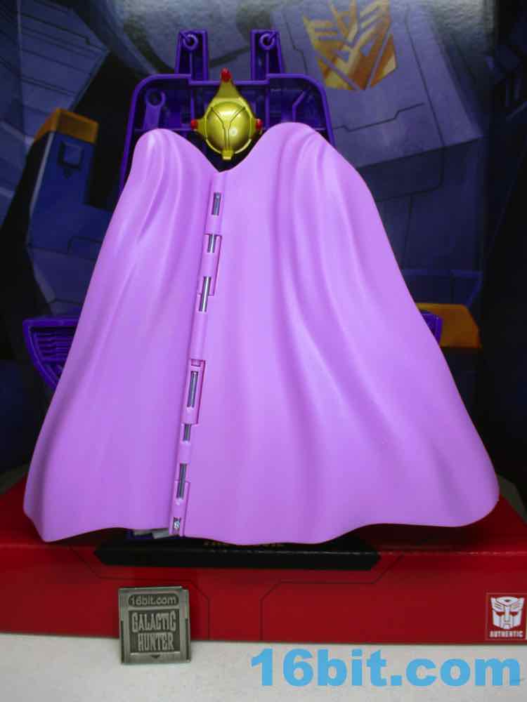 The crown is a little bulky, but fits nicely on Starscream's head or in the back of the throne. Hasbro has done a bigger crown for the Leader-class Combiner Wars toy, but outside of Masterpiece Editions we've never had the cape or shoulder pads. The cape is a jointed 3-piece affair with a 5mm peg. You can fold it down to a small cape, or you can have it swing out on the right side so he can gesture mightily or something. It just plain works, so it's good. Similarly, it can hang off the back of the throne - there's no way for him to sit while wearing the cape. Physics. The figure looks improved with the gear, but I don't assume that this Starscream is Hasbro's final say on the character - there's still room for refinement and I don't doubt a much more streamlined, less greebley Studio Series version down the road. This isn't to say that it isn't good - it's just that a different design aesthetic from Earthrise doesn't quite mesh with the smoother Studio Series look.