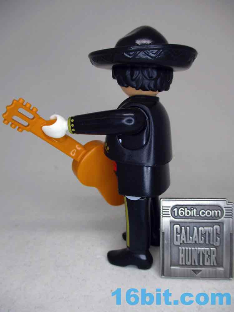 Figures like this are exciting, or at least a strange translation of a culture's traditions through the mirrors of pop culture and overseas toymakers. The sombrero has subtle sculting detail around the brim, plus some painted gold elements. Meanwhile, the guitar has no painted deco - but it fits in his hand perfectly, and has been a mold used and reused for decades now. As with all Playmobil figures, he can stand and sit with the best of them.