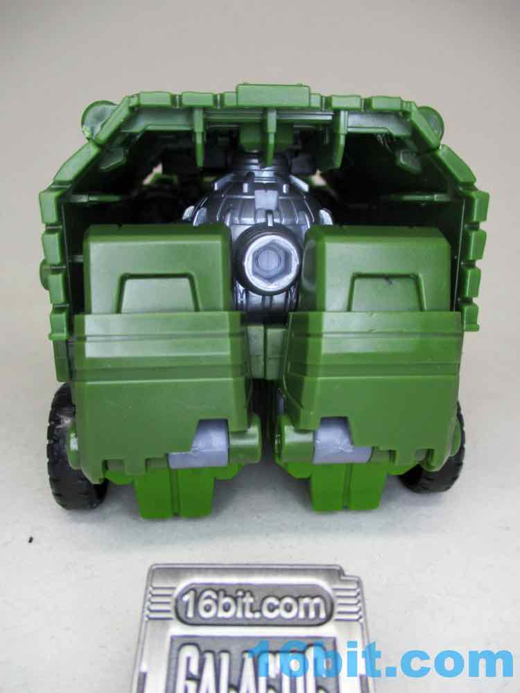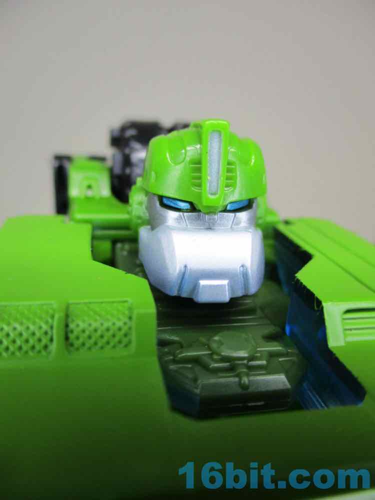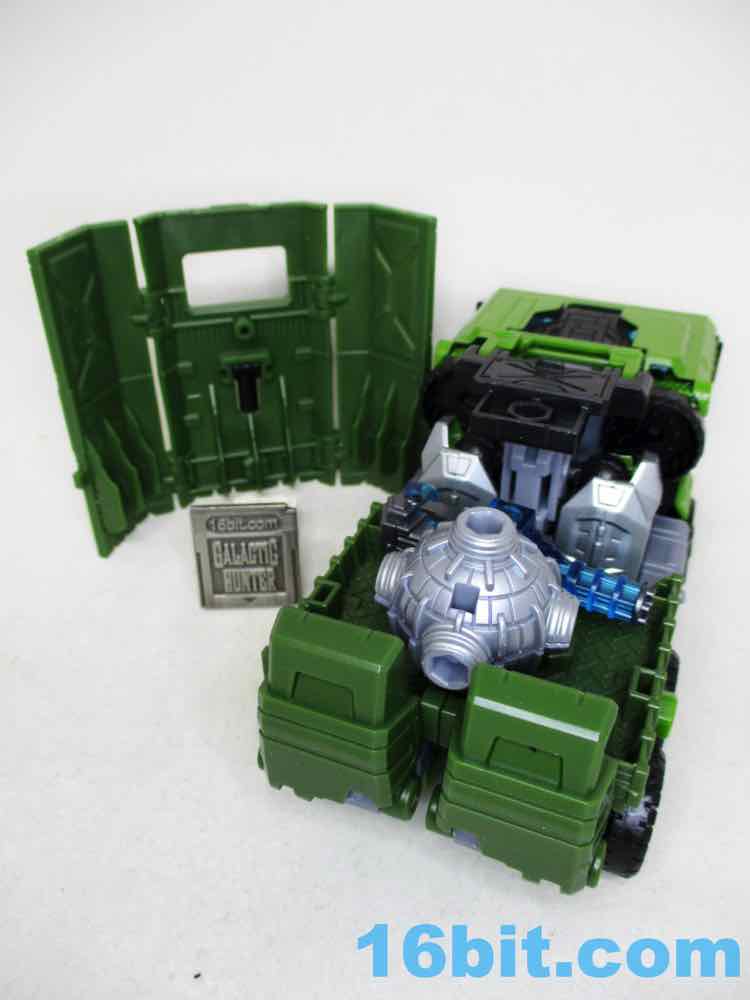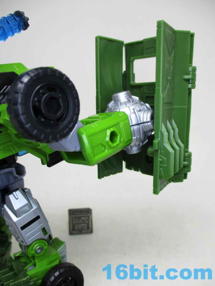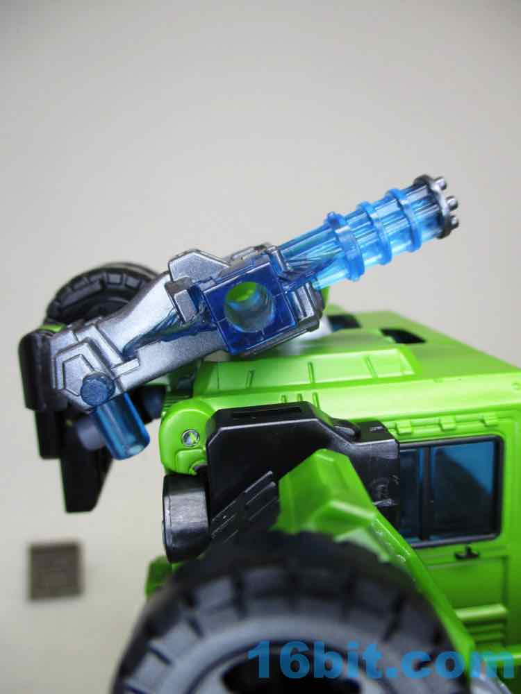 It's a good truck, and I like how it actually lets me do things. For starters, there's a tarp that covers the back - and you can store the blaster and mace fist in there. I absolutely love that. When that's all assembled, you have a cute (and admittedly, kind of small) truck to lpay around with. There are no sign of the 3mm pegs for blasts, but you do get a hinged 5mm peg on top to use as a foot peg for other dudes to surf on his back. This, I love. There are two 5mm hardpoints on the sides for Mini-Cons/Energon Weapons/whatever, too. I also see three 5mm holes to mount added gadgets. This was normal 20 years ago during Transformers Armada, but nowadays we don't see a lot of this since there are few (OK no) action features or added weapon packs most of the time. It's almost a shame Hasbro isn't selling Mini-Cons or other little buddies to hang out on the sides. I should also note that the wheels don't roll particularly well, which is a shame because it's a truck.
