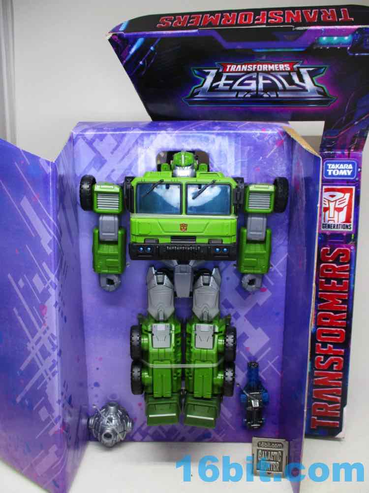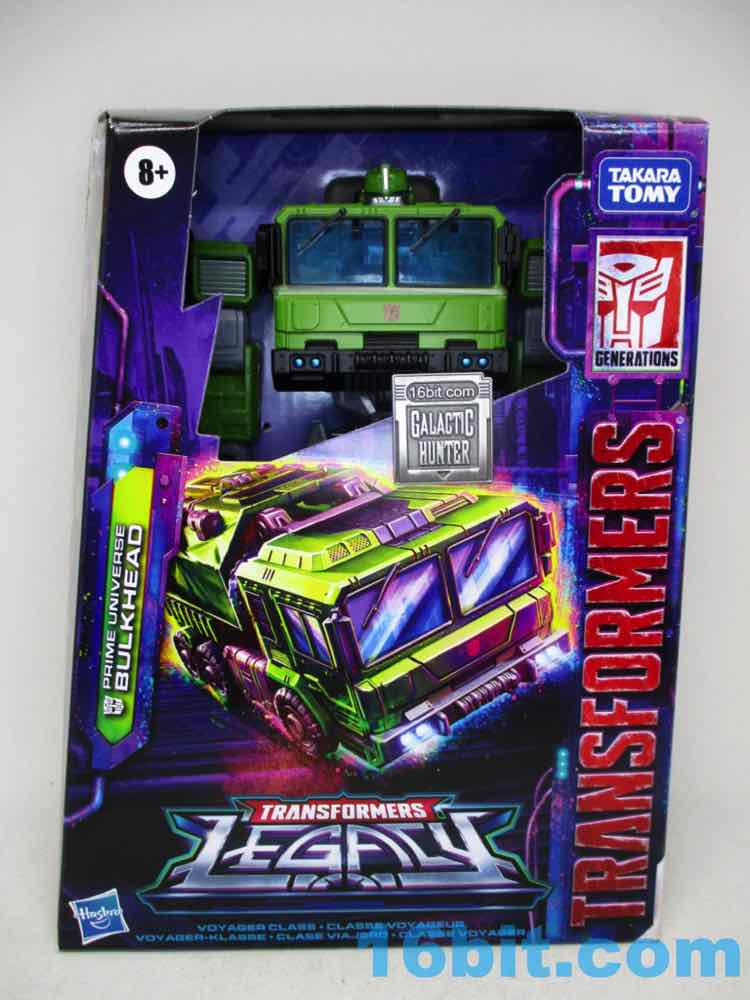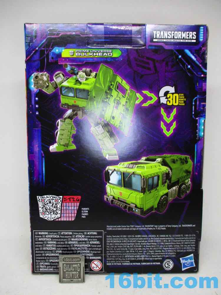 Based on a character that tends to be pretty round, Hasbro's Prime Universe Bulkhead is pretty boxy. It's a different take on the Animated and Prime Autobot, but the familiar landmarks are all there. He's gree, he's got a huge chin, there's a mace fist, and he's a wide boy in robot mode. Given his torso morphed from a sphere to a cube, it fundamentally changes his whole personality. It's neat as its own thing, but I assume it's not going to scratch the itch of people who have something specific in mind as to what "Bulkhead" should be as a toy. But it's also a super-articulated robot with some surprise Mini-Con hardpoints and some fun connector pieces that actually let me have fun with it, so I'm going to like this one. And maybe they'll make a better one - or an interesting retool - later. But until then? This makes me happy.
