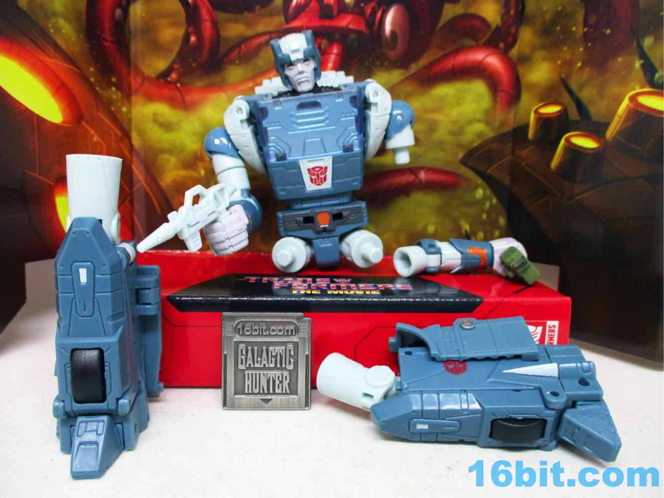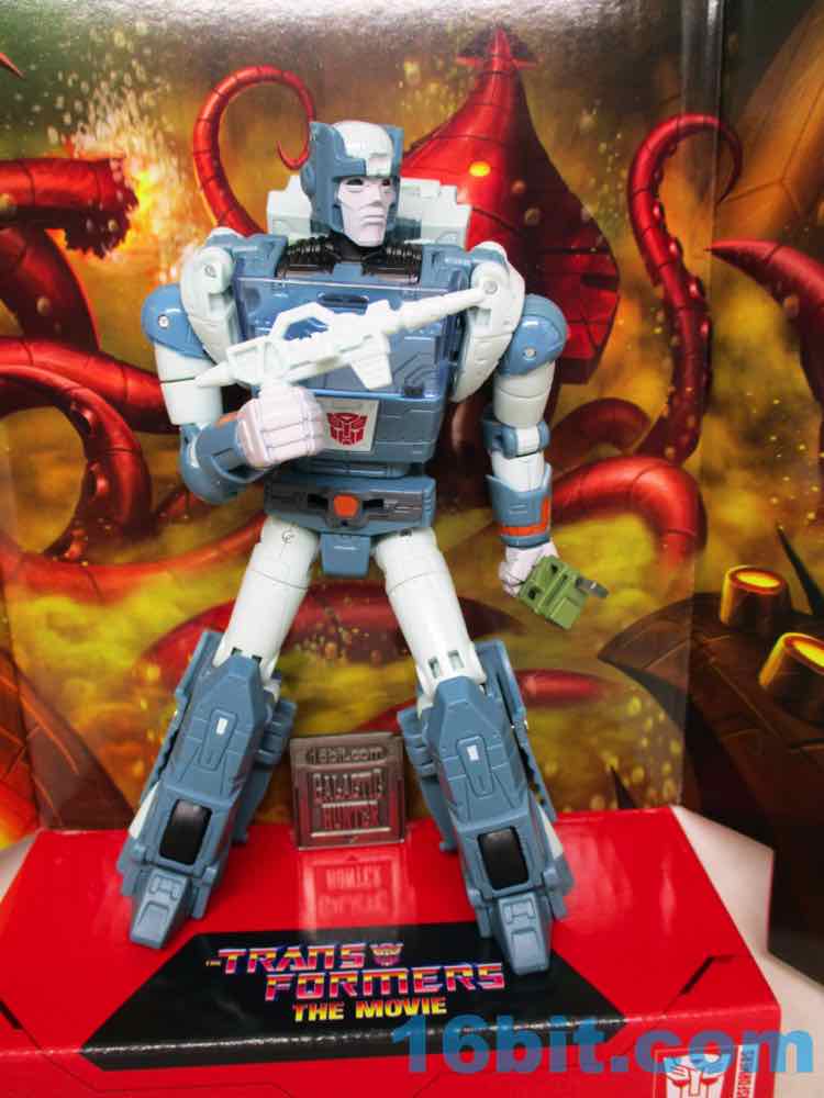 Kup has about 18 meaningful points of articulation - four of which probably exist solely for that "fix me" scene where Hot Rod has to put him back together. (Hot Rod includes the repair tool hand.) His silhouette is pretty good, but the shoulder just strike me as wrong. In person they're not nearly as awkward as the photos, especially when you're playing around with him, but they stand out due to the coloring. If the light seafoam shoulder part tucked in to the chest a tiny bit, I think we'd be OK. This Kup is a lot skinnier than how he looks on screen, and captures the landmaks - but maybe not the spirit - of the original movie design. The colors aren't quite as saturated, and he lacks the twinkle in the eye you saw on Hot Rod. I bet Hasbro could probably do a repaint of this mold that would knock our socks off - perhaps in animation colors, covering up the circuitboardy chest - because it's not a bad mold. The hands are big andsurprisingly expressive, capable of easily holding his accessories. Articulation is great, and he's fun to pose. There's a good figure here, it's just not obvious when you see the picture. Or when you see it in the box. Or when you take it out of the box, until you start playing with it.