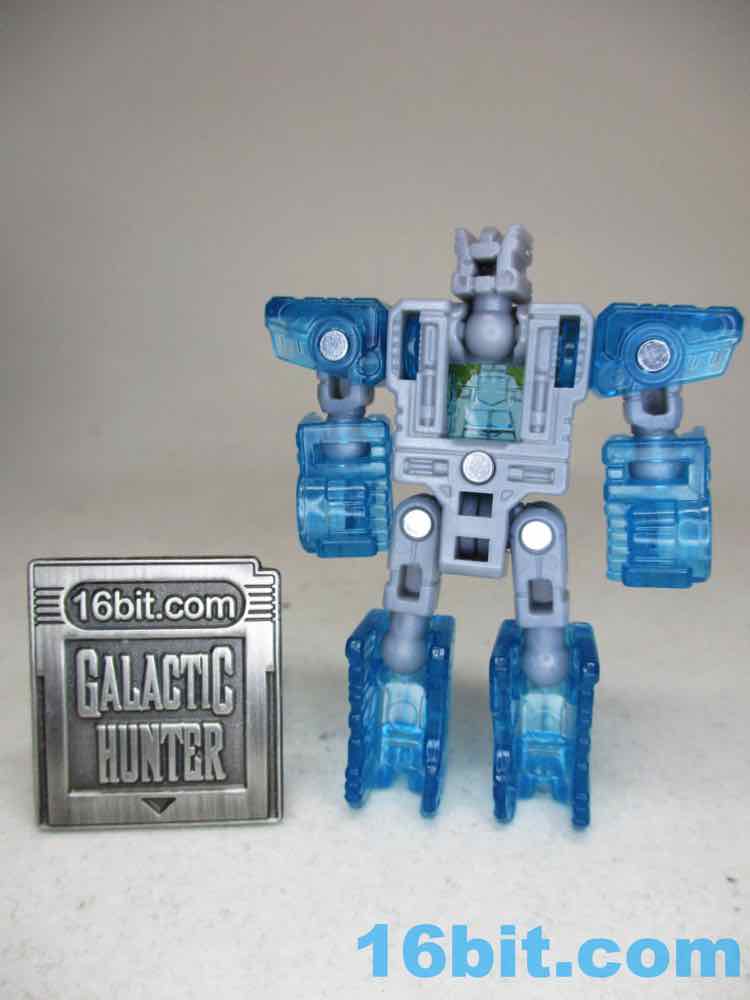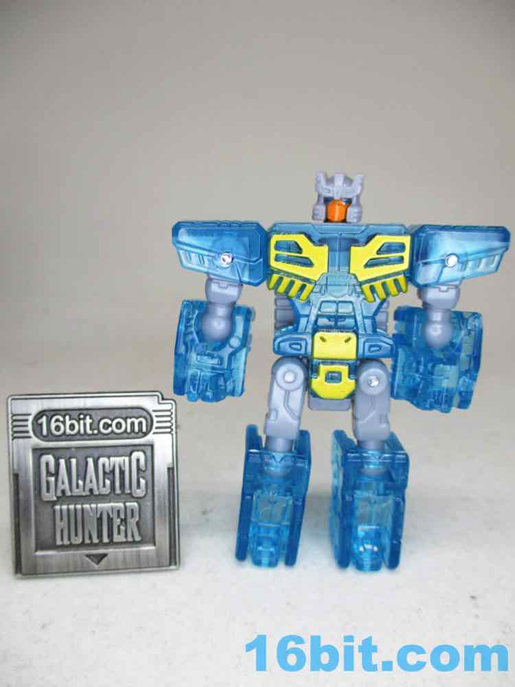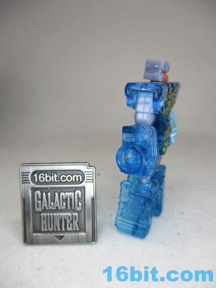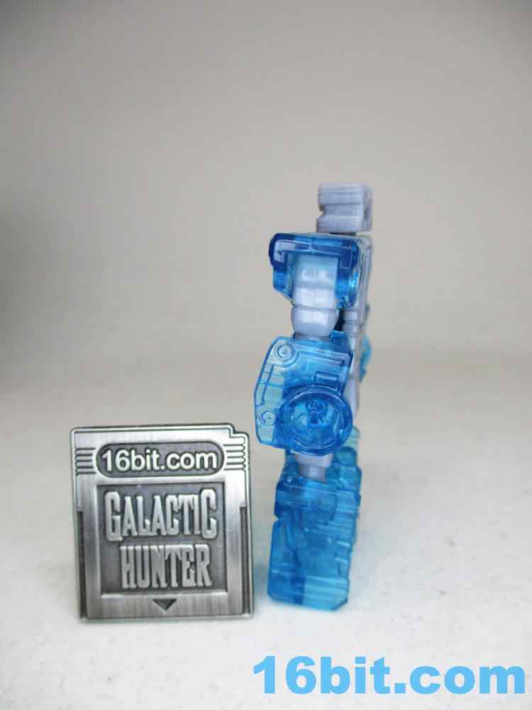 Joining him is a decidedly not-cartoon or not-toy Eject, cast in clear blue to match the quasi-Energon Weapon accessories packed throughout the line. The original Eject toy looked pretty close to this, but was opaque and had weapons you could plug in him. This Eject has the holes to plug in weapons, but there's no accessories yet - I hope some will come later, but it's more likely a fan will design an upgrade pack. Which is a pity, I think fans would be happy to re-buy this mold a few times in opaque blue, or black for Rewind, or pink for Rosanna. With 13 points of articulation, the little guy can turn into a box that fits in Blaster's chest quite nicely.