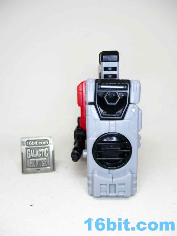 Transformation is absolutely way more complicated than it needs to be, but both modes are pretty great. The robot is an excellent pastiche of G1 Blasters, hewing toward the cartoon end of the spectrum. You can see that the legs turn into the speakers and the arms tuck in against the body, but it's bizarre and, at times, unpleasant. Contorting the arms just-so to get the unfolded legs to cover them is difficult thanks to some tight tolerances on the leg panels. There's also a second set of rotating speakers on the legs for reasons I don't understand. It adds visual complexity and more finger food to the toy's transformation, but doesn't really do anything to change things than if you just had a flat, non-moving part. You'll definitely feel like you're going to break something during the process, and I don't care for that very much.