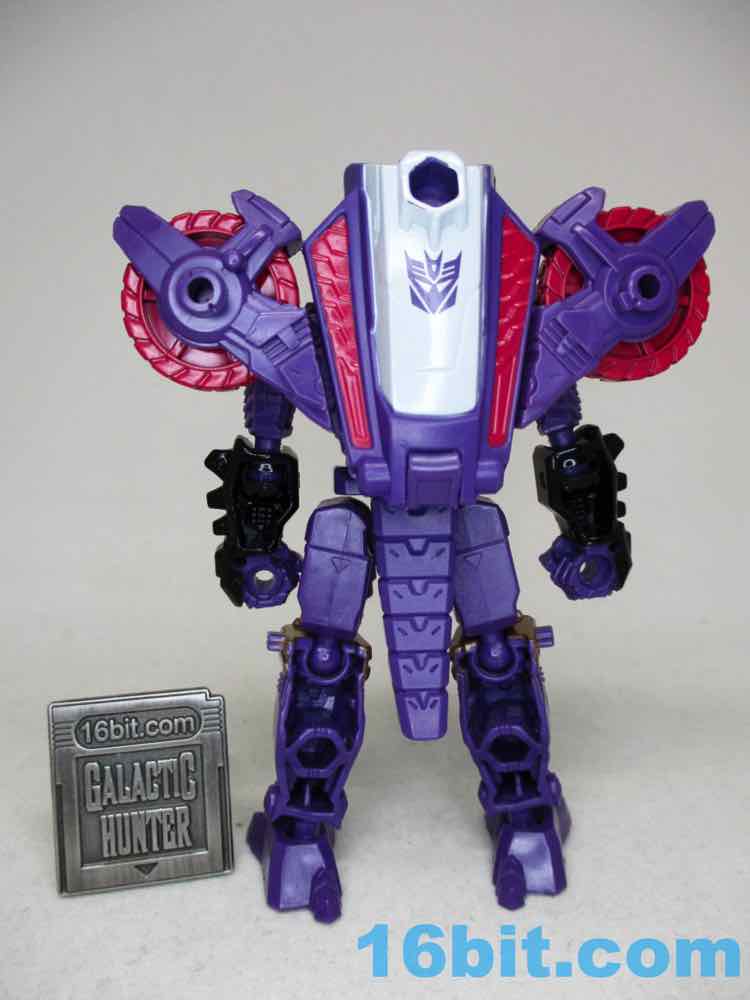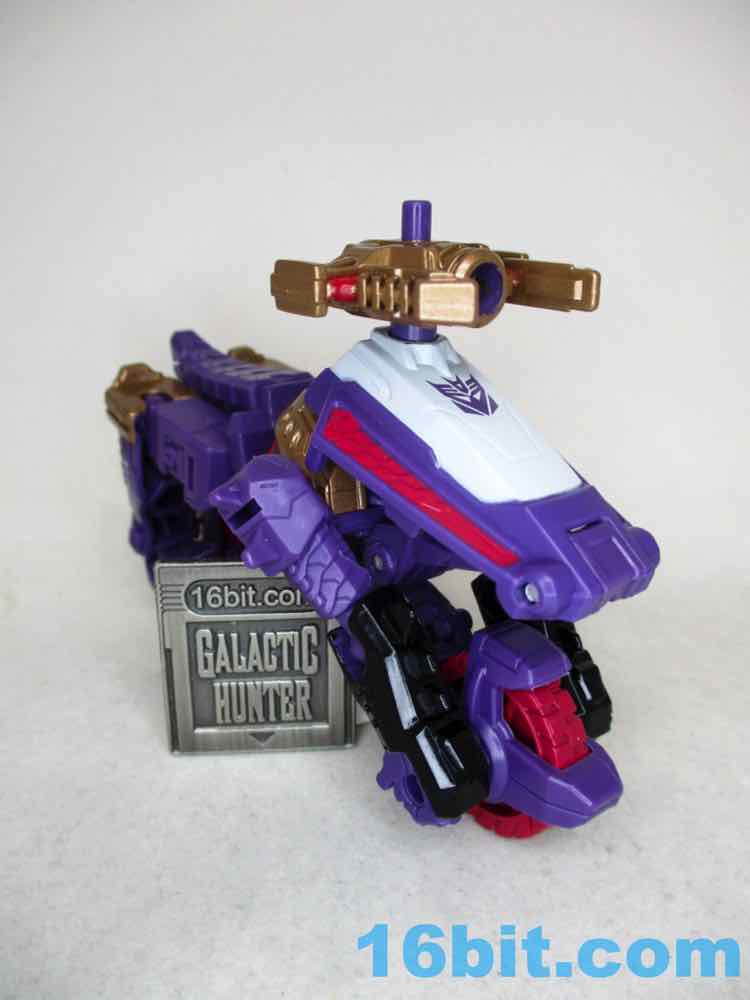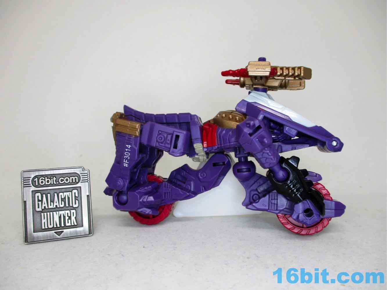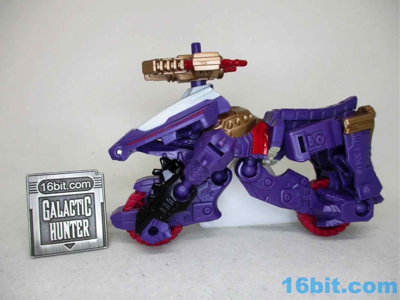 Transformation is somewhat tricky, but not impossible, thanks to big motorcycle chunks becoming a wheeled backpack. The arms become the front wheels, the tail becomes the back of the seat, and the legs are the back chunk of the bike. It works pretty well.