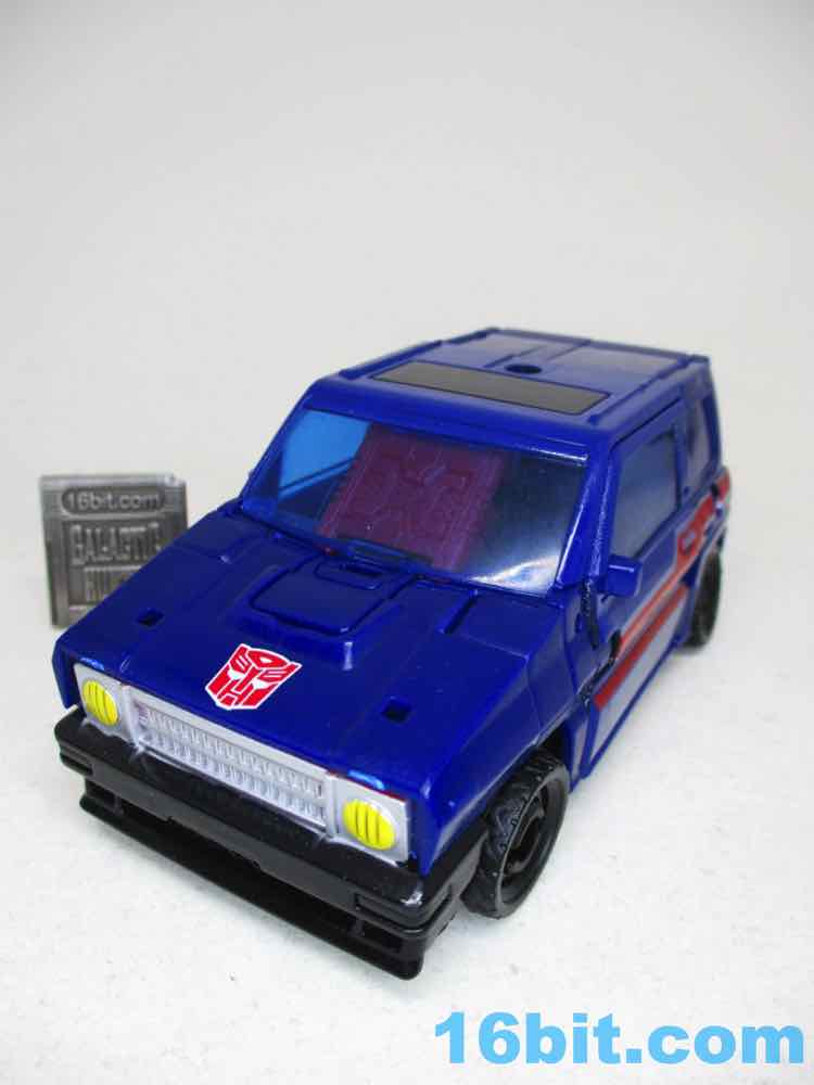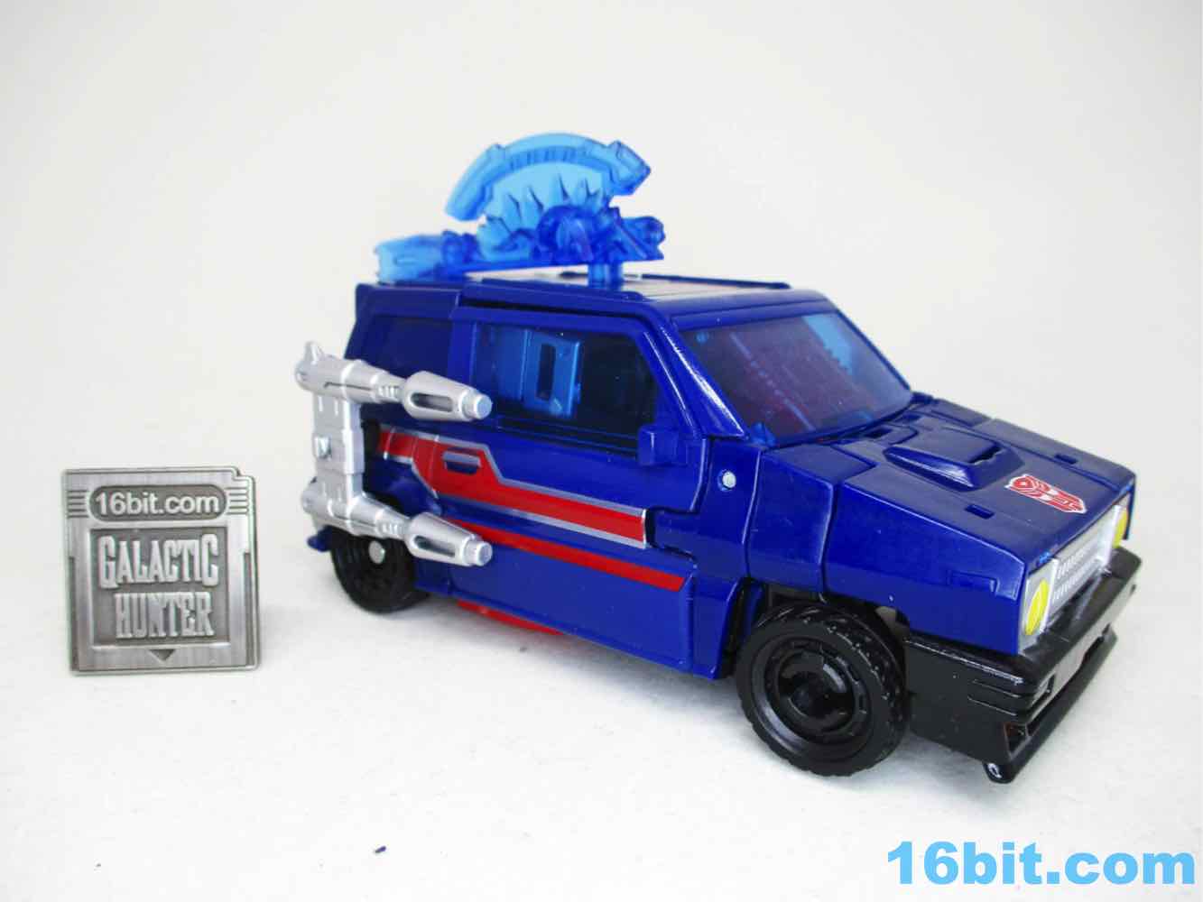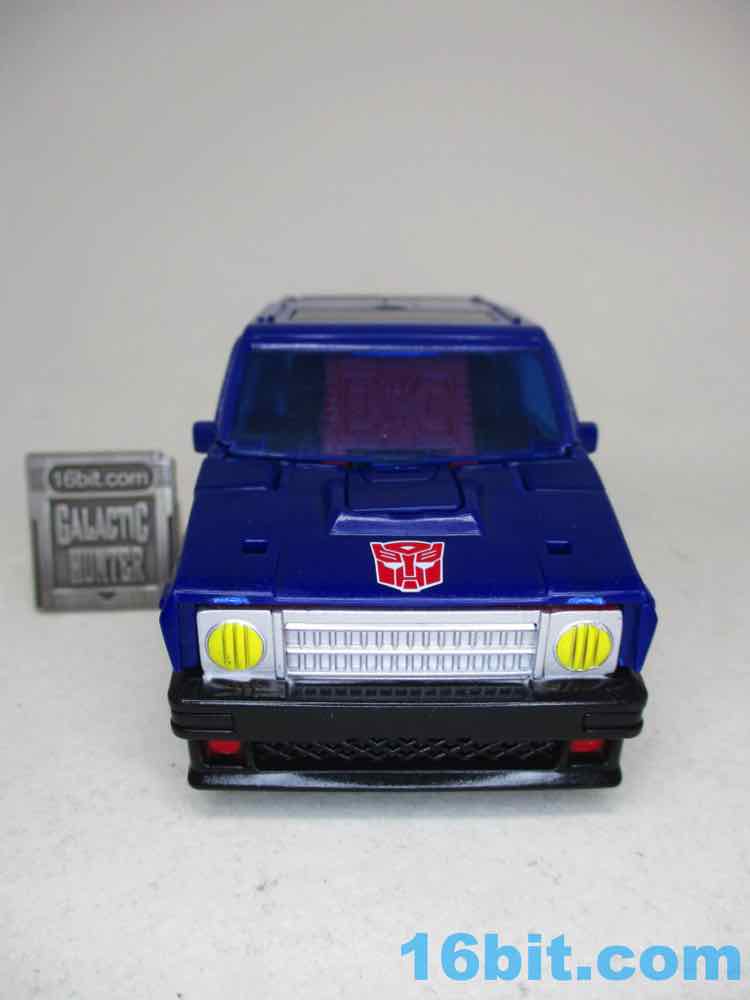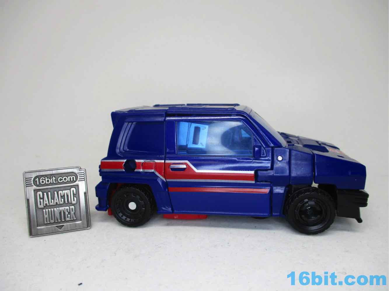 Other than the vehicle having unpainted wheels, the coloring and deco match the animation model pretty closely. It's a box on wheels, and there's even a 5mm hole in the roof for weapon storage. Also on the sides. Like most vehicle modes, it doesn't do much but I'm pleased it has onboard storage for all the accessories. The stripe is painted nicely, the clear windows are good, and some windows are just opaque plastic bits - such is life. This is pretty much the not-quite-1984 Skids you've come to expect from Hasbro these days.