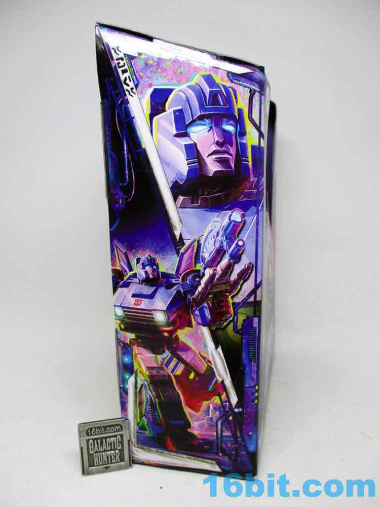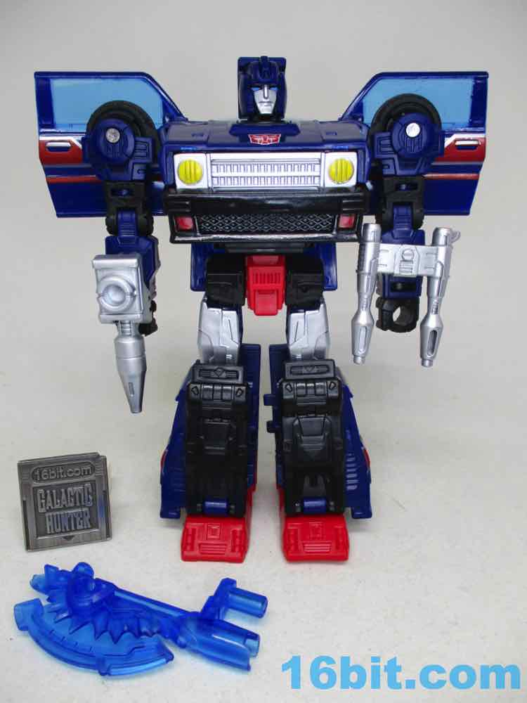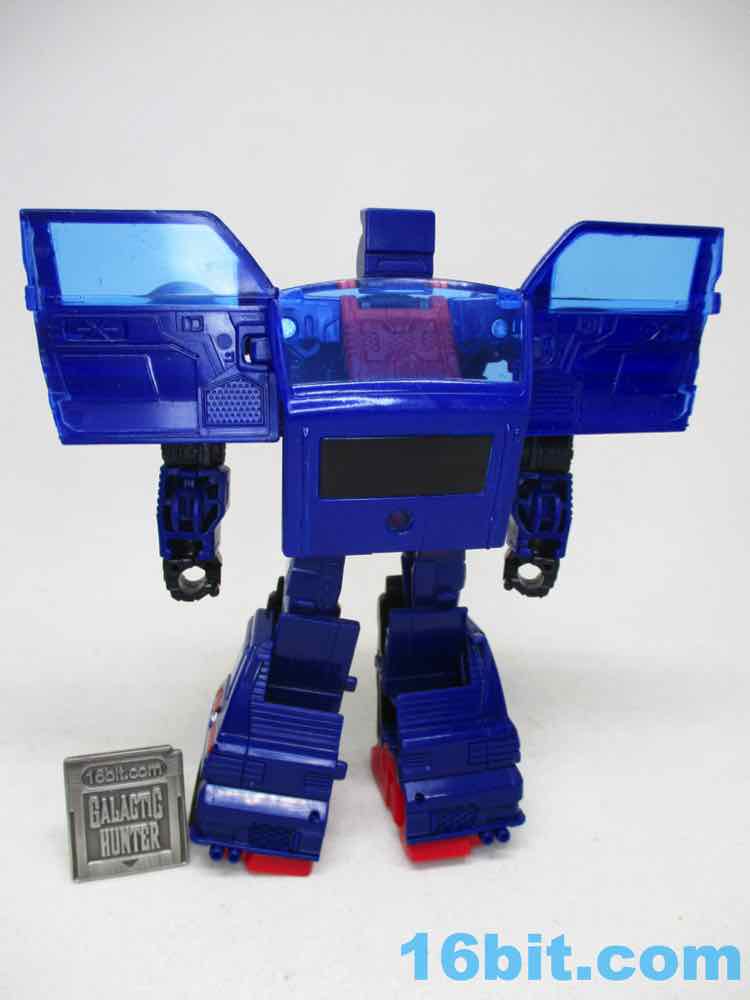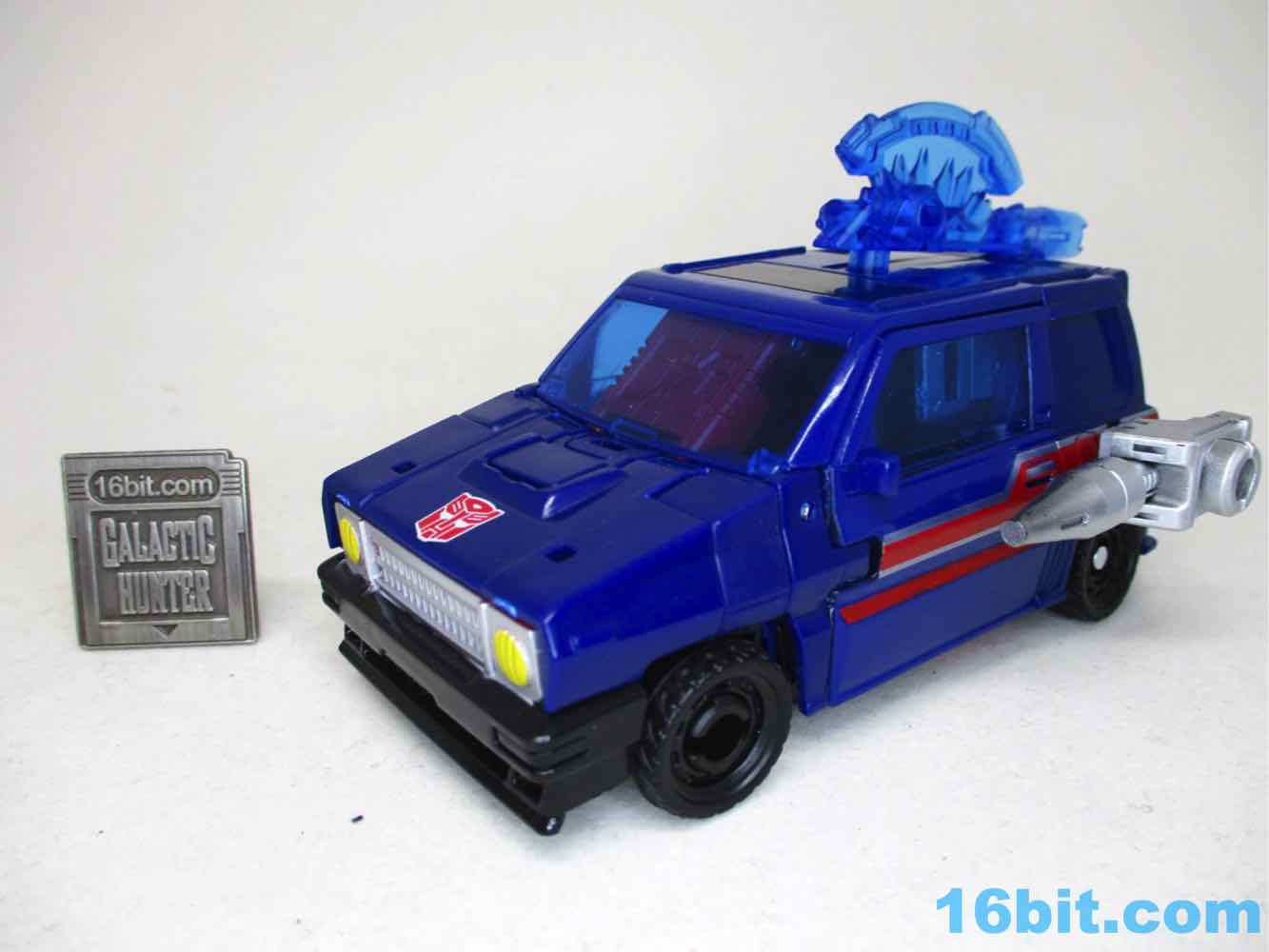 Other than the vehicle having unpainted wheels, the coloring and deco match the animation model pretty closely. It's a box on wheels, and there's even a 5mm hole in the roof for weapon storage. Also on the sides. Like most vehicle modes, it doesn't do much but I'm pleased it has onboard storage for all the accessories. The stripe is painted nicely, the clear windows are good, and some windows are just opaque plastic bits - such is life. This is pretty much the not-quite-1984 Skids you've come to expect from Hasbro these days.
