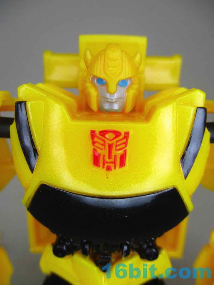As a robot figure, it stands, and the knees bend. But here's where it gets weird - the knees are telescoping ball joints. That means you have to tug outward on the knees during the transformation, which applies pressure to the ball-and-socket joint at the end of the knee, which causes the entire lower leg to pop off. It's a terrible joint for a kid toy, even as an adult you have to be weirdly careful to transform it without popping parts off, and that's the opposite of fun. If a kid got this Bumblebee as their first robot in disguise, I imagine they would be turned off of looking at more. Because Bumblebee is difficult to find in most toy lines, this could be a poor first impression. But as a collector, I think the head sculpt is neat, and the sculpted Autobot symbol on the chest is nice.