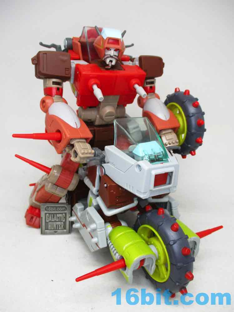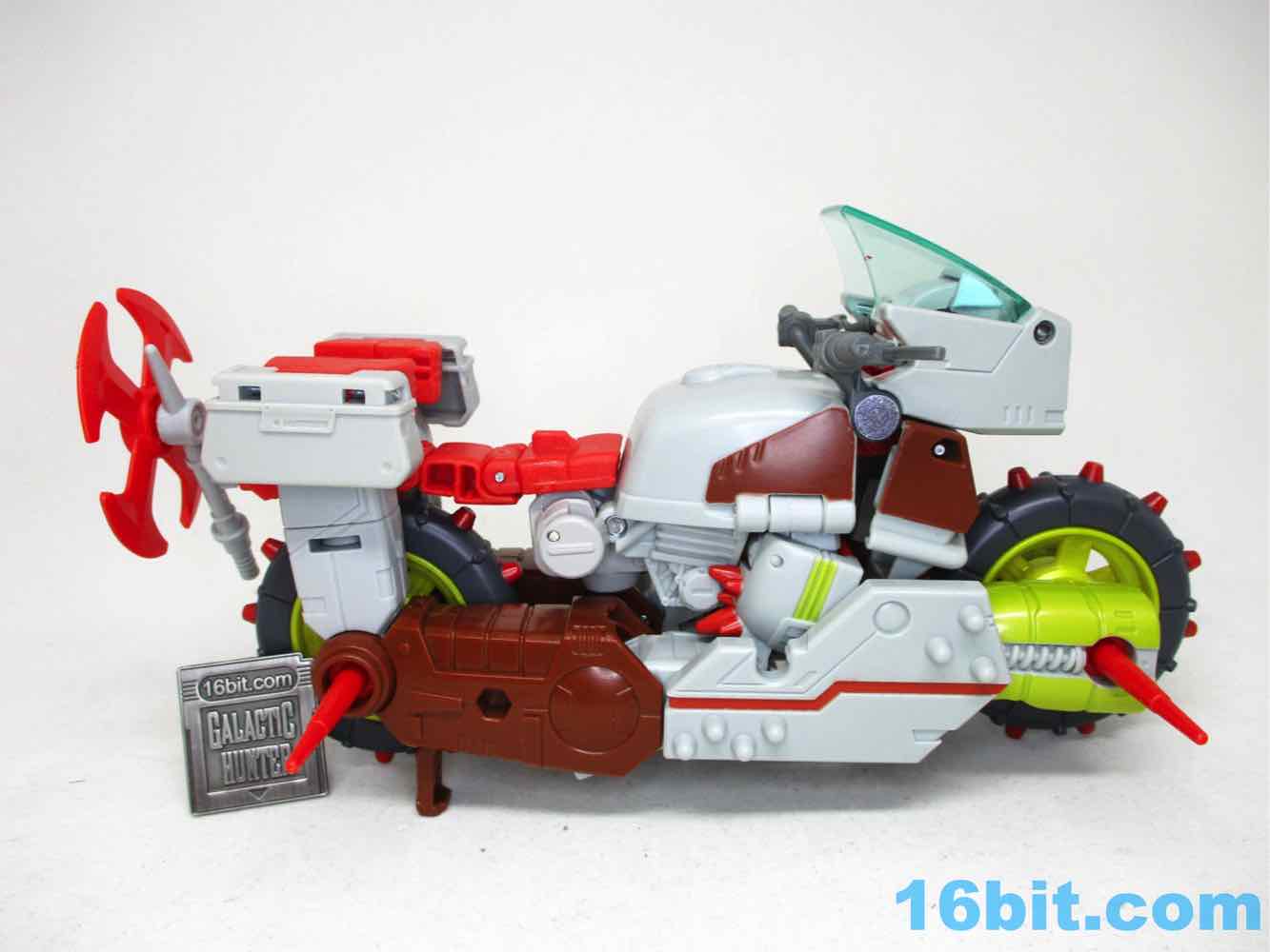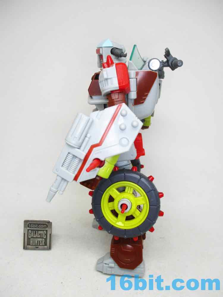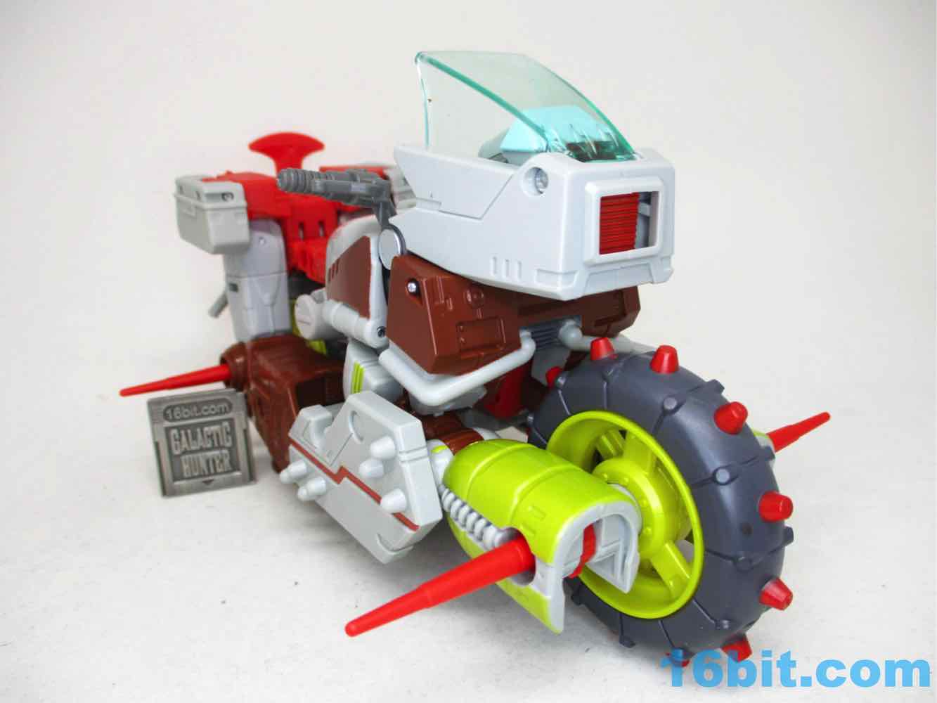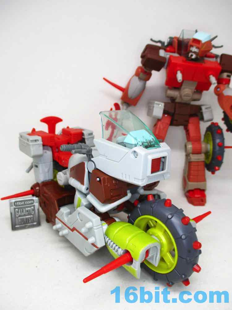 The bike looks very close to what we saw in Transformers: The Movie but it sin't perfect. The basic form factor is there, but things like his bike mode cannons are gone since the robot chest plate doesn't have guns, but the bike does - it worked out well for Wreck-Gar. The colors are pretty close, and the bike benefits from having a couple of kickstands tucked in the robot mode shins so it'll stay upright.