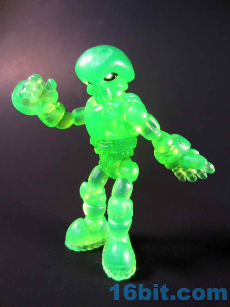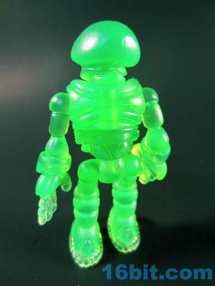 The 2 3/4-inch figure has 12 points of articulation, and pops apart at each one. You can swap hands and limbs and heads between Pheydens and other Glyos-compatible figures, which is pretty impressive given not many other toys have that kind of ongoing compatibility. LEGO and Playmobil and Hot Wheels all seem to fit together well over the years, but Barbie changes size, Imaginext had a few revisions, even Star Wars 3 3/4-inch figures aren't 100% compatible from the beginning, so it's nice to see. Most of the sculpted detail shines through niecly, letting you see the treads on the feet while he's standing in a dimly-lit room. The various segments of the arms pop nicely, and the lack of paint really lets the sculpted detail literally shine through on each part of the figure. With a little light behind the figure you can see his pockets and other sculpted elements, with the painted eyes appearing darker - but still visible.