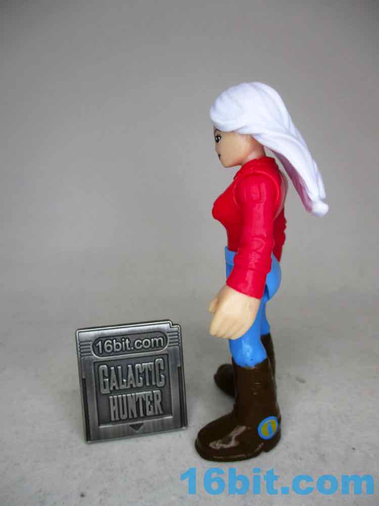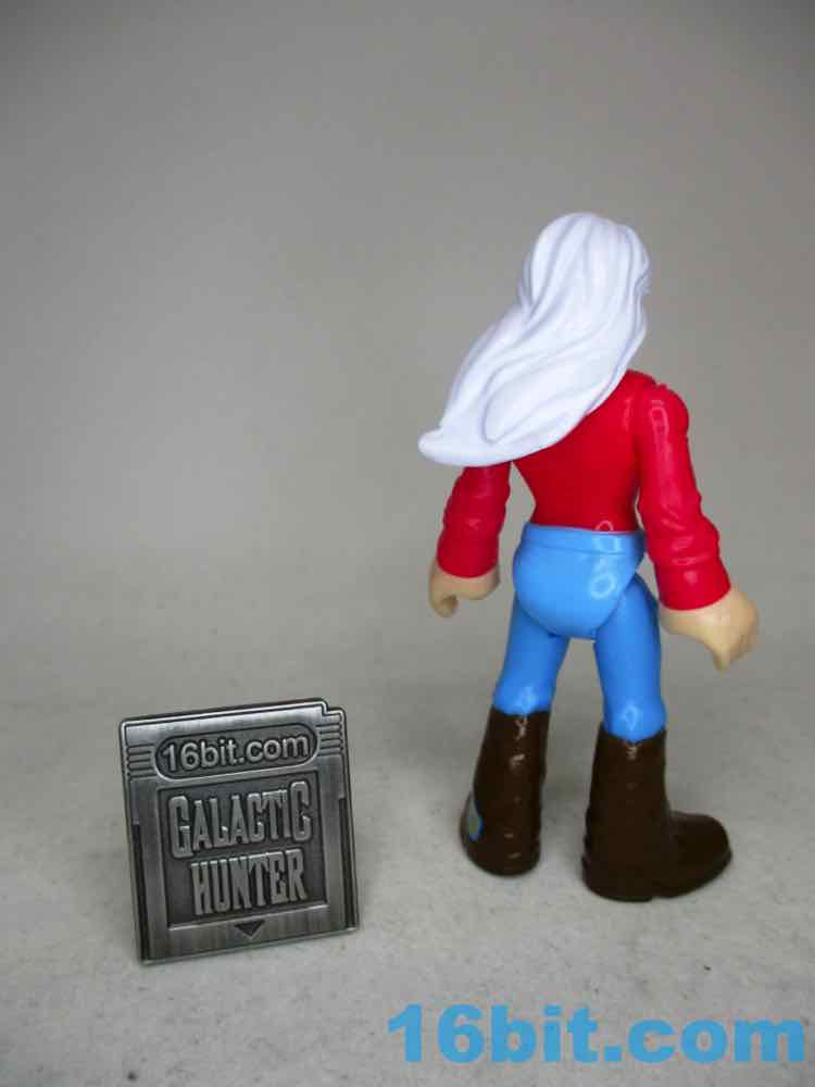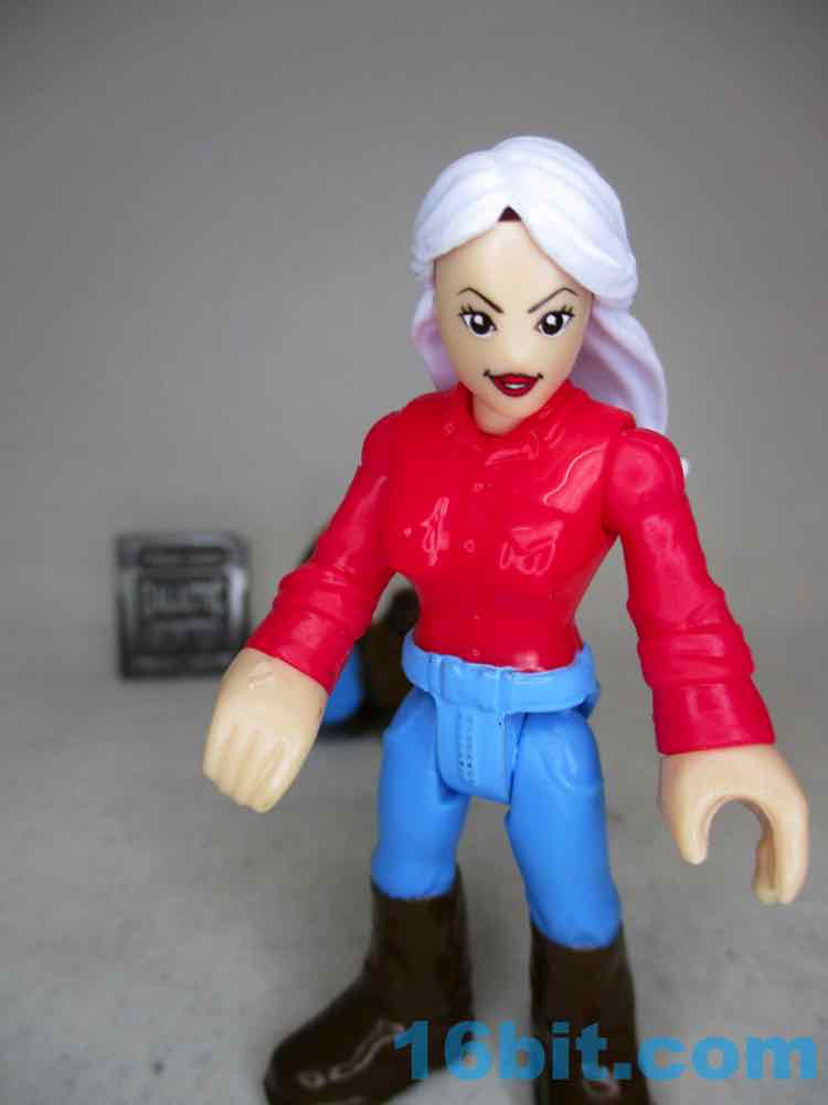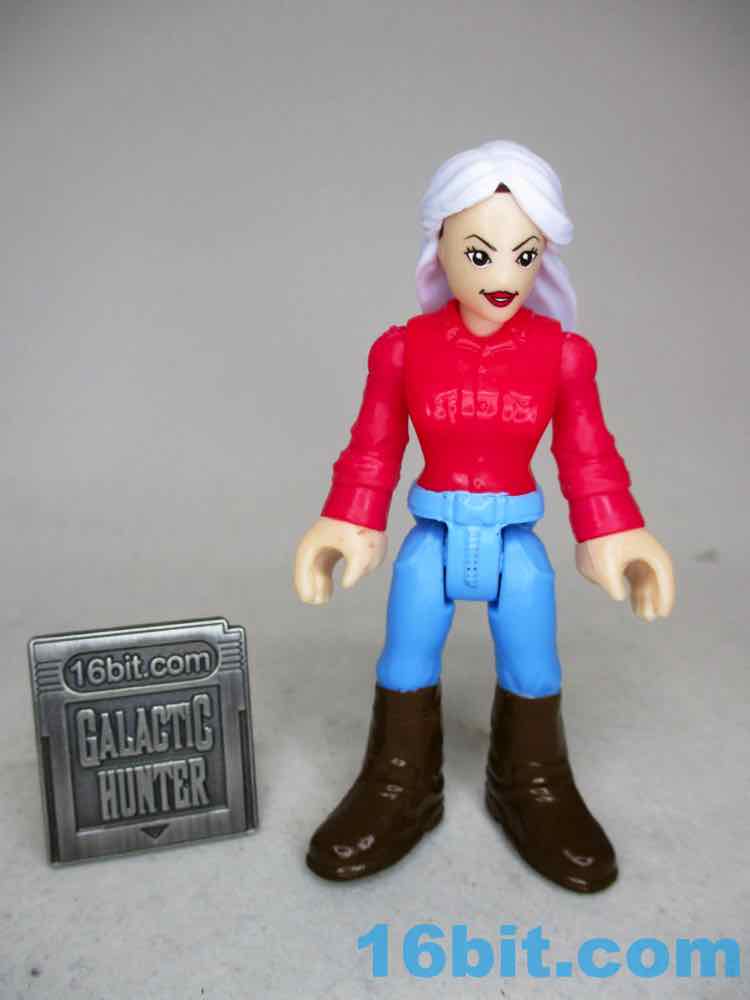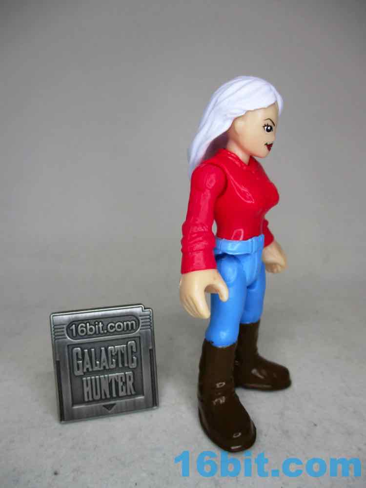 The 3-inch figure has no new parts - this series prided itself on using existing elements, which I assume was required to keep costs down. Back in 2019, a $3 action figure was effectively an impossibility. This one is pretty good for the money - she's got light gray or dark white hair, brown boots, a red shirt, and blue pants. The soles of her feet say "AMBLIN" on them, which is the giveaway that she has Speilbergian roots. My sample is a little back-heavy, with hair that doesn't seem like it was set exactly right - but for the price, she's still pretty neat. The limbs all swivel just fine, and she's something this line lacks. There are very few women, certainly few figures that read as middle-aged, and even fewer that aren't licensed or from extreme sports. It's just some lady. Maybe it's a mom figure? I can't say - but the solid colors look great and she seems like a retro figure if ever we got one. Unfortunately, there aren't a lot of places to put a modern, typical human person in this line - it's populated mostly by superheroes, monsters, and sports people. She's still cool, but she has no obvious home in a playset or vehicle.