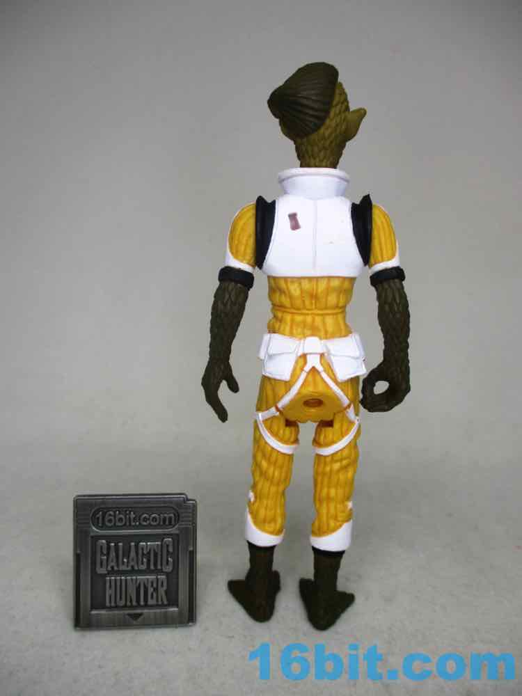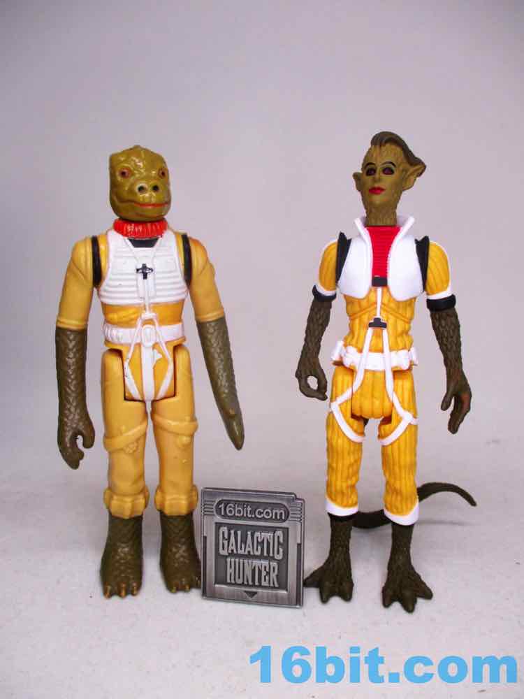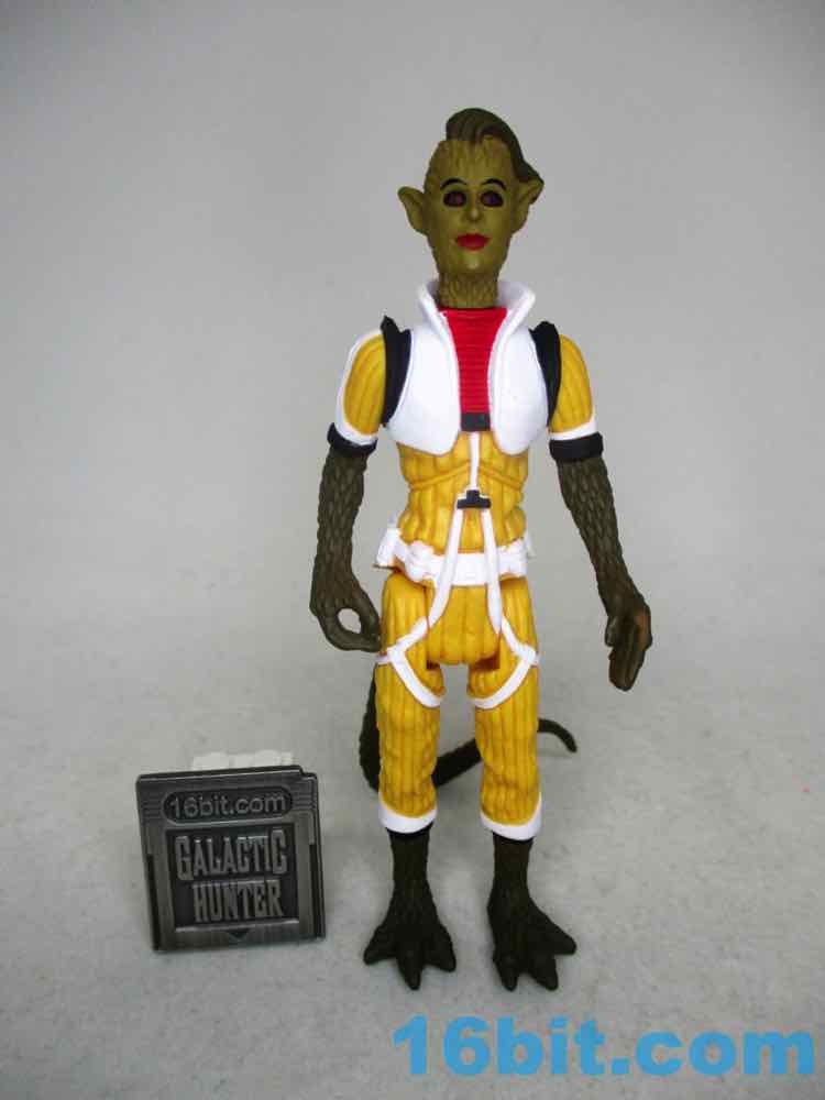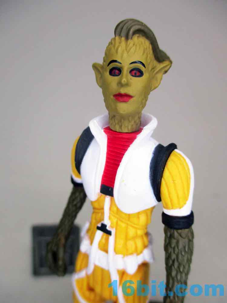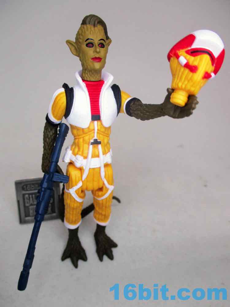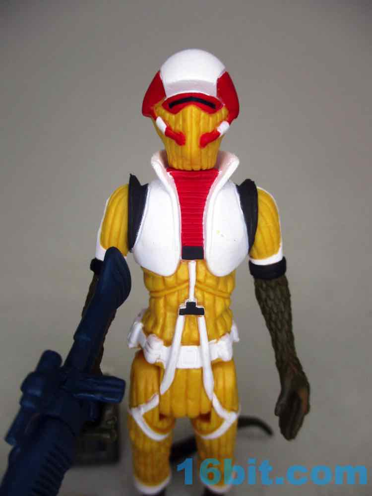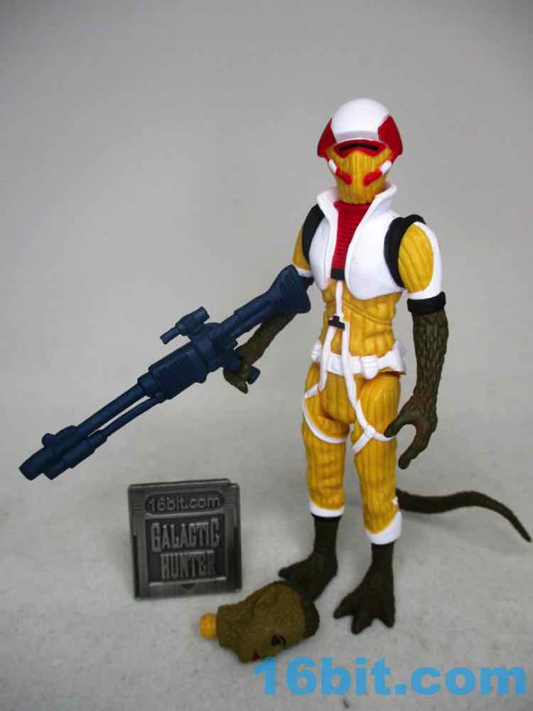The default head has a wonderfully severe undercut, red and black eyes, eyebrows, and red lips. The other masked head is yellow with a mask, plus a red and white helmet that looks like some of the modern Cloud Car Pilots - the original 1982 one lacked a white stripe and had something that was yellower. To match Bossk's rifle, this figure comes with a painted blue blaster.