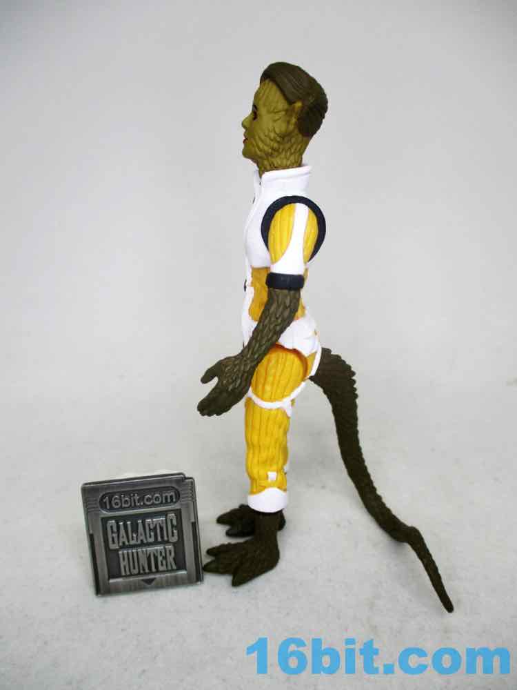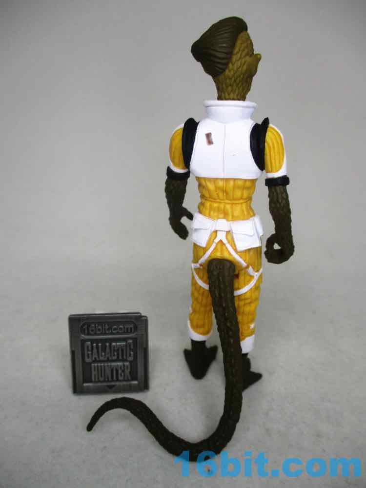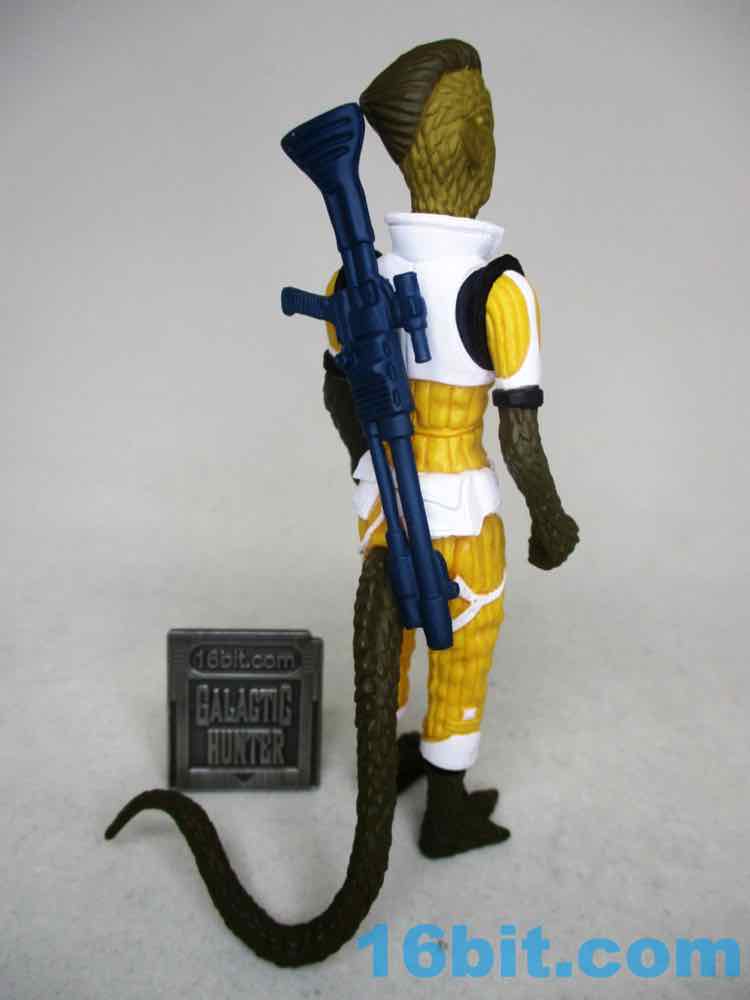 In this deco, the figure owes a debt to Kenner's The Empire Strikes Back release of Bossk - but improves on it. A lot of old Kenner figures had sculpted straps, buttons, patches, or other elements left unpainted because they were $2-$3 and you have to keep your profits. Healey needs no profits! Well some profits. The same mold we got in bare-ish glow blue or green, and a rainbow of other colors, is now molded in a mustardy yellow with white, black, and red accents. Note the thigh straps, the shin highlights, even the shoulder accents! The chest armor modeled loosely after Boushh is now white like Bossk's flightvest, and there are black shoulders and an ornament to recall Bossk's outfit. A red undershirt matches Bossk's collar, more or lses. Her painted skin is a bit darker than the Trandoshan bounty hunter, plus she has a swell tail also painted in skin tones. What I love about this is Healey Made's figure has a lot of deep grooves which look great, but when painted, those scales and corded pants really pop.