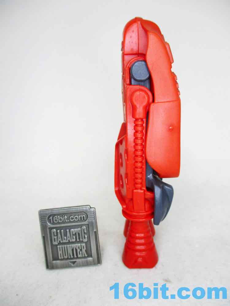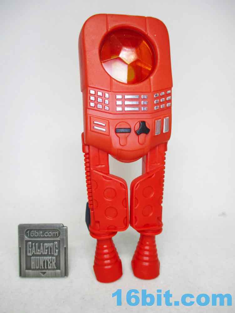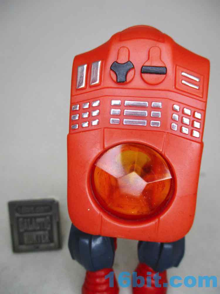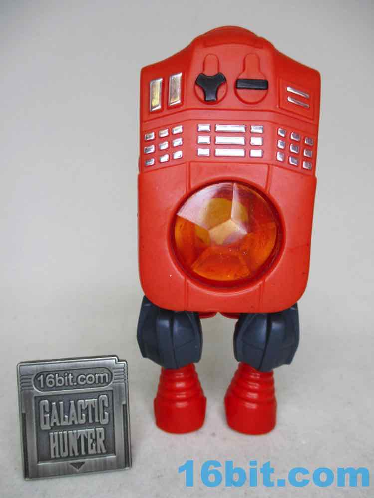 Like many figures of his era, it's light on paint. Loose samples typically have his silver and black buttons scuffed, which is why I went after a rough packaged version. The paint was perfect! There are 39 silver buttons and 2 black ones, and I'm trying to take care to not scuff them. That mirrored finish is tough for a toy that had to survive in a child's toy box, and I hope it won't flake off if I look at it funny. I don't know that they're meant to represent anything in particular, and the figure looks a lot like some of the chunky Tomy robots of his era. Or a calculator. It's fun, it's goofy, and when fully extended he's 4 1/2-inches tall.