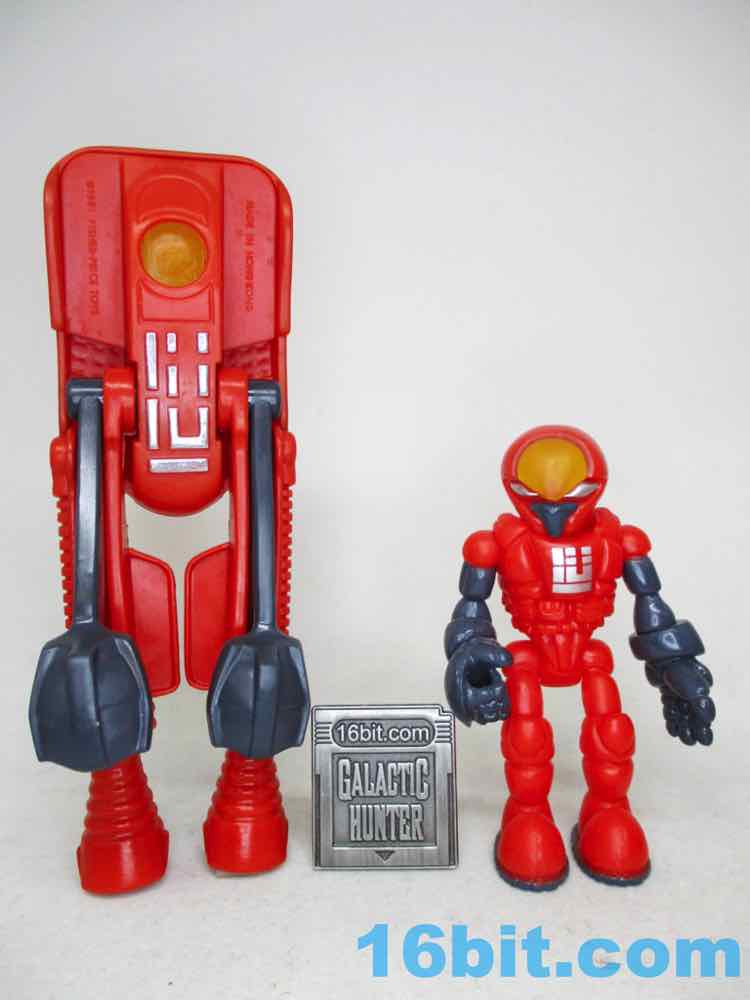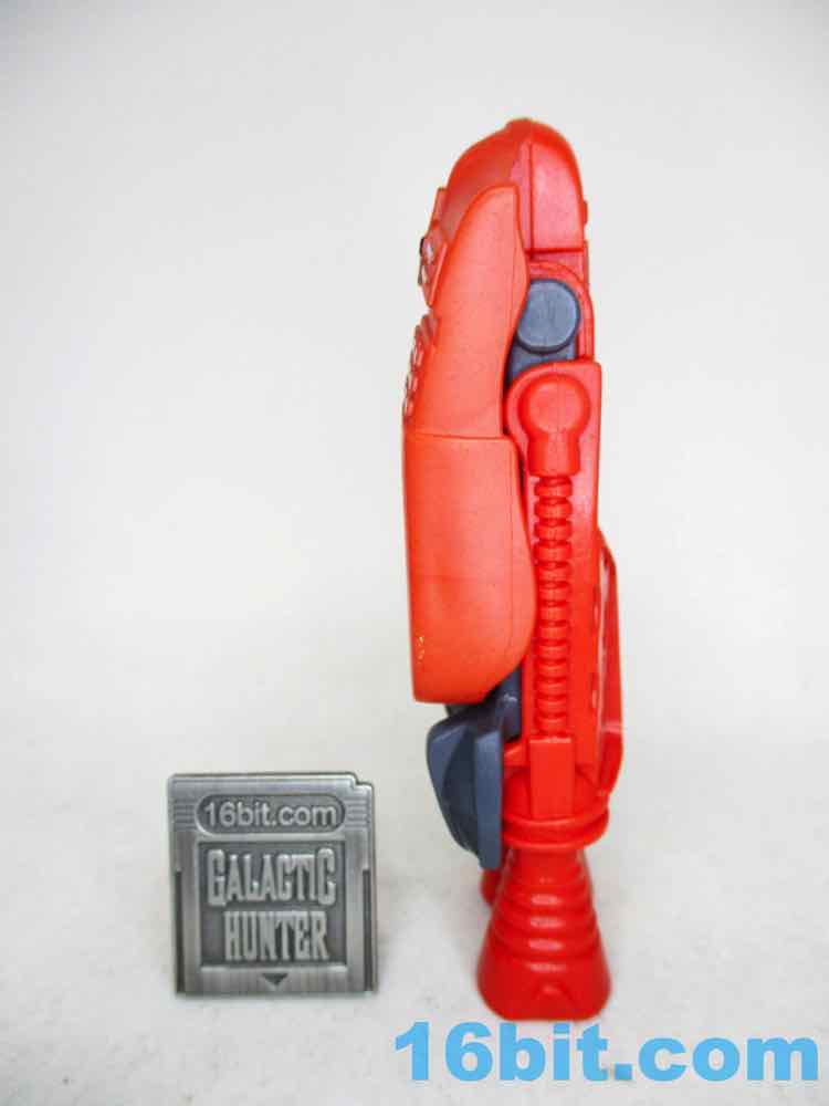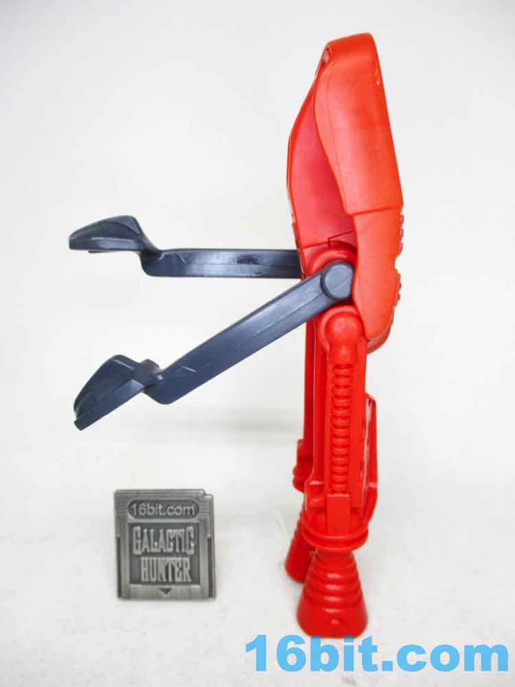 Despite being removed from a card and never touched by human hands, the limbs on mine are a tiny bit loose - they may sag with gravity when held up. Other figures I've seen tend to be tight for quite some time, so this was a surprise. The legs rotate fully, and the arms do too - this allows you to reconfigure the figure. He can't hold anything, he can't sit in anything, and he can barely stand without assistance - it's a truly weird robot. You're buying this guy because he looks cool, and because you have a grain of rice or some tiny shim to prop him up somewhere. The shorter configuration is a bit more stable on its own, but when clammed up he has no moving parts. When fully extended, you can move the arms up and down to work the controls of a playset or ship.