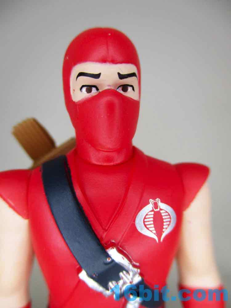 The red outfit is pretty uniform, with fleshy bits on the arms, hands, and around the eyes matching nicely. Black belts are decorated with silver painted weapons and a Cobra logo, plus on-board storage for swords on his back. It's a tight fit to store those swords, but they fit in his hands perfectly. The same can be said for the bow - it look wonderful, but it has no back storage. At least he can hold it well.