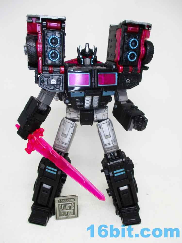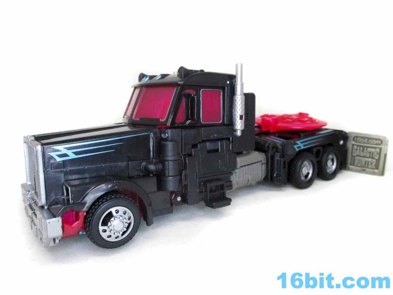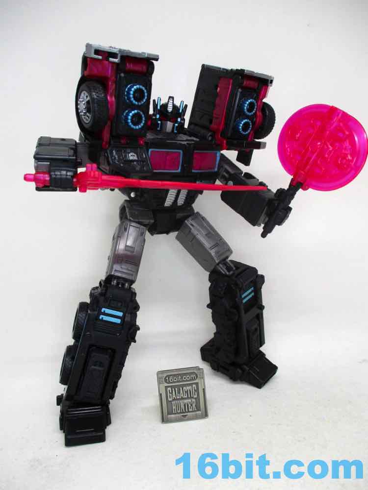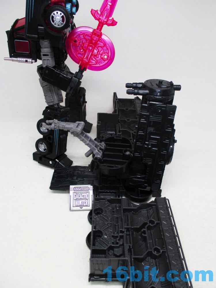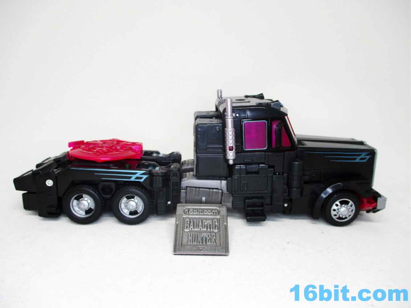 His truck mode is a truck. It will not impress, but it's good enough to say Hasbro did a nice job with it. I like the teal pinstriping, the silver wheel covers, and a pink that's so pink I'm sure Stuart Semple would want to keep it away from Anish Kapoor. (That's for you paint people in the back.) The front wheels don't roll freely, and the back ones don't roll much. It's not a very fun toy truck, but it's been quite a while since we've gotten truly fun vehicle alt modes for these things. What you're buying is a super-poseable robot with a shelf-ready vehicle mode, and most likely you won't transform it more than once or twice because you'll want to keep the robot mode out for the world to see. And you'd be right to do this. Hasbro did a nice job painting it to look like Scourge, and I would say the truck mode looks more like the original toy than the robot mode.