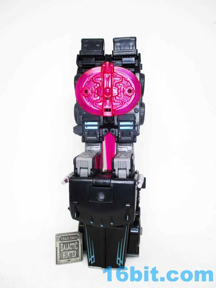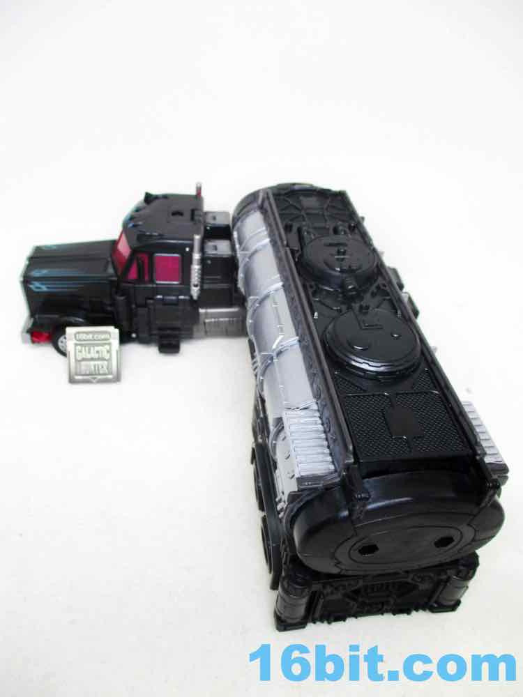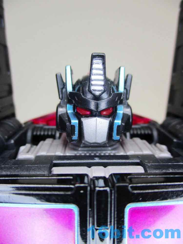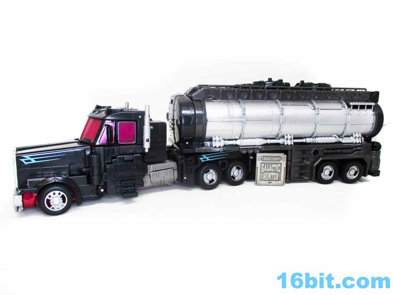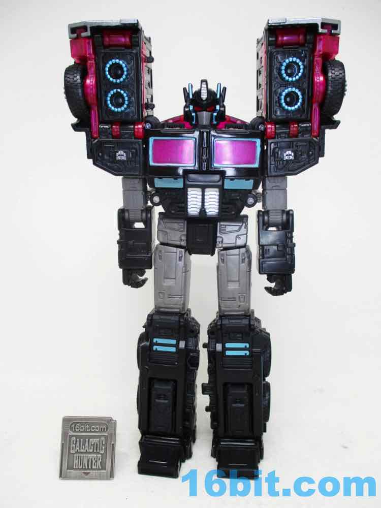 His truck mode is a truck. It will not impress, but it's good enough to say Hasbro did a nice job with it. I like the teal pinstriping, the silver wheel covers, and a pink that's so pink I'm sure Stuart Semple would want to keep it away from Anish Kapoor. (That's for you paint people in the back.) The front wheels don't roll freely, and the back ones don't roll much. It's not a very fun toy truck, but it's been quite a while since we've gotten truly fun vehicle alt modes for these things. What you're buying is a super-poseable robot with a shelf-ready vehicle mode, and most likely you won't transform it more than once or twice because you'll want to keep the robot mode out for the world to see. And you'd be right to do this. Hasbro did a nice job painting it to look like Scourge, and I would say the truck mode looks more like the original toy than the robot mode.