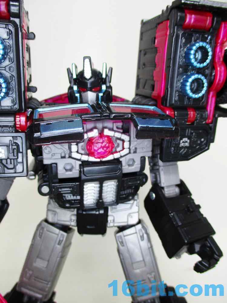 But, unfortunately collectors don't experience joy - they want "challenges" and "super-articulation," which can get in the way of fun. 2022 Scourge is still a big boy, with lots of teal and pink. The articulation is impressive, but the big shoulder pylons don't rotate like the original toy - the arms inside can, though. There are new elements like rocking ankles, a Matrix inside the chest, and rocket boosters that fold down on the figure's back. It's clever - Hasbro and Takara-Tomy engineered a lot of fun play (or really, display) features into the mold. The shoulder pylons have 5mm teal circles that can hold C.O.M.B.A.T. effects, or flip up to reveal blisteringly bright pink rocket launchers. They're non-functioning, but they're gorgeous. The clear plastic was also used for Scourge's false window chest, which flips up to reveal a silver and pink redeco of the Matrix of Leadership. The figure's head has bright teal lines, silver elements, and light-up pink eyes - I love it. It's great. It's not quite as bright (or gray) as the original release, but it's colorful and chipper for a black redeco.