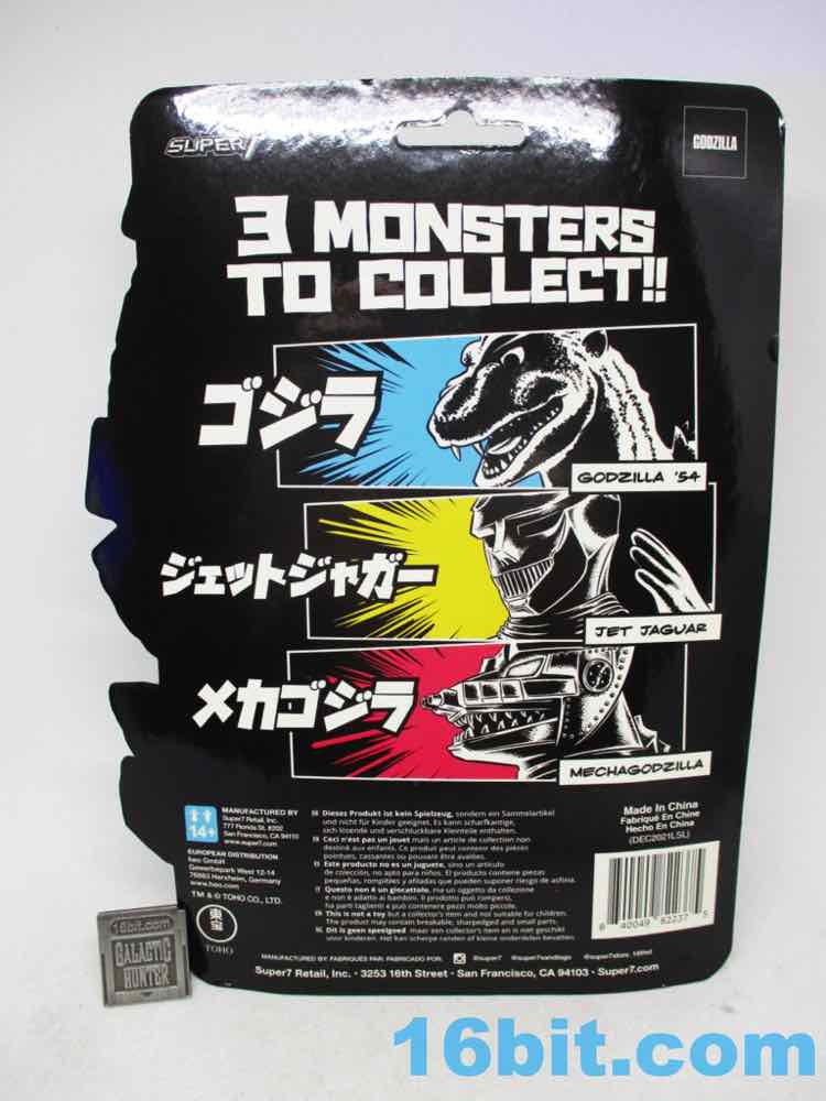 The packaging is also gorgeous, as are most of Super7's special figures. You get nice line art with black ink, a newsprint color, and blue spot color - it's really stunning and would probably make a great poster. And of course, I opened it, because I have zero respect for such things. It's a great little monster figure for the price and, of course, you can get the Ultimates! figure for a little bit more. But I don't need something huge. The glow quality is excellent, about on par with or just a little dimmer than the best the Onell Design factory's Glyos output has to offer. For a non-indie glow toy this is one of the better ones, so if you can still find one for sale, go ahead and get it. And hopefully we'll see a few more to join the big guy, Jet Jaguar, and Mechagodzilla.