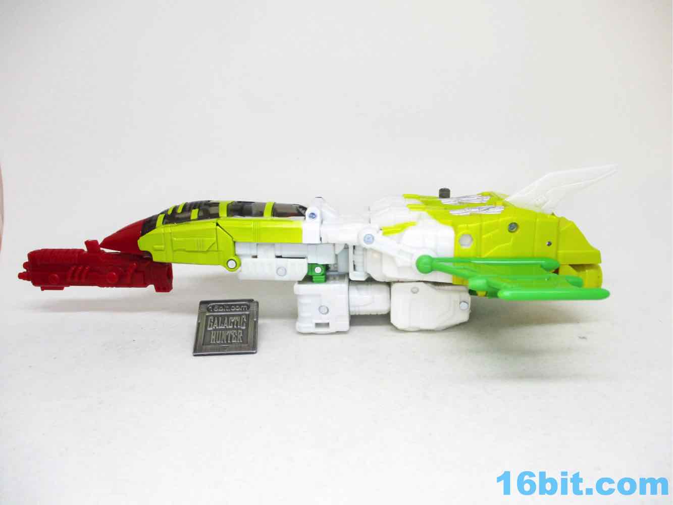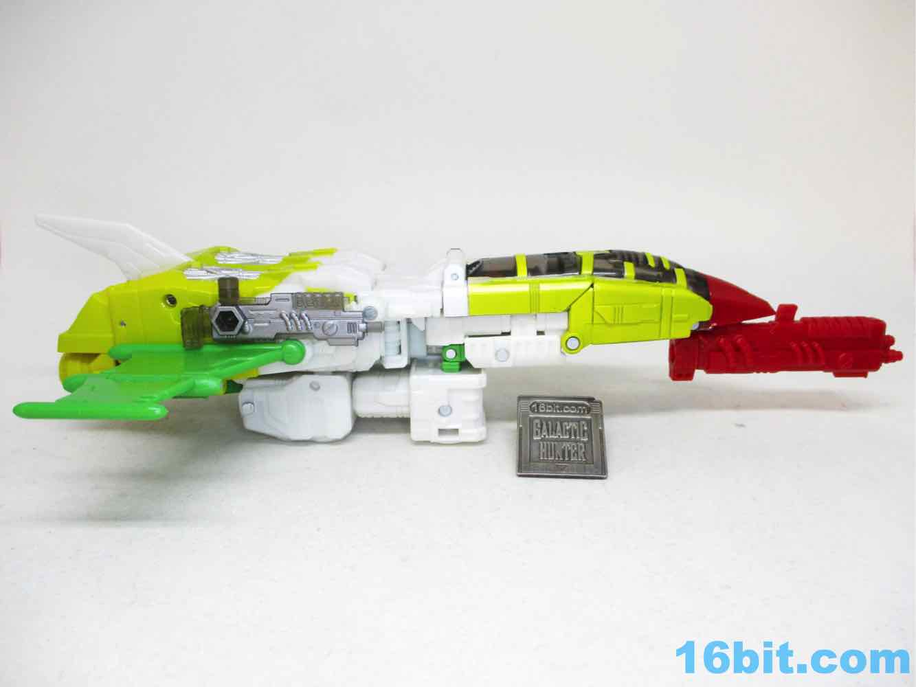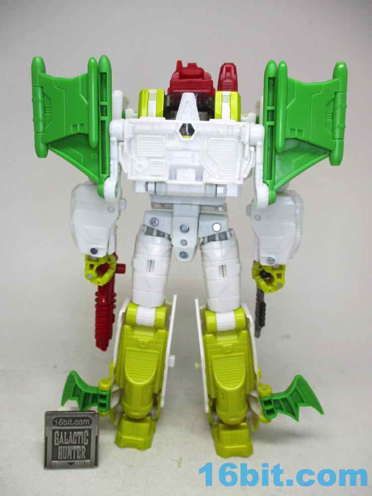 Articulation is good for a Voyager - heck, it's good for a Leader these days. You get opening fingers, swivel wrists, and about 26 points of articulation which makes him slightly better than the average 7-inch tall robot. Seemingly derived mostly from the comics - but maybe from the main image on TFWiki page - the figure is about as good of a replica of 2D art as a real 3D toy as you can hope to get. The jet chest is a little different thanks to some missing yellow outlines on the canopy, but otherwise it's pretty good. The toy has a G2 Cybertronian symbol that the comic didn't have, but otherwise it's totally the comic character colors. The head has the same weird scrunchy face, the treen wings are there, the silver shins are present, and the round, tubey legs are there. The sculpt isn't too detailed, and it does a decent job matching the major panels in the comic without overdoing anything. You'll love the targeting mechanism on the shoulder, you'll appreciate the folding green back bat-wings, and I assume you won't mind that the colors take zero liberties. Someone at Hasbro and/or Takara-Tomy said "we're going to make it right this time," and totally did. There are some extraneous 5mm ports on the arms and soles of the feet, but other than that, I don't think you'd be able to squeeze a significantly better figure out of another toy. A Masterpiece Edition would probably just cost more and be unnecessarily complicated, and a non-transforming toy would cost about as much but offer no additional features. This, as the comic cover said, is not your father's OldsmobileAutobot G2 toy.