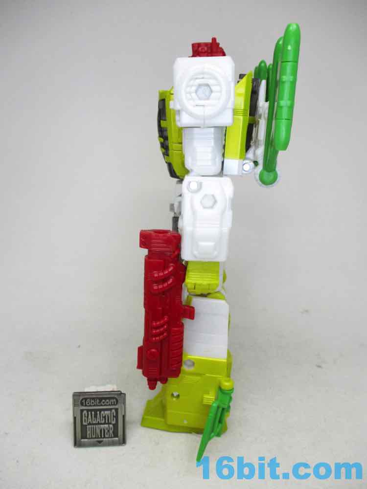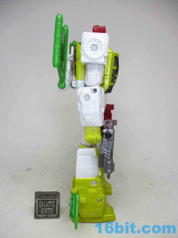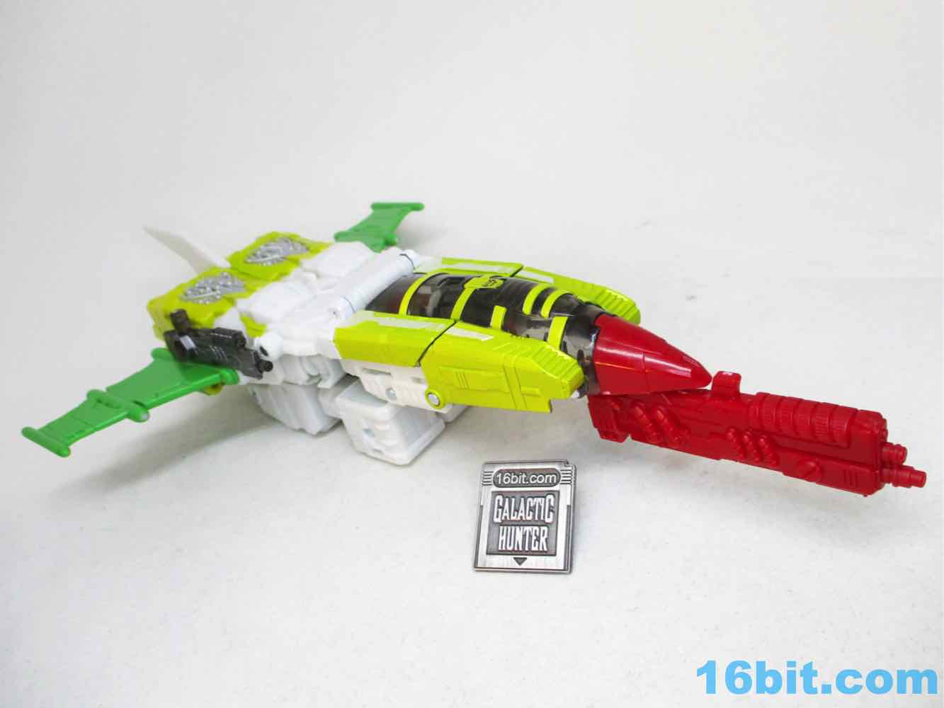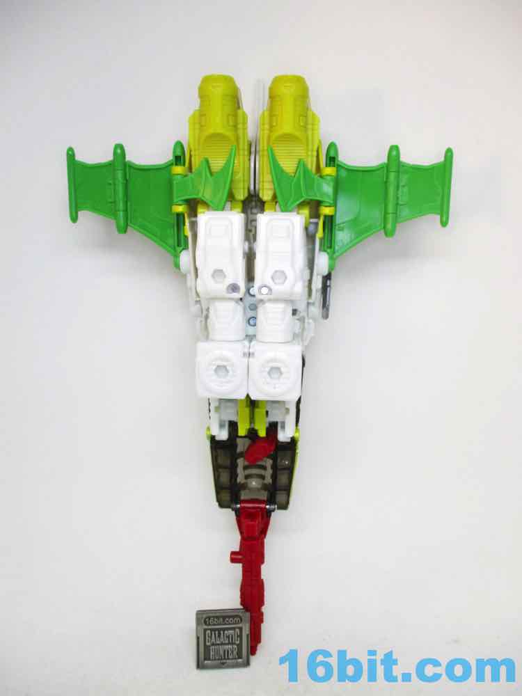 Articulation is good for a Voyager - heck, it's good for a Leader these days. You get opening fingers, swivel wrists, and about 26 points of articulation which makes him slightly better than the average 7-inch tall robot. Seemingly derived mostly from the comics - but maybe from the main image on TFWiki page - the figure is about as good of a replica of 2D art as a real 3D toy as you can hope to get. The jet chest is a little different thanks to some missing yellow outlines on the canopy, but otherwise it's pretty good. The toy has a G2 Cybertronian symbol that the comic didn't have, but otherwise it's totally the comic character colors. The head has the same weird scrunchy face, the treen wings are there, the silver shins are present, and the round, tubey legs are there. The sculpt isn't too detailed, and it does a decent job matching the major panels in the comic without overdoing anything. You'll love the targeting mechanism on the shoulder, you'll appreciate the folding green back bat-wings, and I assume you won't mind that the colors take zero liberties. Someone at Hasbro and/or Takara-Tomy said "we're going to make it right this time," and totally did. There are some extraneous 5mm ports on the arms and soles of the feet, but other than that, I don't think you'd be able to squeeze a significantly better figure out of another toy. A Masterpiece Edition would probably just cost more and be unnecessarily complicated, and a non-transforming toy would cost about as much but offer no additional features. This, as the comic cover said, is not your father's OldsmobileAutobot G2 toy.