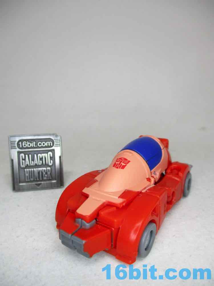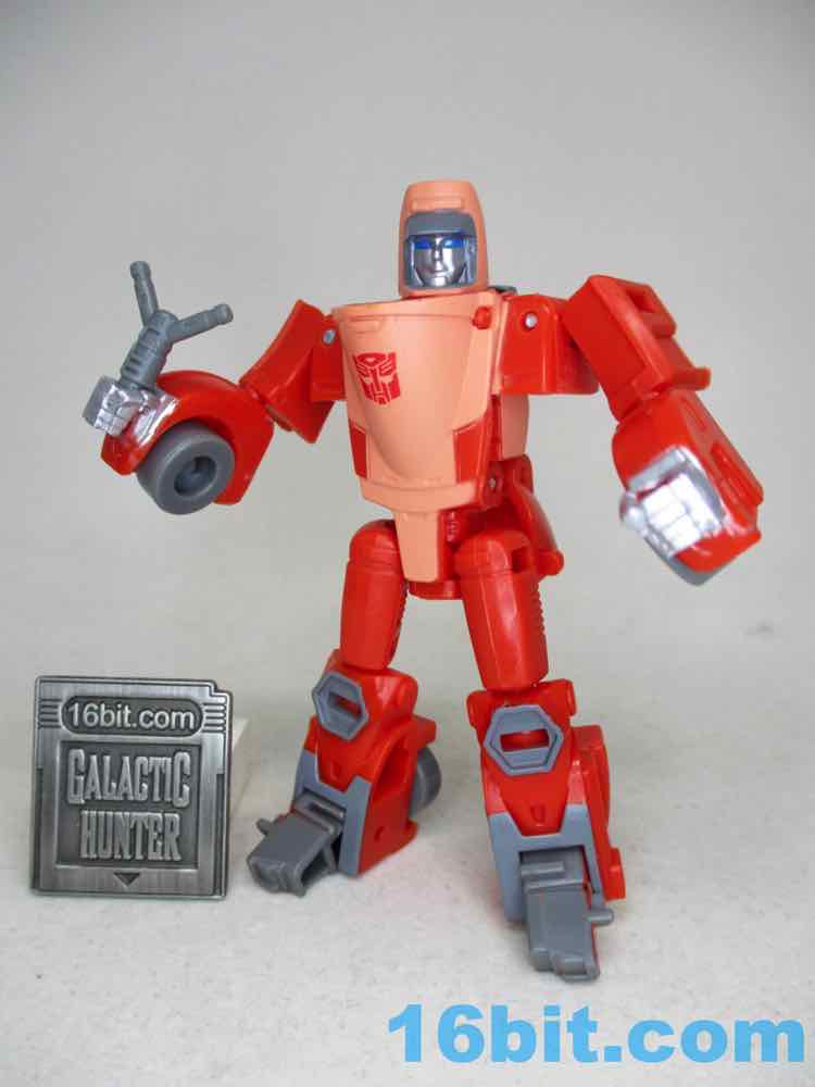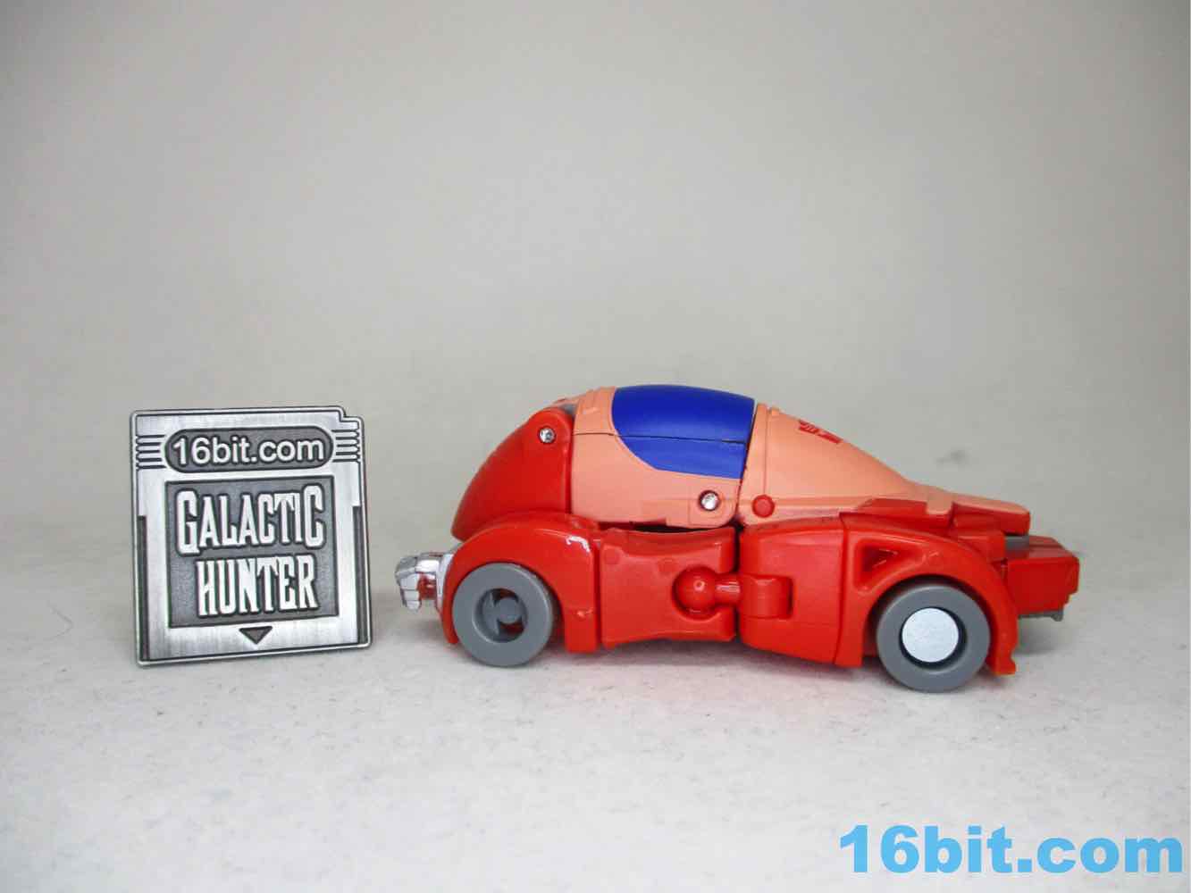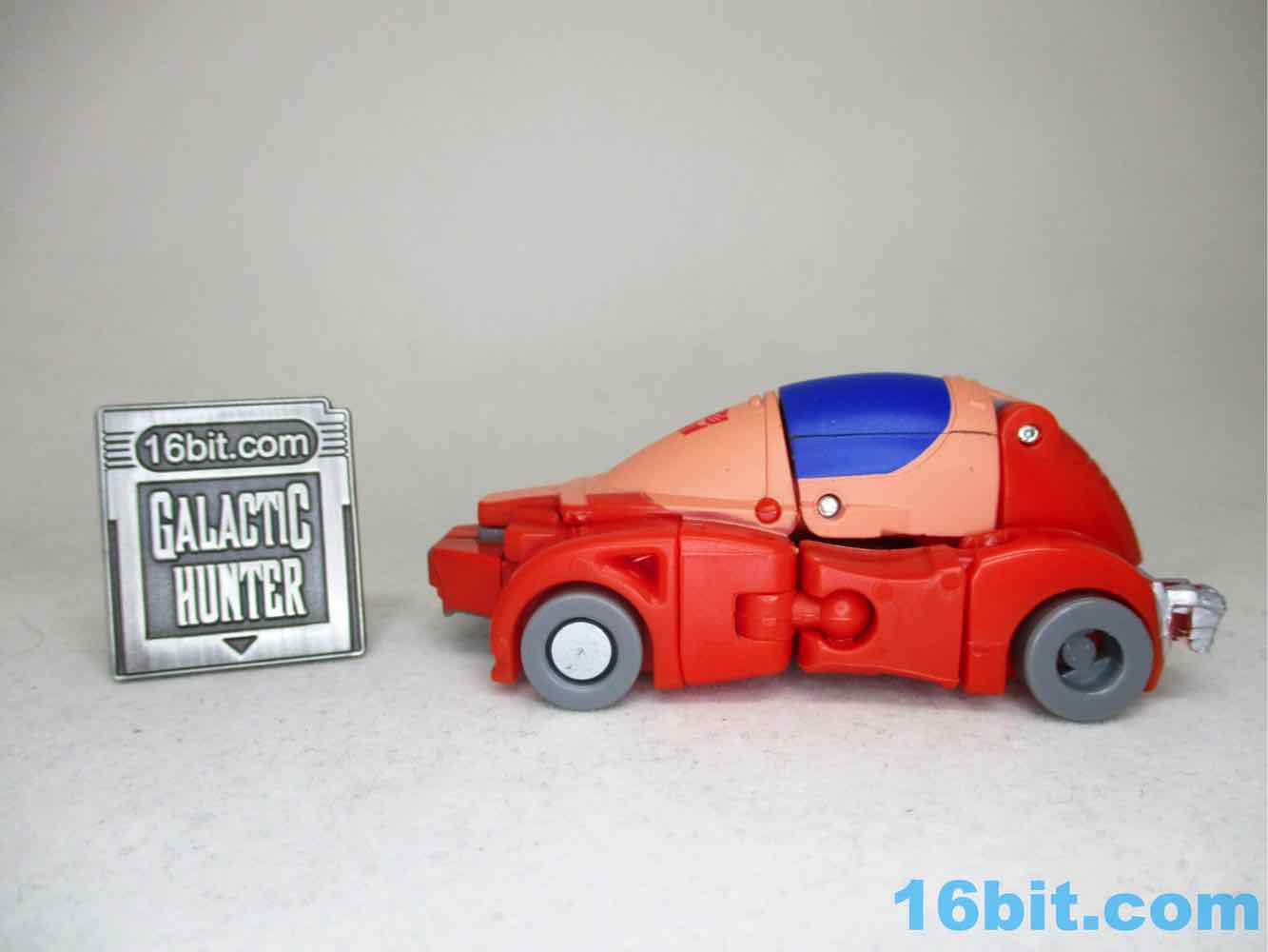 At 3 1/4-inches tall, he's surprisingly good. With just over a dozen points of articulation, this is basically a good robot action figure that turns into an acceptable Wheelie car - if you want the best one, get the original toy. But if you want the best cartoon-accurate robot, go buy this one. The included slingshot fits perfectly in the hands, and he feels sturdy in a way that Titans Return Wheelie didn't. I love the painted helmet, the silver face, the blue eyes, giving the kid robot the look you saw in the cartoon.