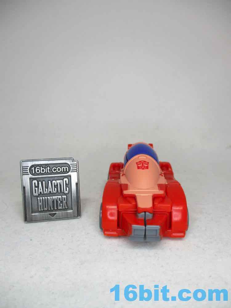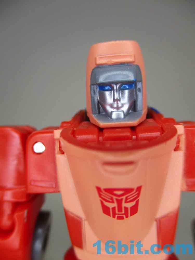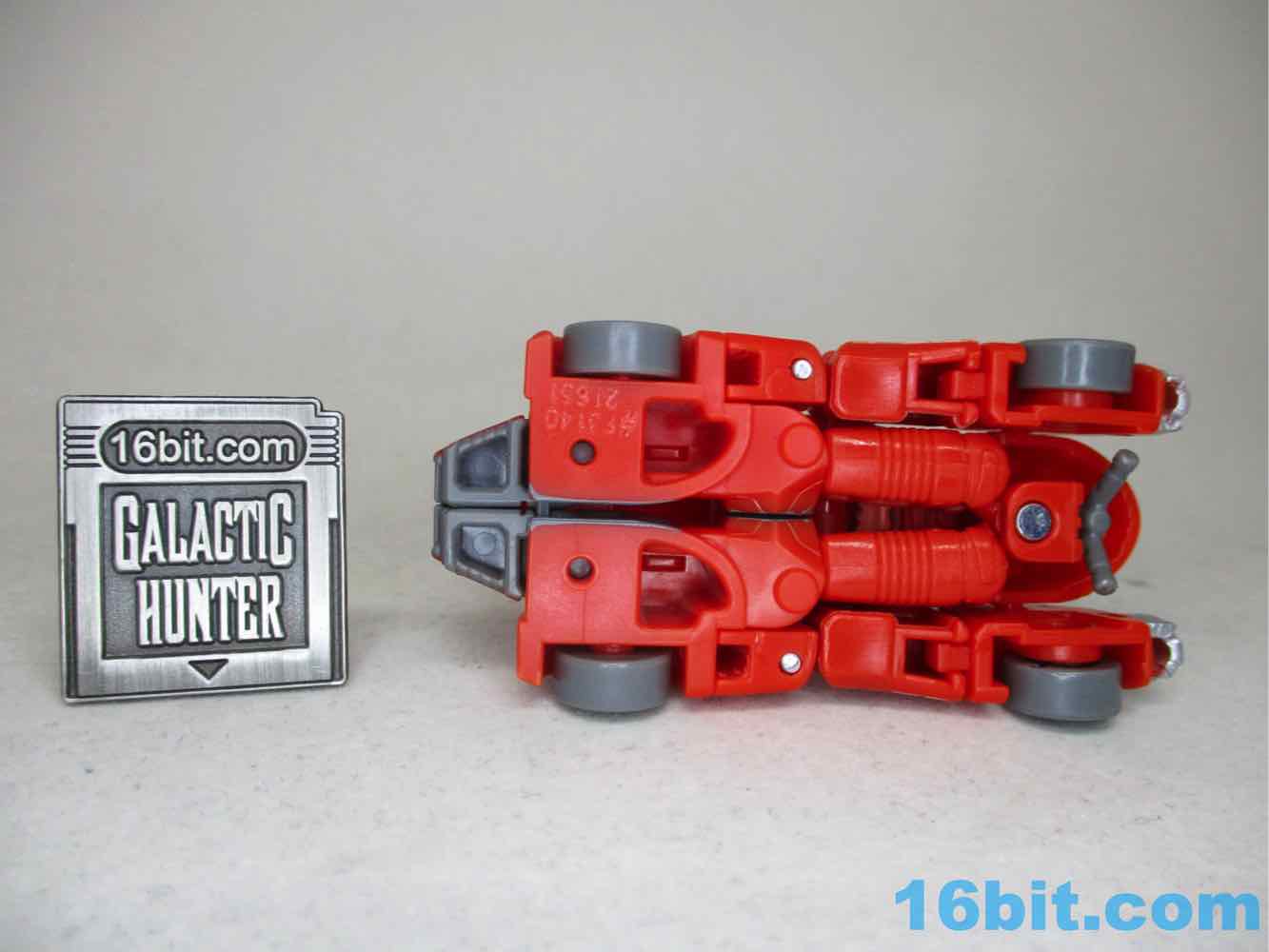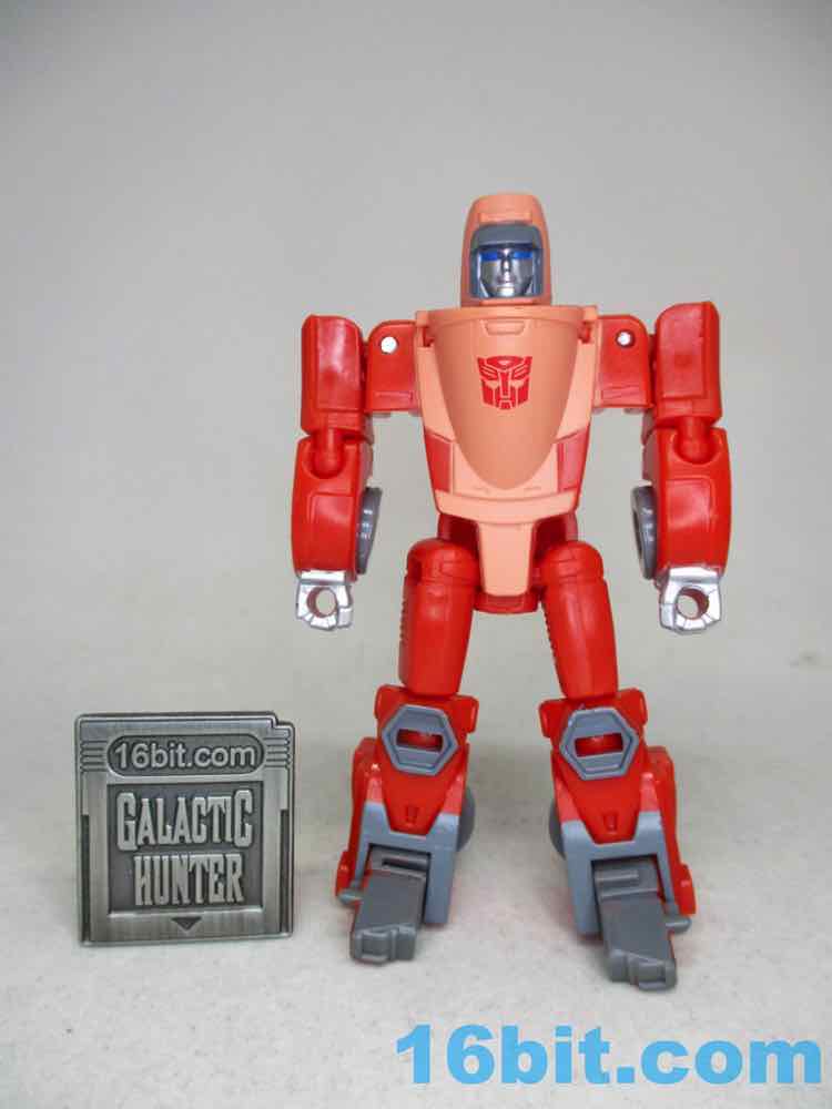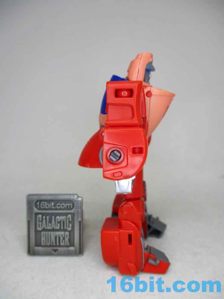 At 3 1/4-inches tall, he's surprisingly good. With just over a dozen points of articulation, this is basically a good robot action figure that turns into an acceptable Wheelie car - if you want the best one, get the original toy. But if you want the best cartoon-accurate robot, go buy this one. The included slingshot fits perfectly in the hands, and he feels sturdy in a way that Titans Return Wheelie didn't. I love the painted helmet, the silver face, the blue eyes, giving the kid robot the look you saw in the cartoon.
