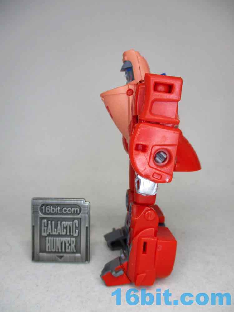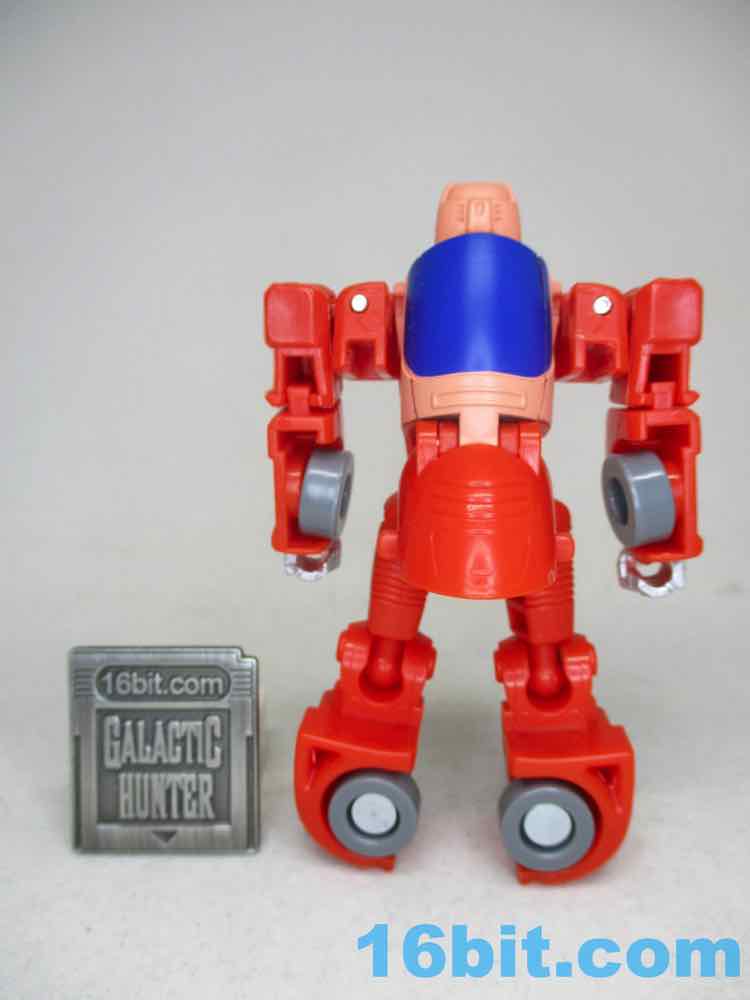 True to the cartoon style, there are angular bits but not overly detailed. The landmarks are all there, but the boots aren't quite as gray as the cartoon, and there's no gray "speedo" around the waist - or light peach on the arms. There are limits to what you can do and paint at this scale given budgets and quality control and, I assume, what fans will bother to notice. If someone just hands you this, you'll say "this is the best Wheelie I've ever seen" right up until you squint at the TV and compare it to the toy. It would not stun me if Hasbro and Takara-Tomy tried an even more authentic Wheelie some day, but if you were 4 in 1984 you're 42 now and odds are your patience for toy hunting and re-buying the same toys is starting to wear thin. (I've started cutting out Core toys that aren't small characters, for example.) Everybody involved should be commended for making a great Wheelie robot for the size, but I don't know when (or indeed if) fans will get 3 1/2-inch figures for $15-$20 and say "nevermind."