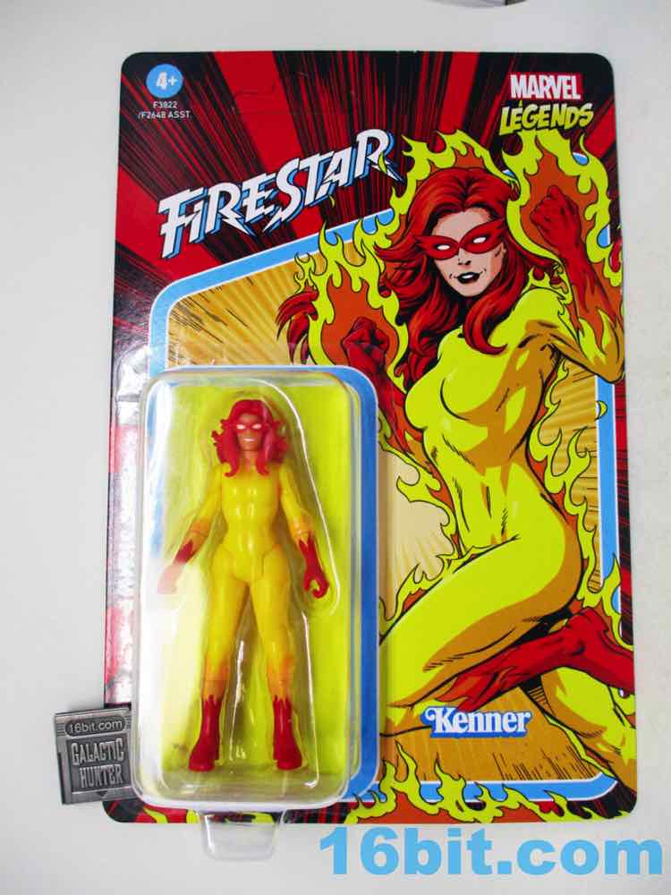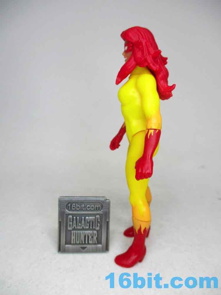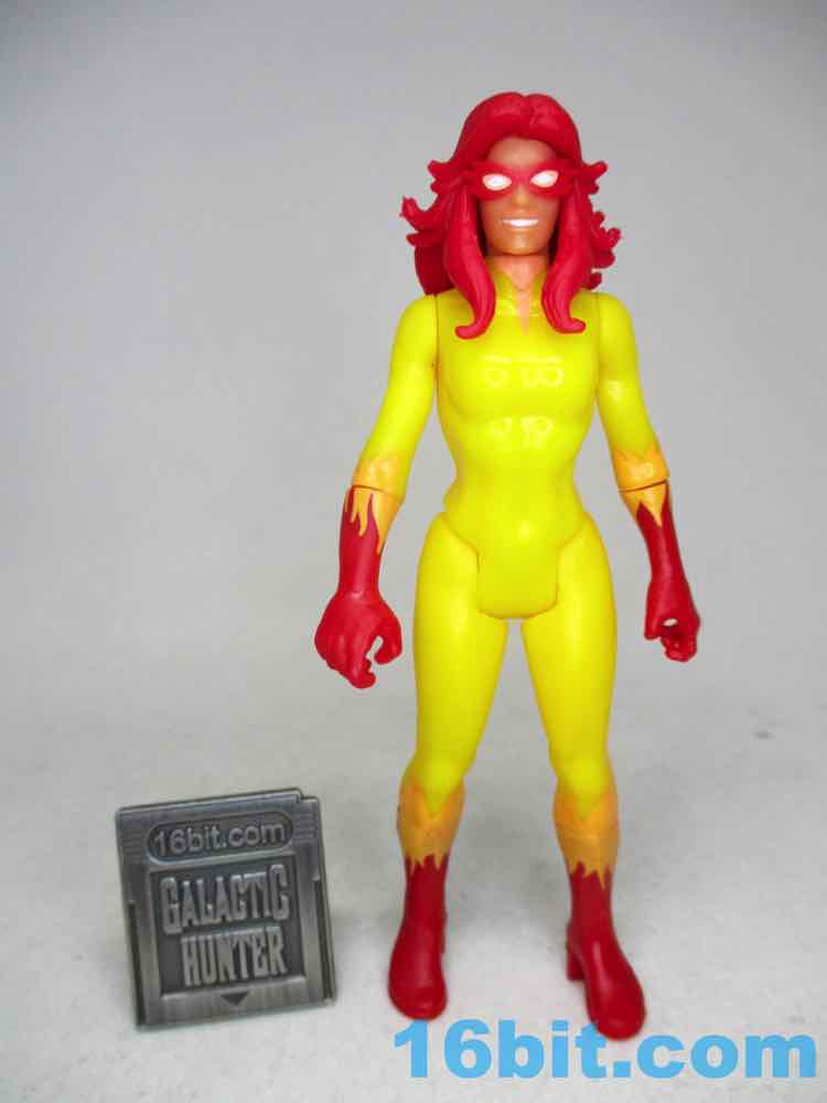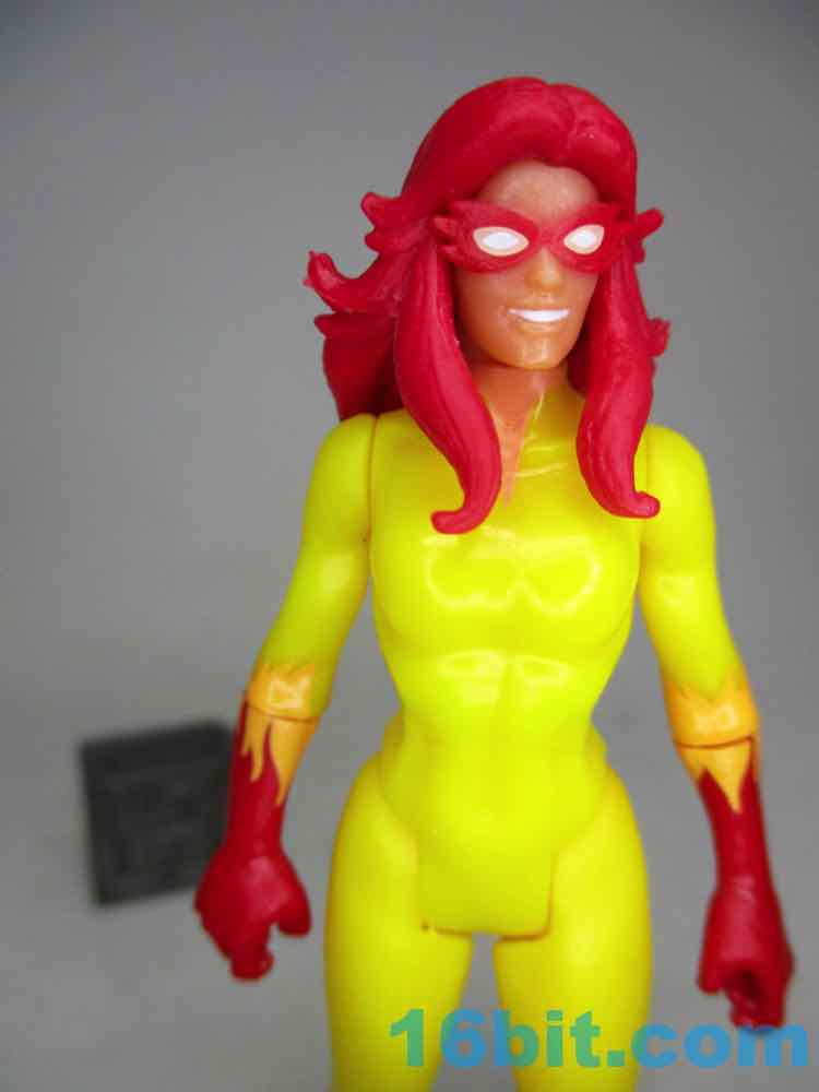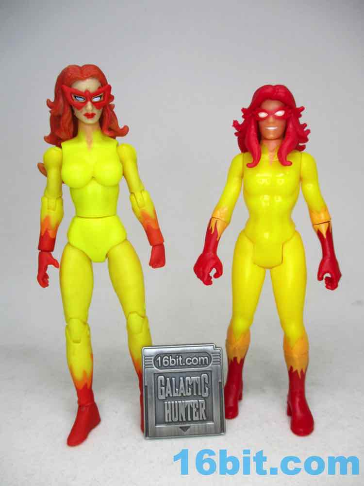 The 2009 Hasbro Marvel Universe Firestar [FOTD #103] was based on the cartoon much more closely - the big tell is the mask, which was upturned a bit more on the sides, and she had a large point above her nose. The 375 Firestar doesn't have that - also the 375 Firestar lacks painted lips, which the 2009 version has. I'd say the 2009 version also has slightly better coloring, but she's expensive now. The 6-inch Firestar has swappable heads, so one is more cartoony and the other is more comic-y. No matter the scale, you've got options.