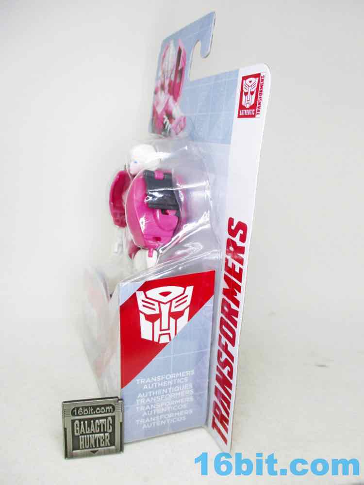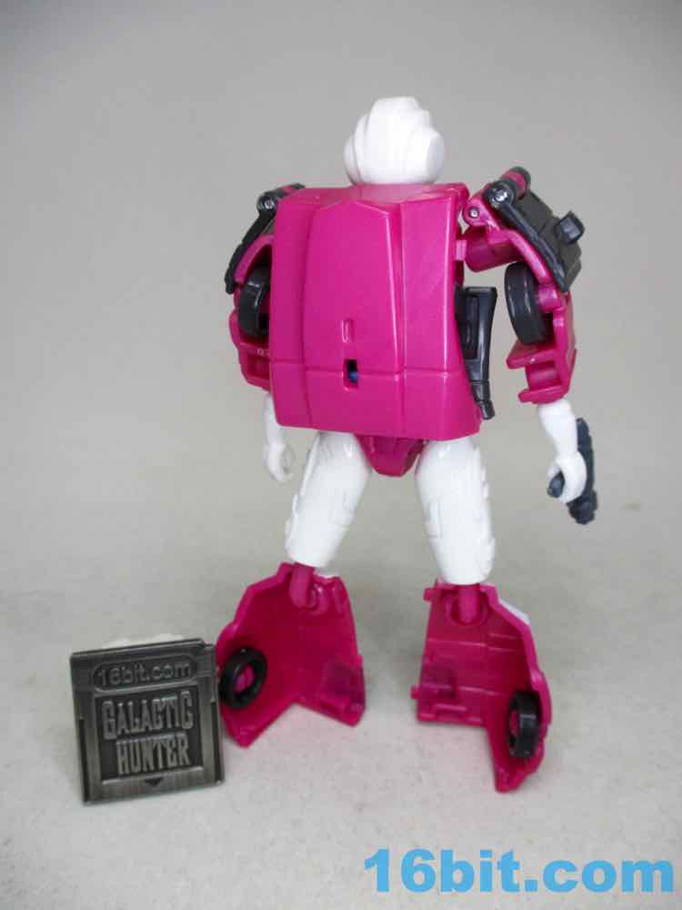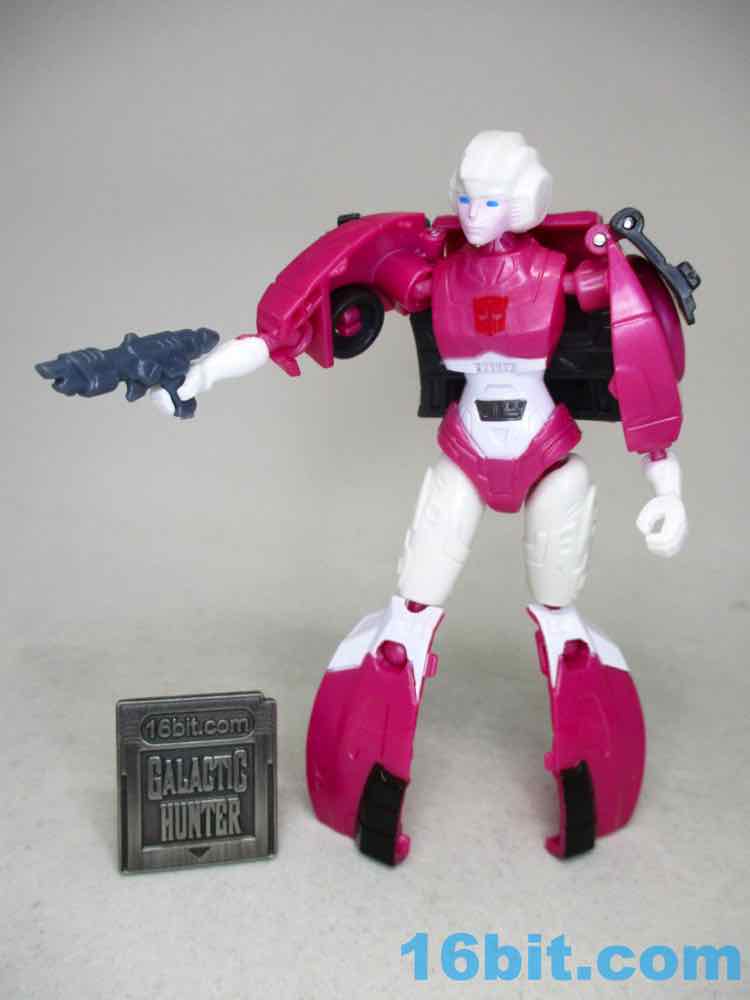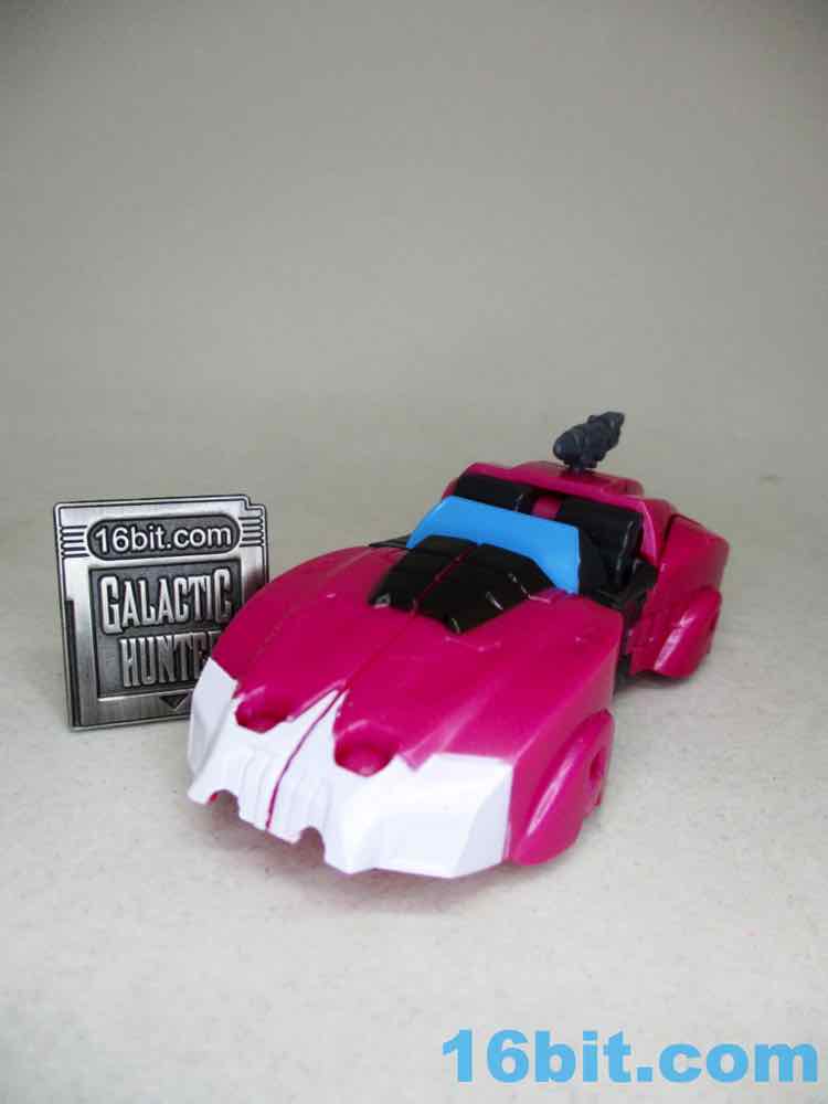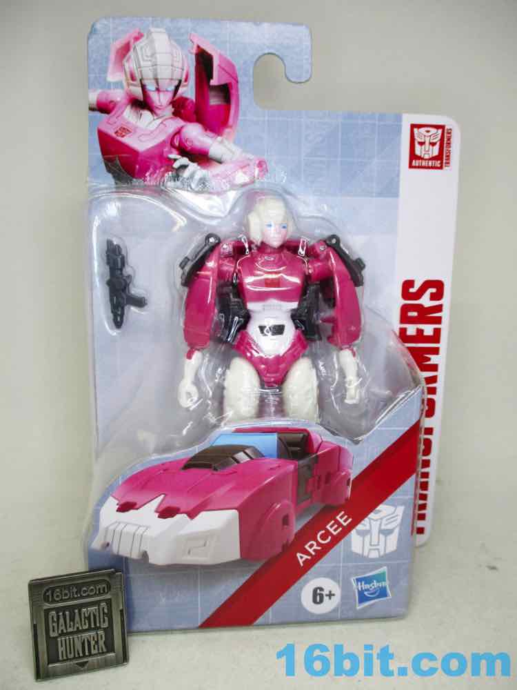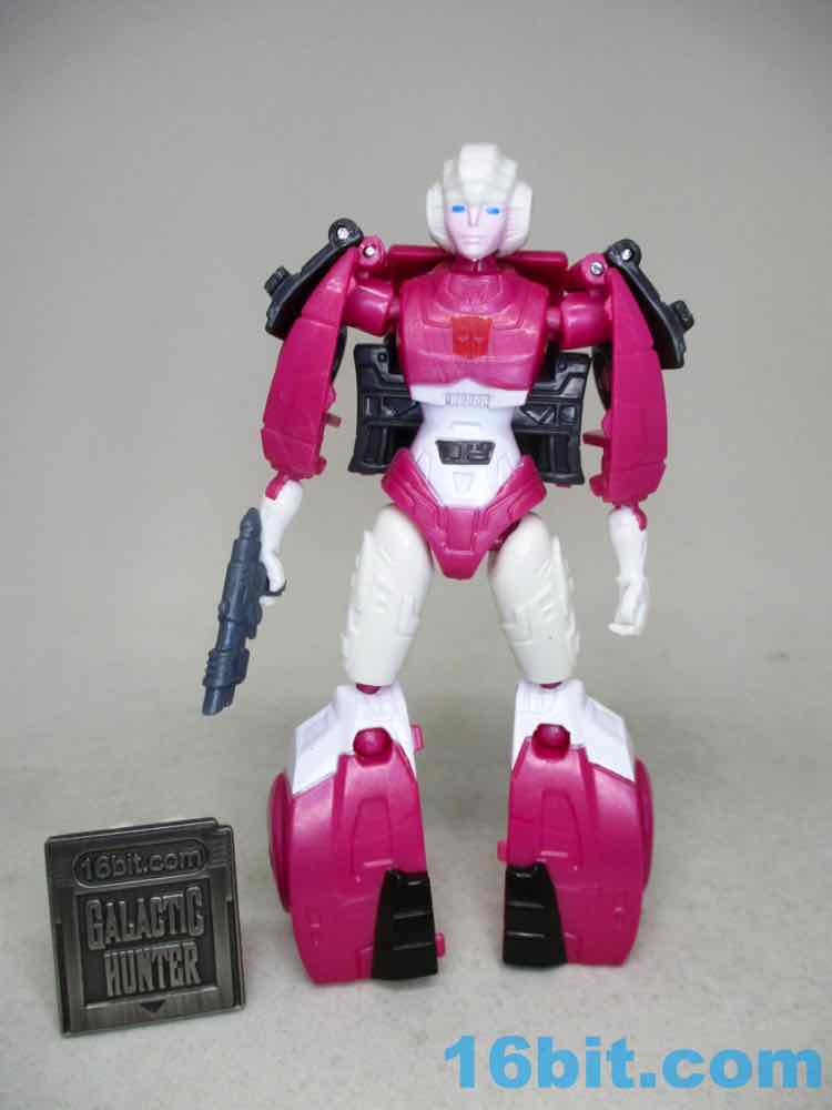 You will not be impressed by the figure, but it's not bad in that it actually transforms. Most recent Arcee toys are a lady robot figure crammed into a car kibble shell. This Arcee's shoulders and lower legs are the actual car, and the cartoony head, chest, tiny forearms, and thighs all fit inside the car bits. The articulation is pretty good for the money, but you're getting some puny arms and fake feet. But you're also getting a blaster that fits in that small fist, and if you're the kind of person that needs a cheap toy for your office, this is perfect. This is nicer than a Happy Meal toy, bigger than a Core Class toy, and better made than a comparably priced knockoff in a "dollar" store. But only by a little bit.