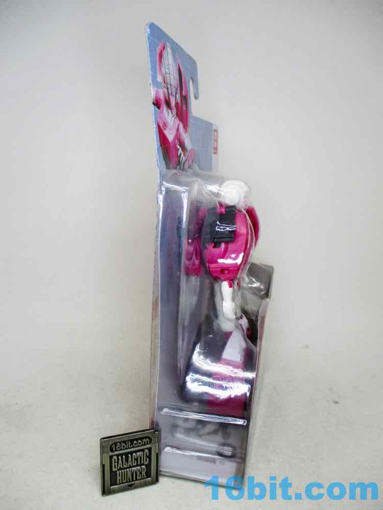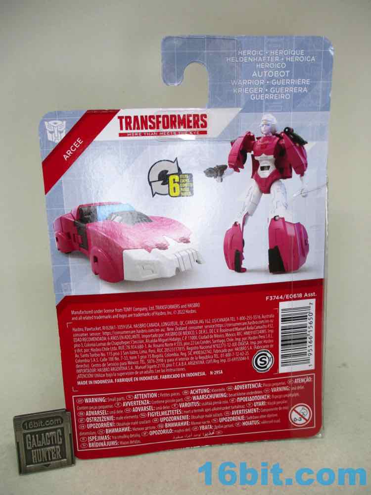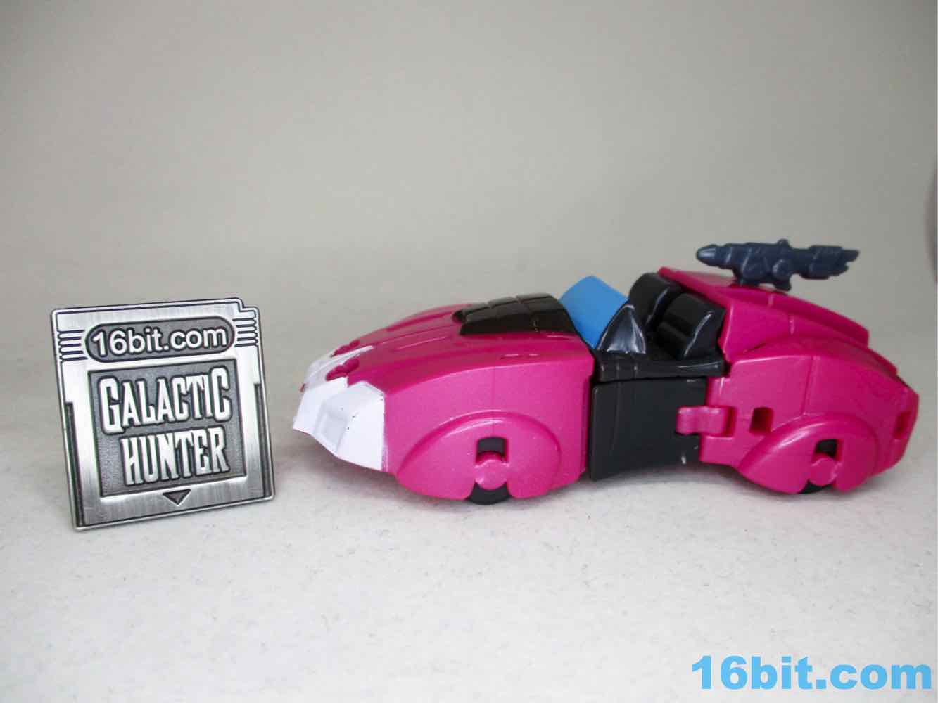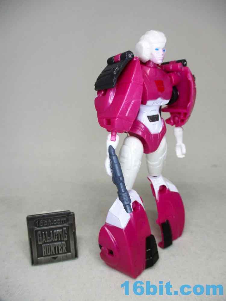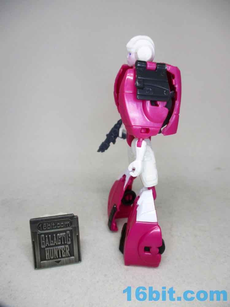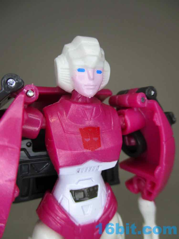 You will not be impressed by the figure, but it's not bad in that it actually transforms. Most recent Arcee toys are a lady robot figure crammed into a car kibble shell. This Arcee's shoulders and lower legs are the actual car, and the cartoony head, chest, tiny forearms, and thighs all fit inside the car bits. The articulation is pretty good for the money, but you're getting some puny arms and fake feet. But you're also getting a blaster that fits in that small fist, and if you're the kind of person that needs a cheap toy for your office, this is perfect. This is nicer than a Happy Meal toy, bigger than a Core Class toy, and better made than a comparably priced knockoff in a "dollar" store. But only by a little bit.