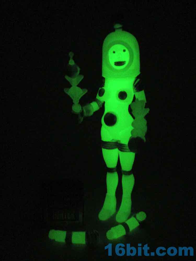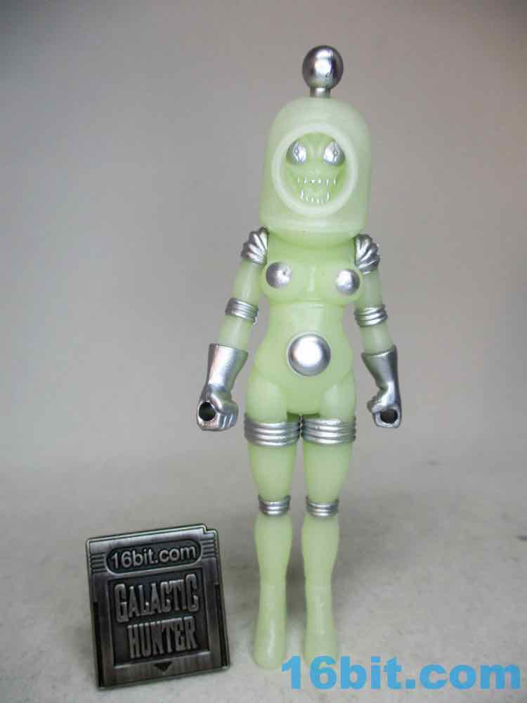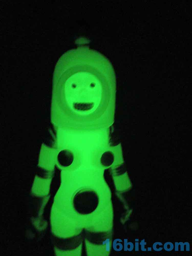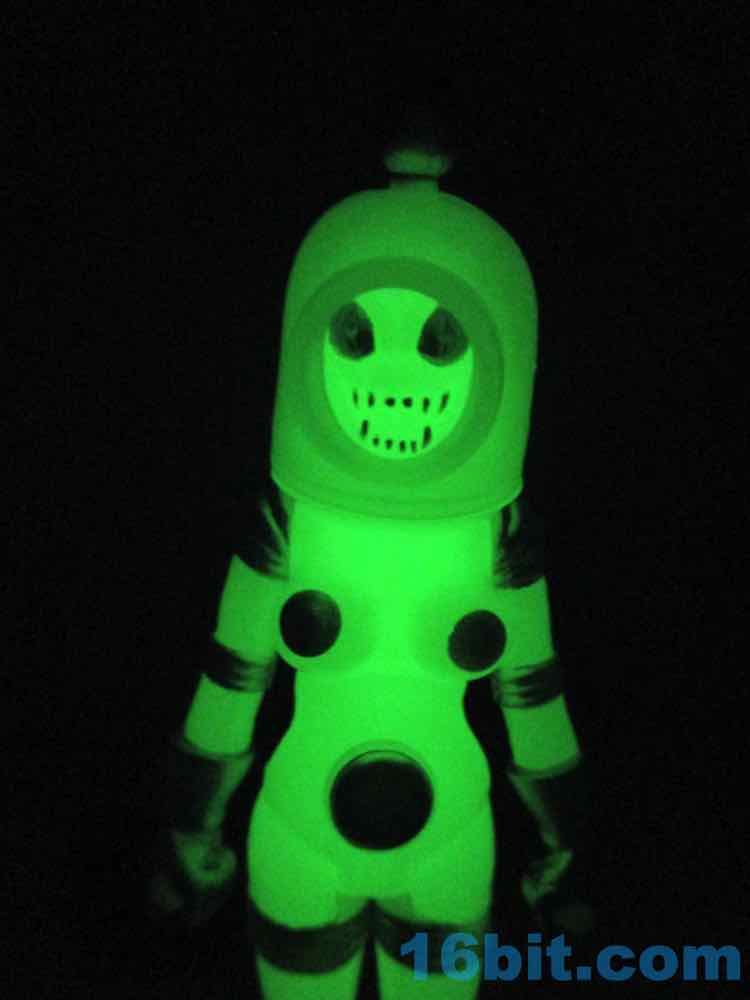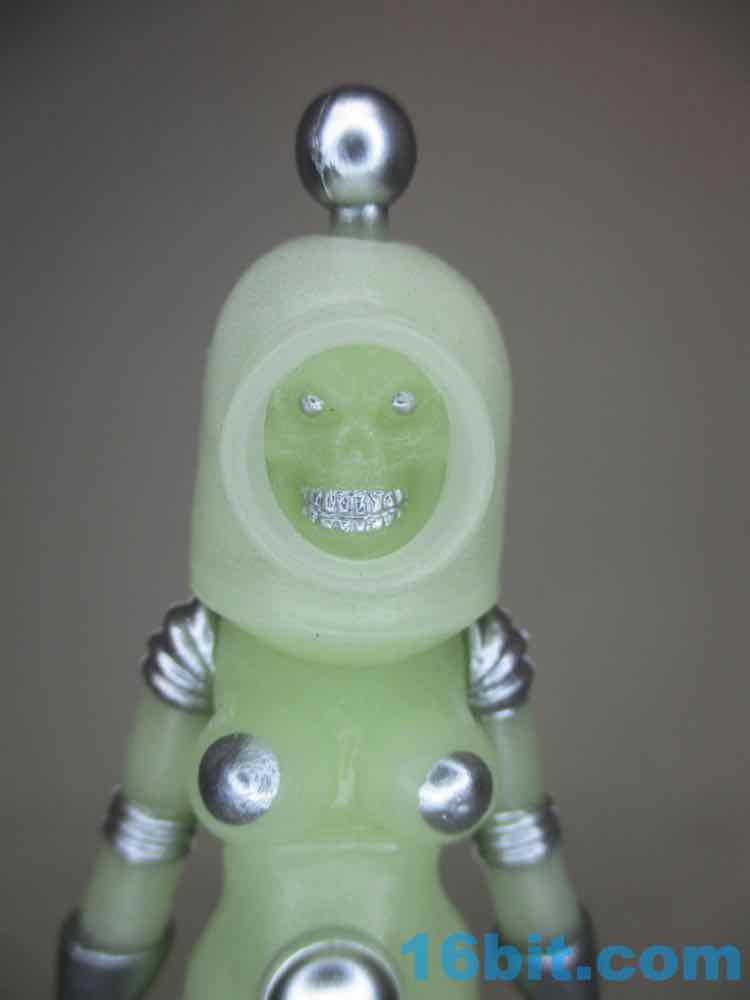 Given the Glyos-style The Outer Space Men had their time in the sun from 2010-2014, new figures like this would keep interest alive by trickling out slowly after the license reverted back to the owners of the brand. The silver-capped suit is great, but the glow-in-the-dark plastic really shines. This mix was particularly bright, and is another fine example of what the Glyos factory can do with glow toys. They're some of the very best - and with three faces (an alien, a spider, and a skull) the shine helps make out some of the details in the dark. The off-white glow plastic isn't the best for showing off sculpted detailing, but that's what the painted and White Star versions are there for.