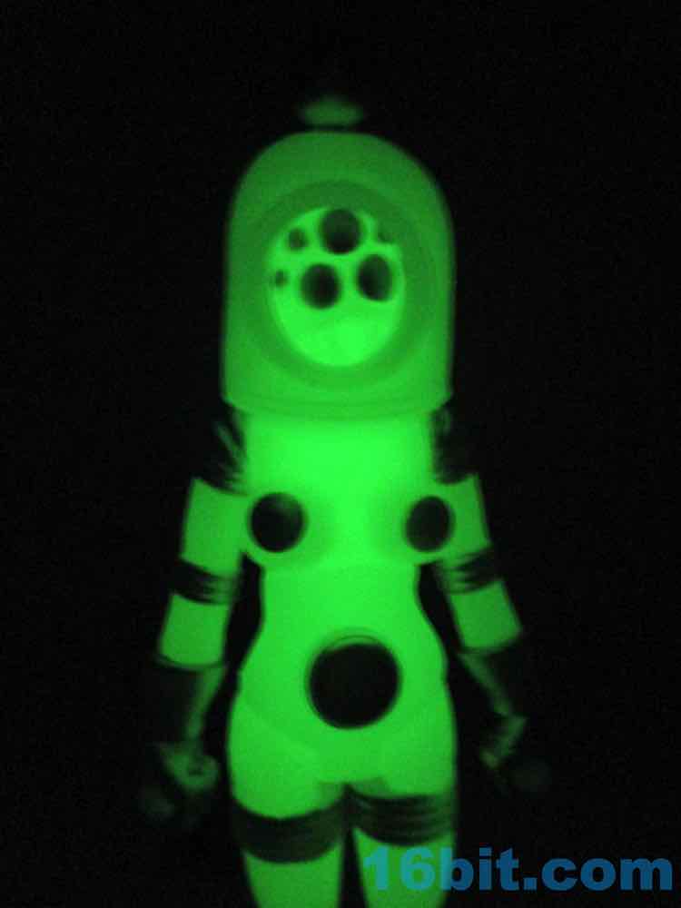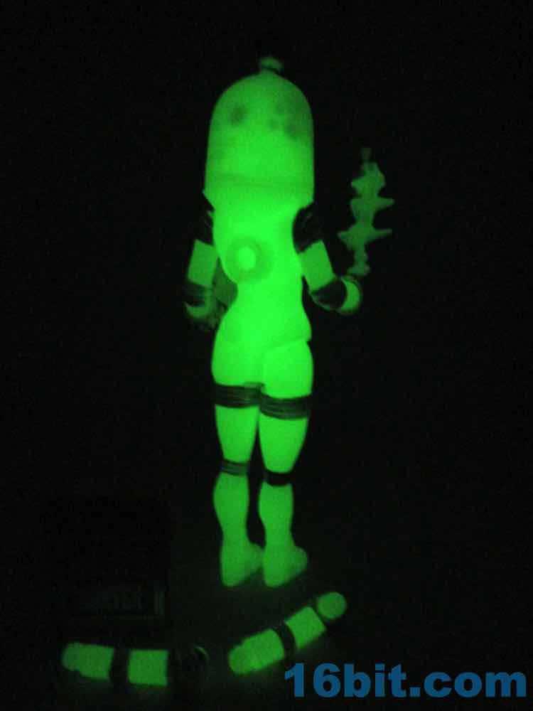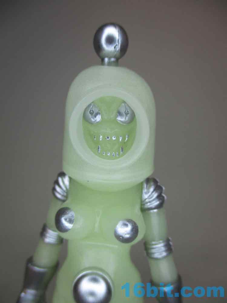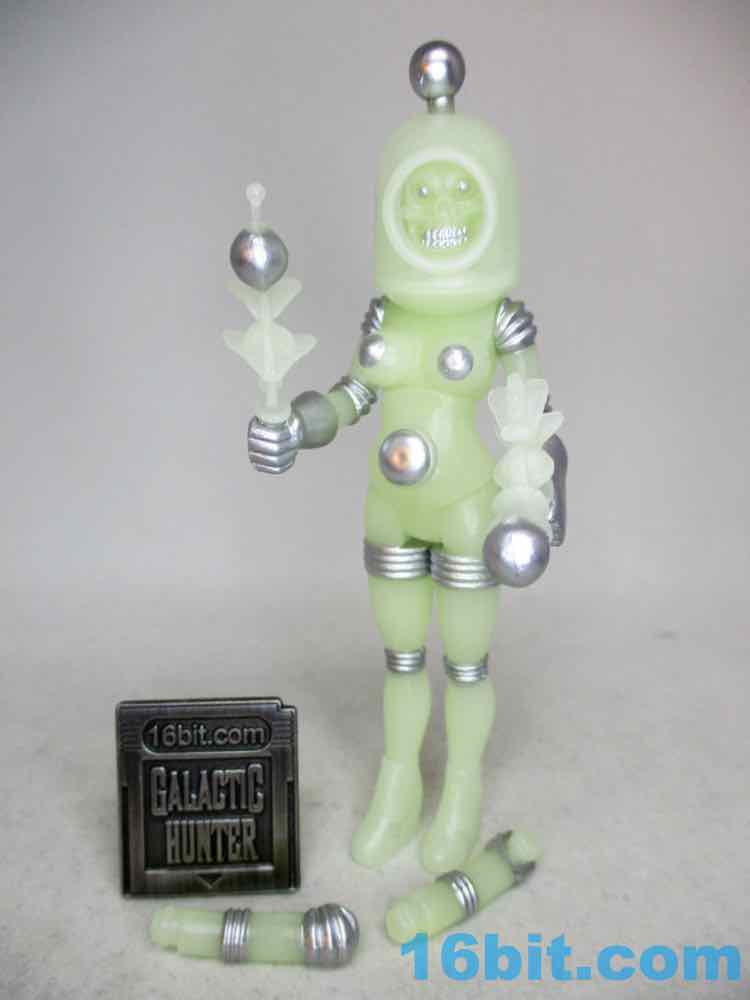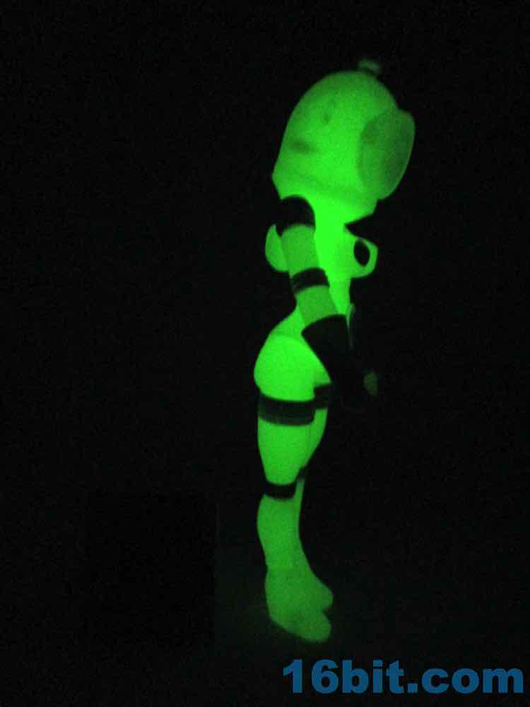 Given the Glyos-style The Outer Space Men had their time in the sun from 2010-2014, new figures like this would keep interest alive by trickling out slowly after the license reverted back to the owners of the brand. The silver-capped suit is great, but the glow-in-the-dark plastic really shines. This mix was particularly bright, and is another fine example of what the Glyos factory can do with glow toys. They're some of the very best - and with three faces (an alien, a spider, and a skull) the shine helps make out some of the details in the dark. The off-white glow plastic isn't the best for showing off sculpted detailing, but that's what the painted and White Star versions are there for.