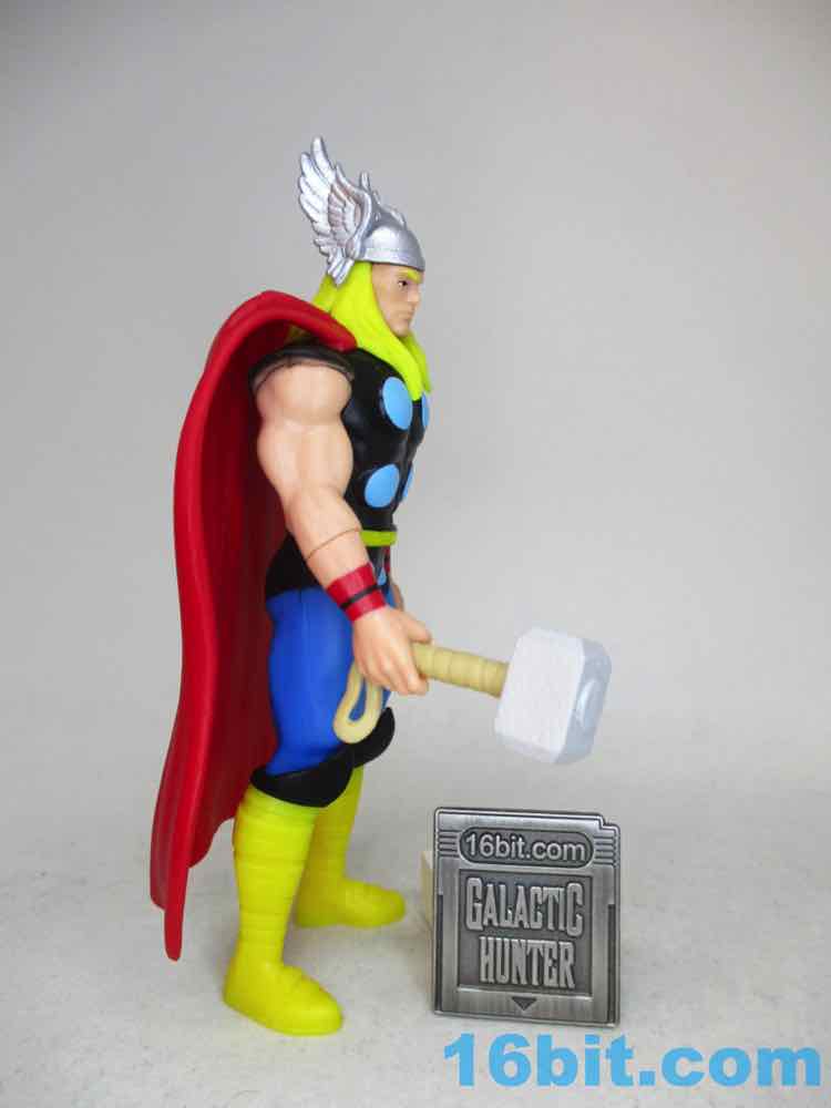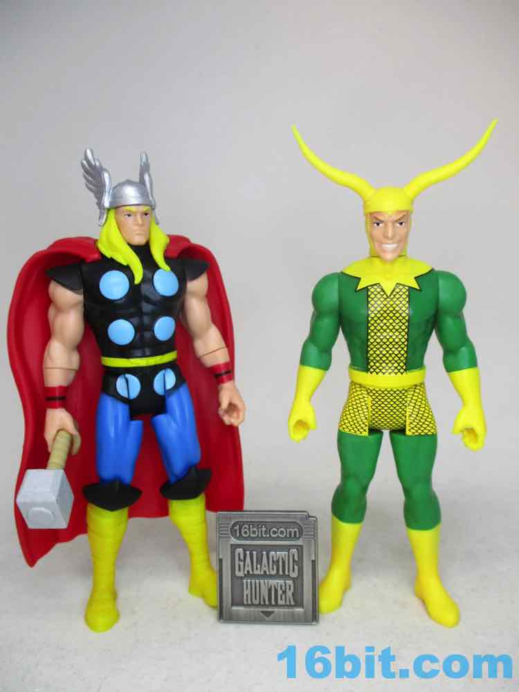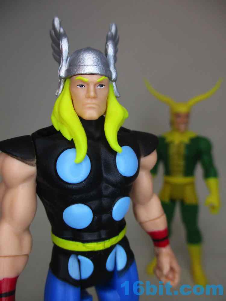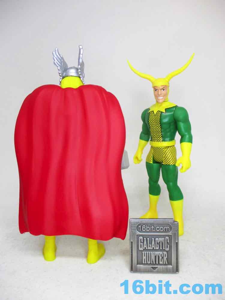 He's a big beefy guy, and sadly while his legs swing forward, they don't swing forward completely. It's enough to cram him in some old vehicles (my old Kenner MTV-7 on my desk works - his cape hangs off the back) and he has no problems holding the hammer in any of a variety of ways. It's a well-engineered action figure overall, but not perfect. Actually, he is kind of perfect - the eyes are sharp and modern, and it looks like he must have been inspired by the most official, most vibrant color reference available. It's a weird piece but utterly worth having, especially with Loki nearby.