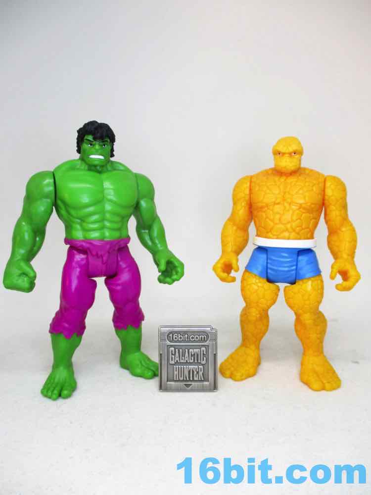 While Marvel characters are ubiquitous, I didn't read super hero comics as a kid. Yet somehow I knew about the Fantastic Four, even if I knew Thing more of a guest-star on other Marvel cartoons or as a pitchman for Hostess Fruit Pies or as the stars of a legendary bad Roger Corman movie. There were countless parodies, remakes, and nods to the team but it was somehow always just off my radar - I still haven't seen the movies, somehow. But I'm fond of the character designs, and as you know I'm a sucker for Kenner-style toys. Despite deviating from old-school Kenner designs quite a bit, Hulk and Thing are actually pretty great toys. They're nice action figures, but their big hands let them grab things while their tight joints and big feet keep them from toppling over. There's not much I can do with most super-articulated figures beyond finding the "sweet spot" center of gravity and place them on a shelf or in a ship, but I was immediately using Thing to abuse my other action figures. That's a good sign.