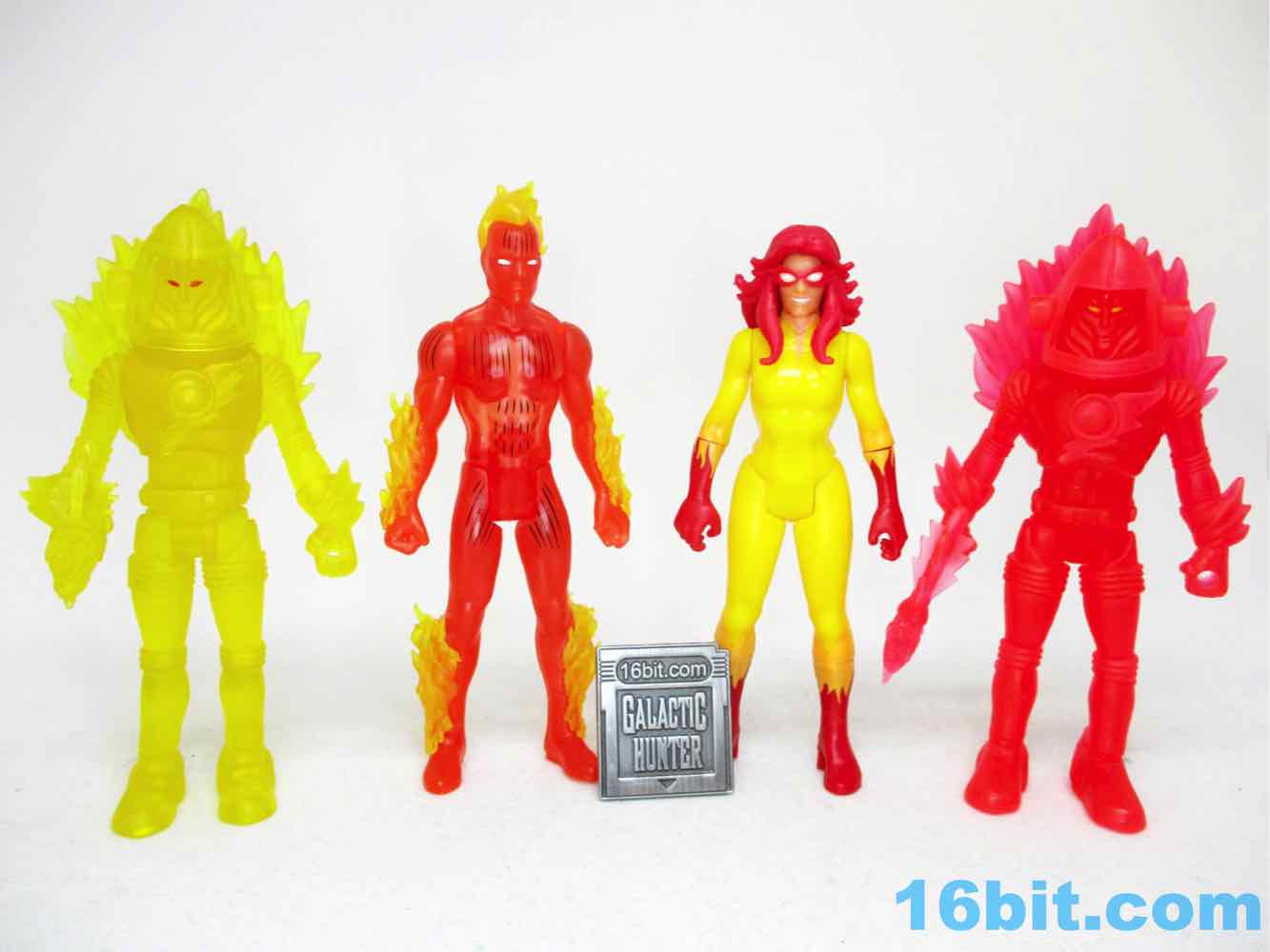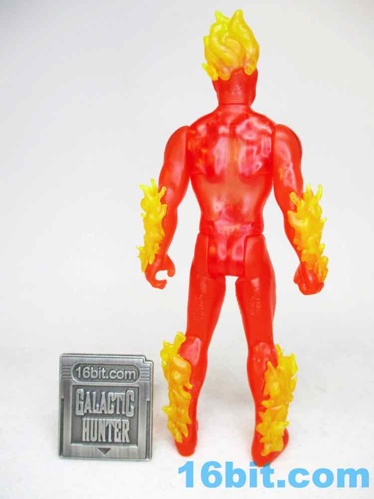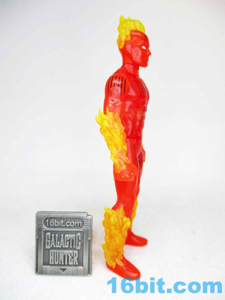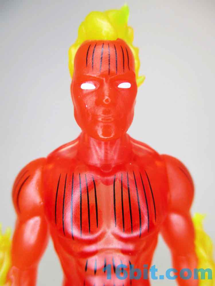 Surprisingly, the sculpt is similar but the only reused part here is the torso. The skinny (buff) male torso you saw on Spider-Man, Iceman, and others is shared by the Human Torch but he's otherwise all new. You can see the Hasbro design philosophy at work here - there is no cut at the forearm or below the knee. This figure was made with molded-on head, arm, and leg flames plus it's one of very few figures to have a fist for his hand. It's a striking design, but one that makes me think more of Kubrick or LEGO figures than old Kenner. Those black line marks on his chest look superb, but it's unusual for a 1980s figure to bring details from a drawing on the actual product. The molding of orange flames on a red body is almost unheard-of for that era, you'd usually just see painted parts to cut tooling costs. Hasbro did something to ensure the figure looked superior, and the results (complete with white eyes) is striking.