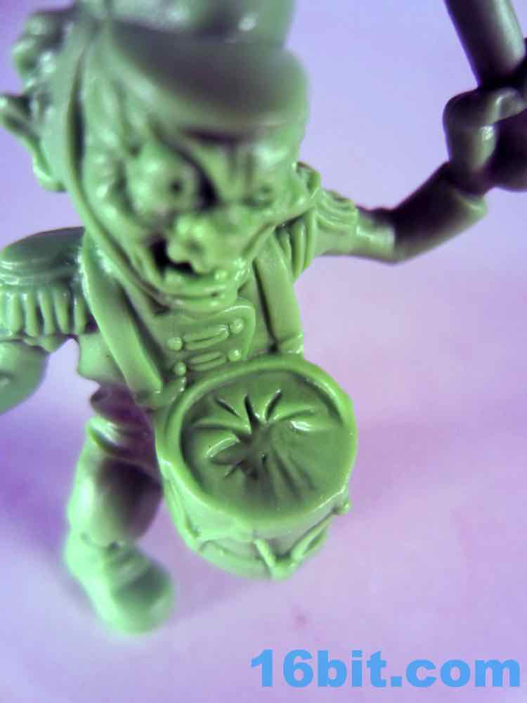 Your all-purpose Christmas drummer is Johnny Hammer-stix, and he's got bones for drumsticks. Because of course he does. The detail on this figure is really great - the uniform is torn, the eyes are bulging and creepy, and the grotesque smile with protruding teeth shows a lot of time and care went in to making this face really stand out. Even 10 years later I look at this and impressed by the subtle wrinkles and intentional depth to bring him to life - the holes in the eyes add shading in a world without paint, and the shoes once again look pretty good. The hands are huge, but at this scale, they tend to need to be. It's particularly interesting (and vexing) to see "retro" action figures come out in the last year or two with much softer sculpted detailing when old Keshi figures like this are just fine and so were the 1980s Kenner originals, but I digress. Johnny turned out really well, and while I don't find him as delightfully weird as the other figures in the holiday collection, he's great.