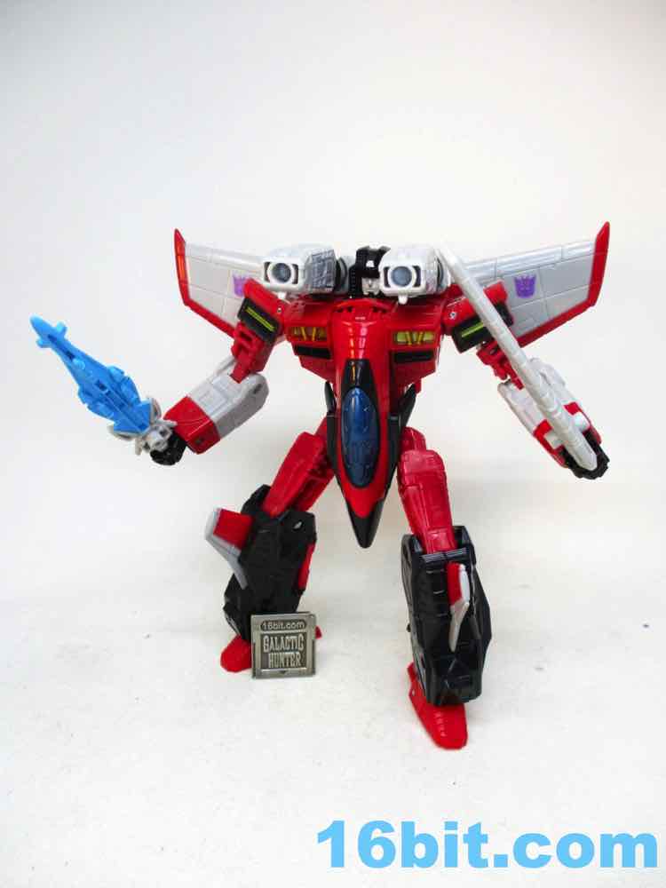 The toy has no spring-loaded or electronic gimmicks anymore, but you can flip out his shoulder cannons or wear them like a backpack. The wings move, and he has no problems holding either sword. The teams did a good job making sure this was an appealing collector figure, thanks to an abundance of articulation from the transformation.