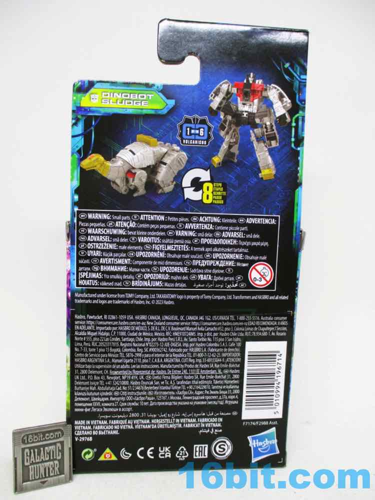 Hasbro Transformers Legacy Evolution Core Dinobot Sludge Action FigureAfter more or less ignoring this character for the 1990s, 2000s, and most of the 2010s, we are now getting a fair number of Dinobot Sludge toys. As part of a team of six - and as I write this, we don't know who the new guy is - he can build a mini version of Volcanicus, the Power of the Primes combiner we got about five years ago. The funny thing is deluxe-class toys were $17.99 then and much smaller core-class toys are $11.99 now... so this isn't really a good replacement for Power of the Primes Sludge [FOTD #1,926]. Comparing him to last year's masterful (and over $50) leader-class Studio Series 86 Sludge [FOTD #2,449] isn't really favorable either, because the big guy is way cooler than four (or five) of the little guy. There's no comparison. The big guys have more articulation, and actual accessories. The core-class one is much smaller, has no separate gizmos, and isn't as satisfying as most similarly sized Transformers from the line's run. So really, we don't know for sure if he's "good" or not until we see a finished Volcanicus, and if we get a Dinoking some day, you're probably going to want to skip these entirely.