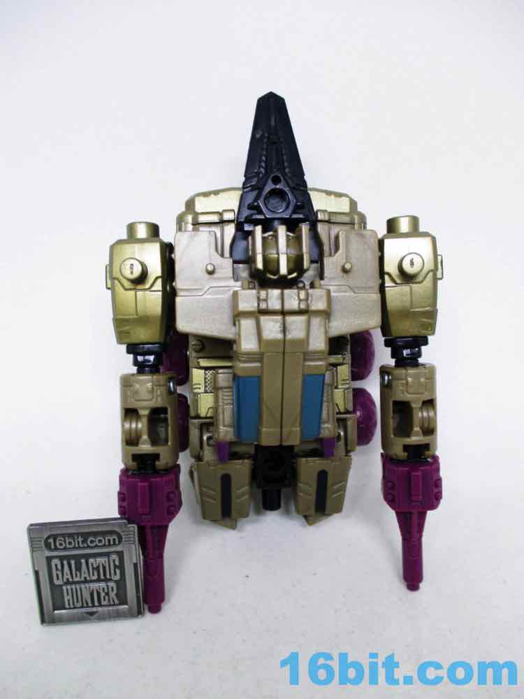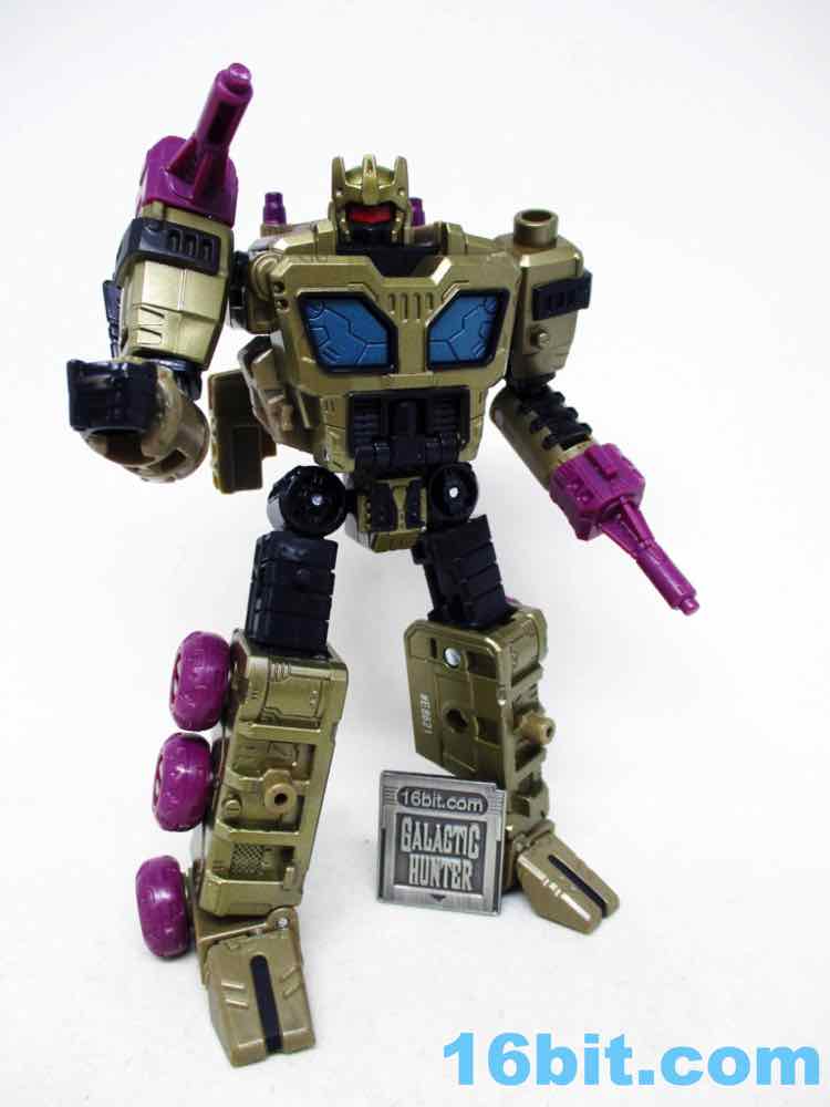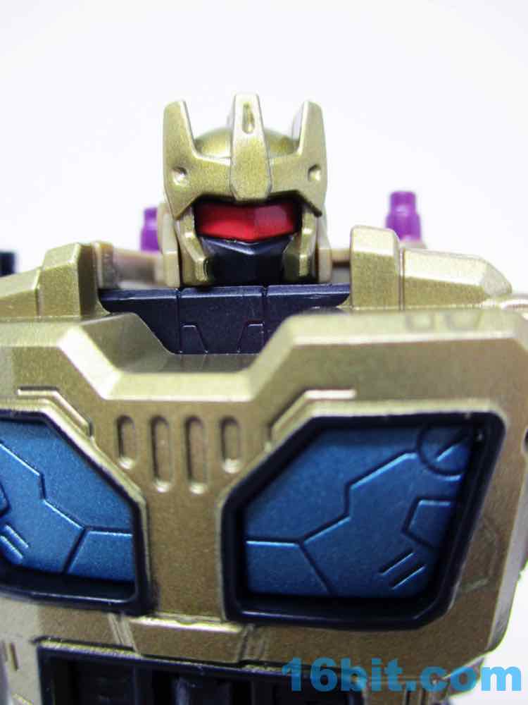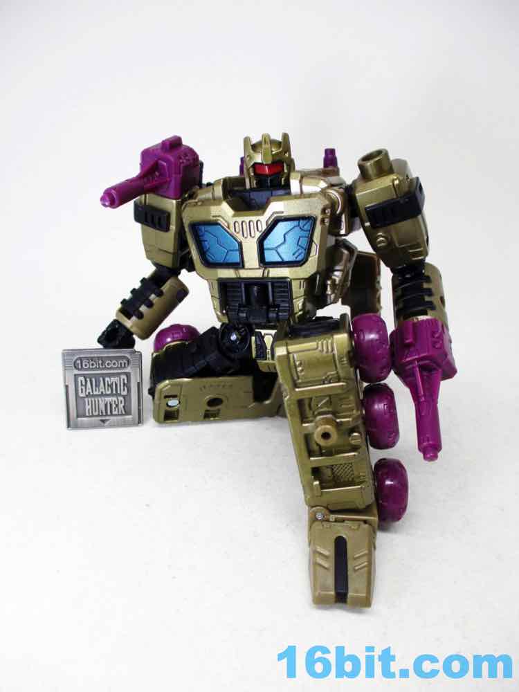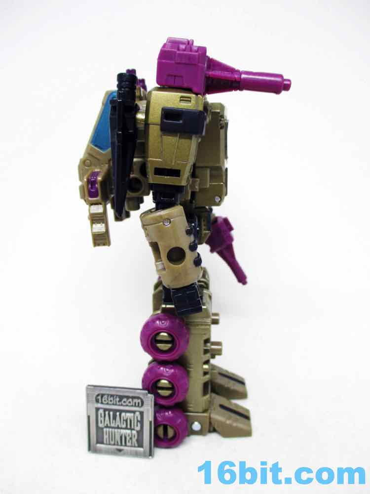 The robot looks great. He has more color than the original toy which was just gold and purple. The added blue chest, black elements, and red eye visor match the cartoon nicely and break up the monotony we got with some other toys (looking at you, Full-Tilt.) With about 22 points of articulation, it's a massive upgrade from the original toy. It is unknown if this gold toy will crumble into dust like some older ones, but the future is fun like that. You can put a dagger in his hand, or put blaster coverings over his fists. This kind of accessorizing is wonderful and welcome - I hope they consider doing it with more toys in the future. We got a bit of this with Trailbreaker and Hoist, and it's generally a fun way to change up how your figure looks. You can also mount the blasters on the shoulders.