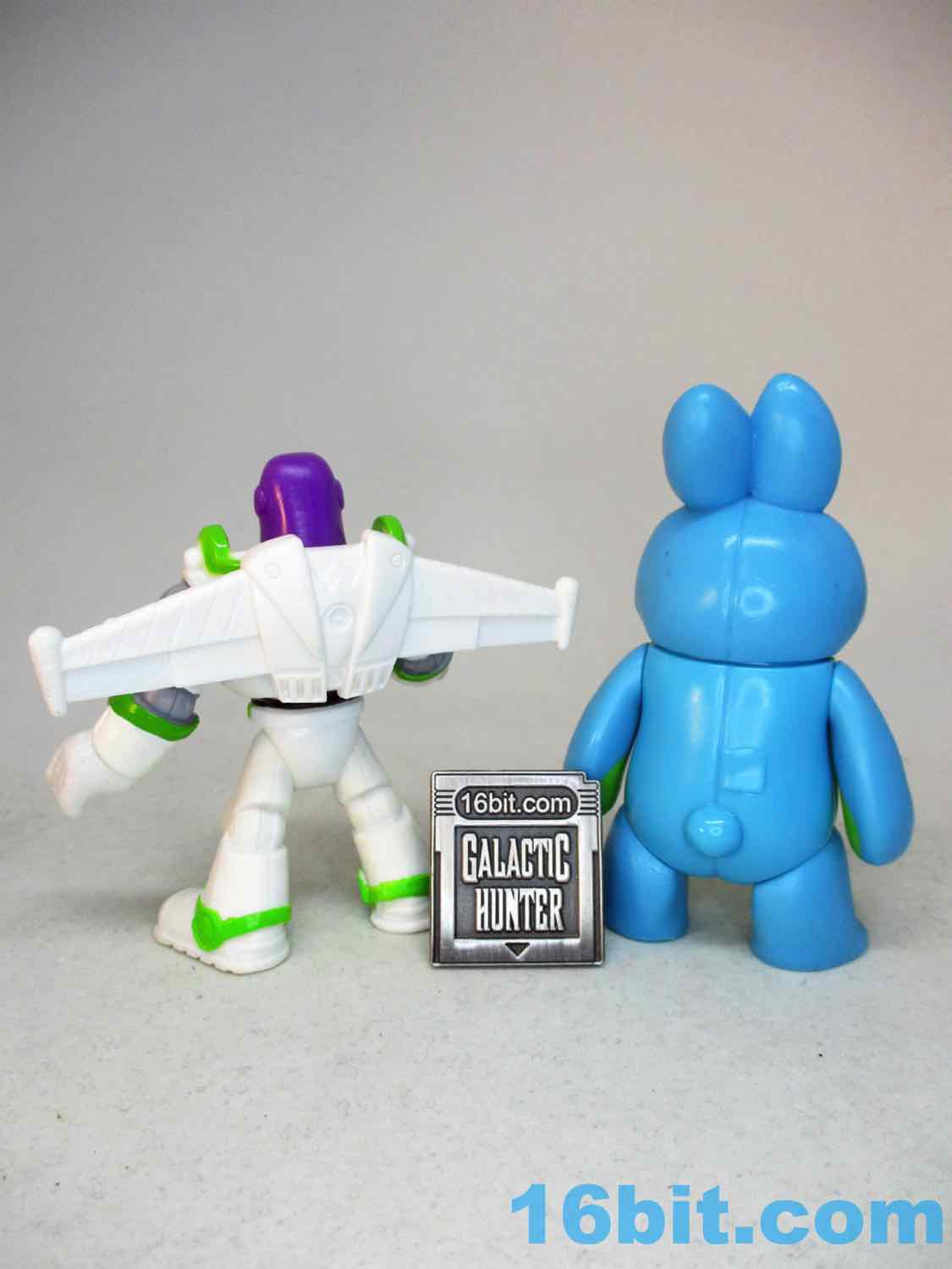 This pairing of Buzz Lightyear and Bunny means you have to buy other sets to get a Ducky, like a big figure multi-pack or a Carnival playset. So I probably won't be getting them - but that's OK, I just want to have a more random sampling of Imaginext. The Buzz Lightyear body has the GBG91 SKU stamped in the foot, but shares tooling with other figures. What makes him interesting/unique is the deployed wings, as most other Buzz figures just have the backpack. He can't go in a lot of vehicles, but he's still a perfectly fine figure with eight points of articulation and pretty great paint for a cheap kid toy. The facial details are stylized, but impressive. They painted on the eyes and chin quite nicely, with the mouth also being a carefully added ink shape. The wings have purple and red stripes, the chest has all his painted buttons, and even the ankles feature his trademark green trim. Given there are little circles on the ankles, I'm surprised they didn't slap an "i" logo on them.