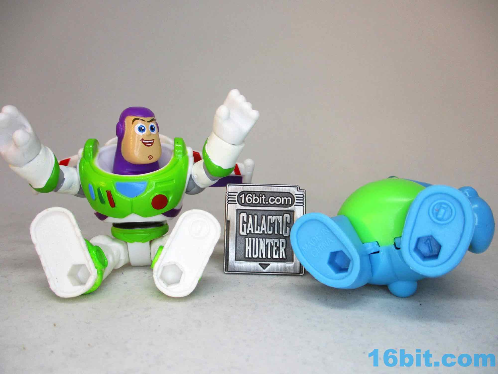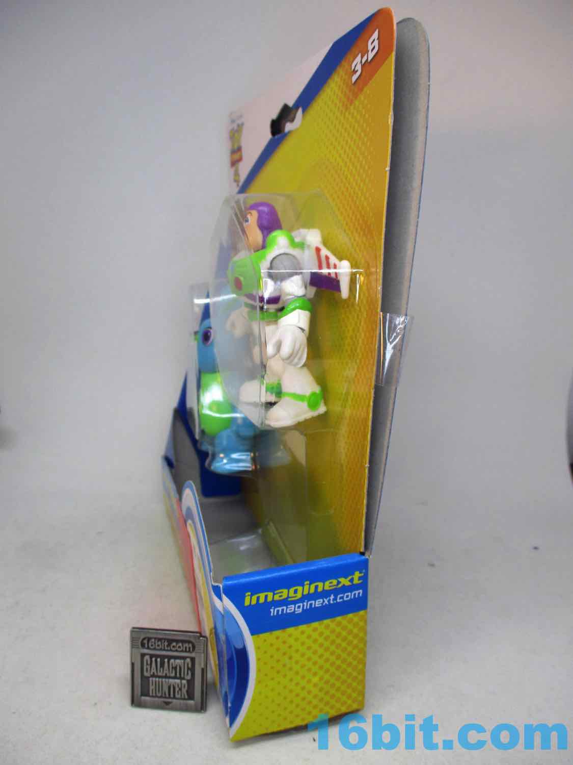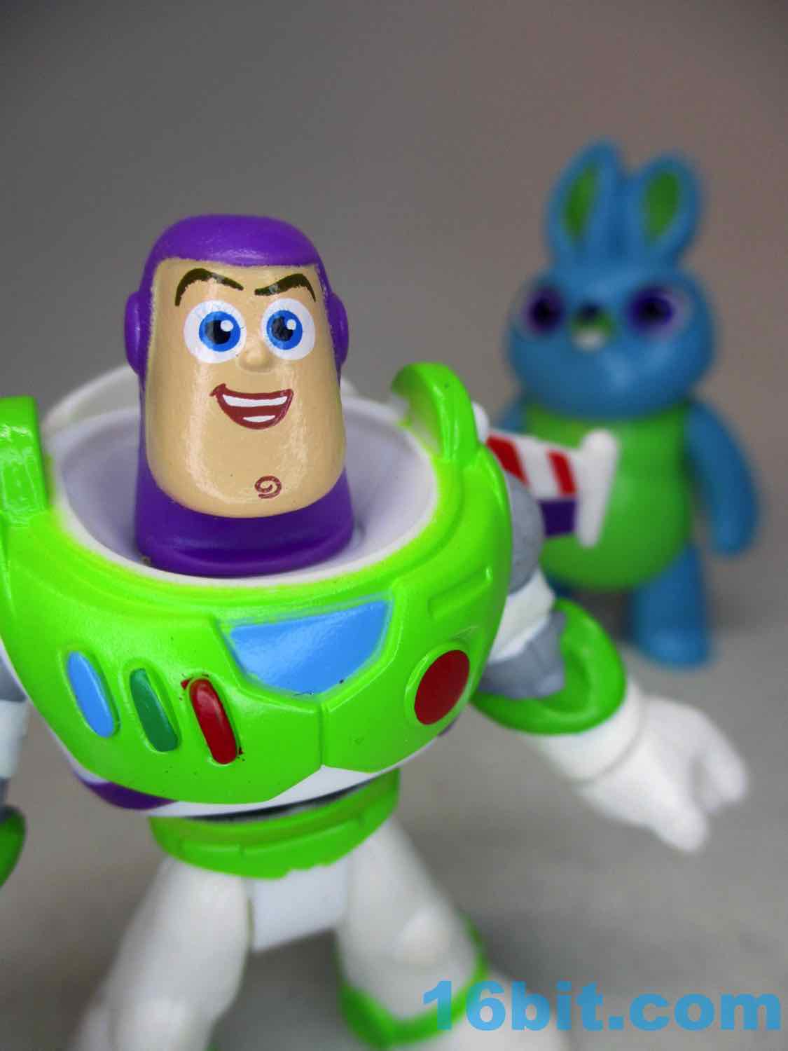 Range of movement is standard Imaginext fare, and he has no problems fitting on the various red action switches on vehicles or playsets. He has no accessories, but he can use whatever you have on hand. He's also a different mold from the Toy Story 3-era Imaginext Buzz Lightyears, who looked a little more mischievous and a smidgen grayer. This one seems to be aiming for "cuddly."
