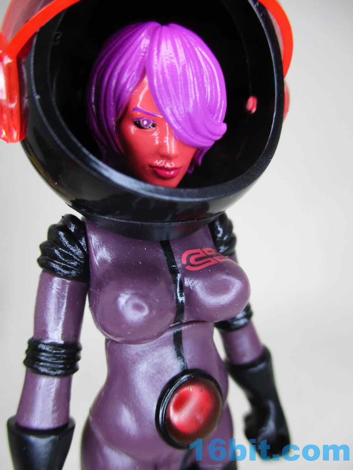 The figure has a subtle faction symbol on her chest, and I can't place it if it's an existing one. I assume this is the Voidrillion Command symbol, but it may not be the case. Her belly gem is a clear pink piece with a black circle, and on the whole she looks a lot like a typical human astronaut from this line. Minus the colors.