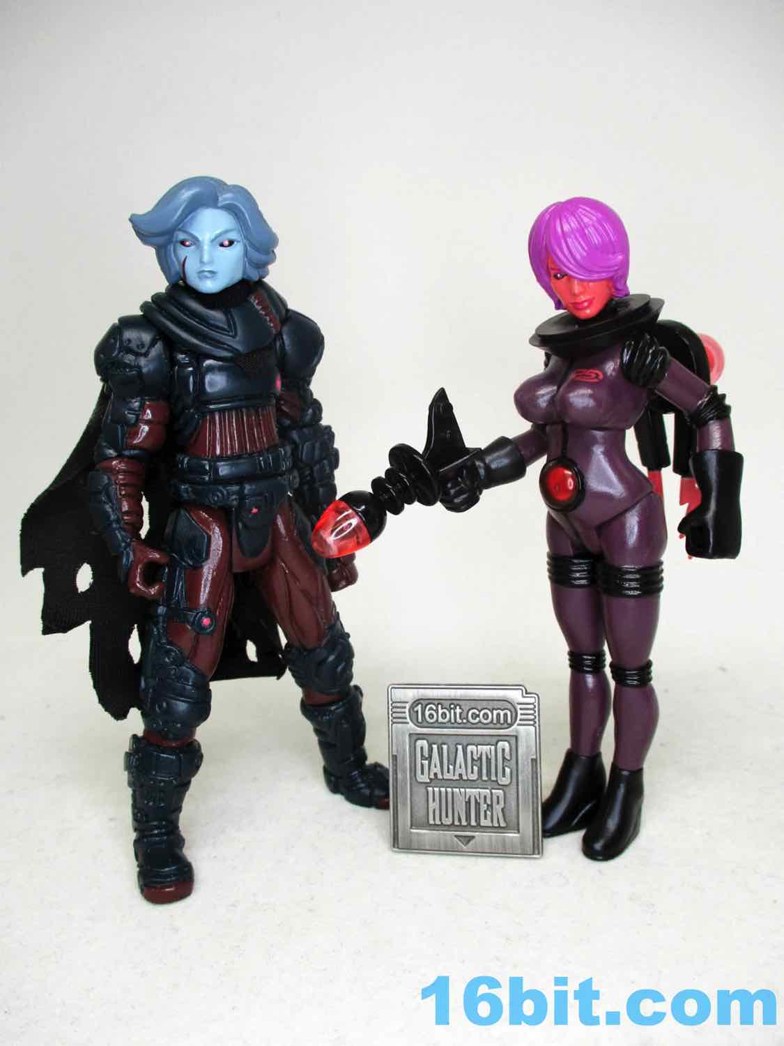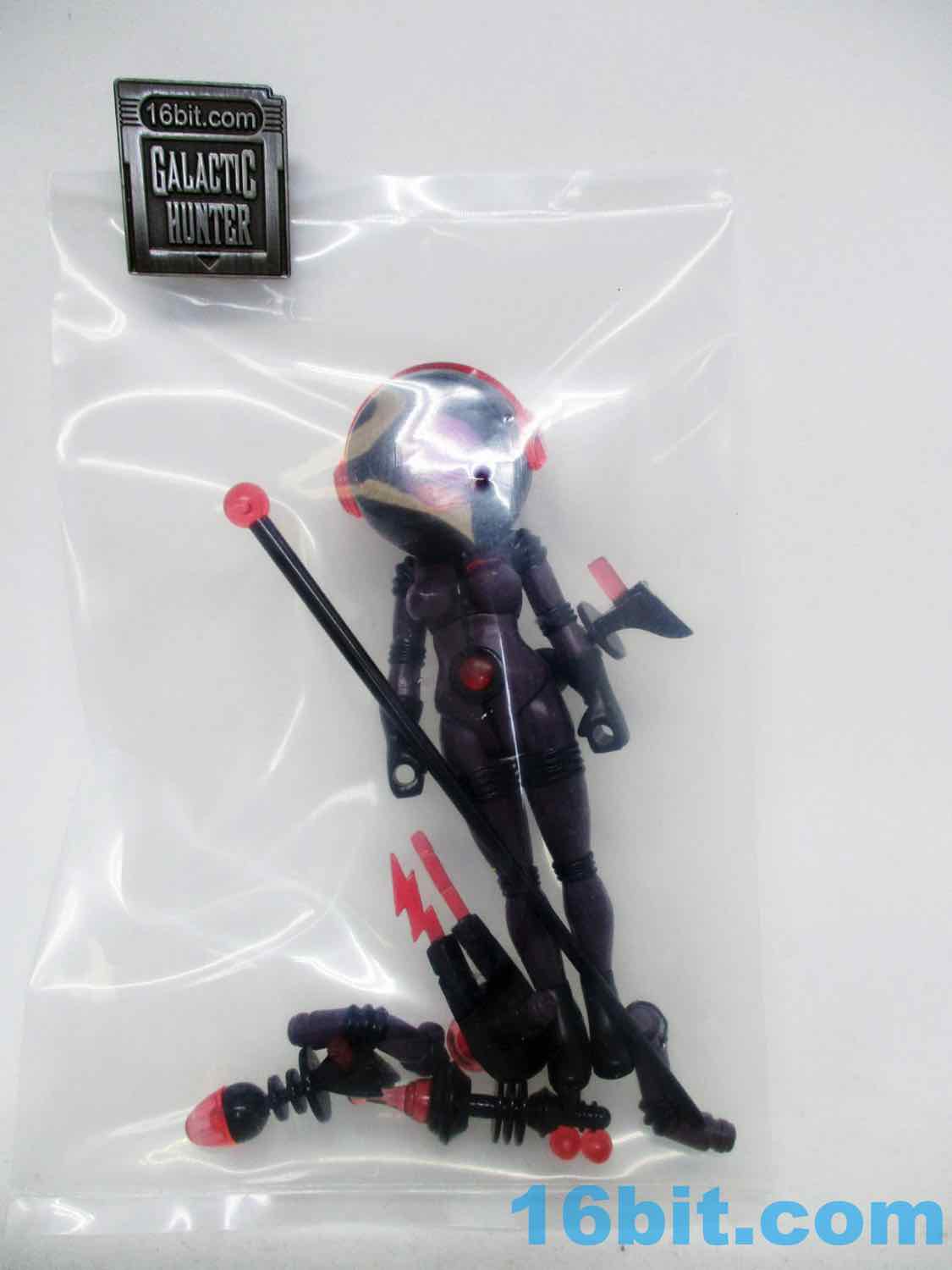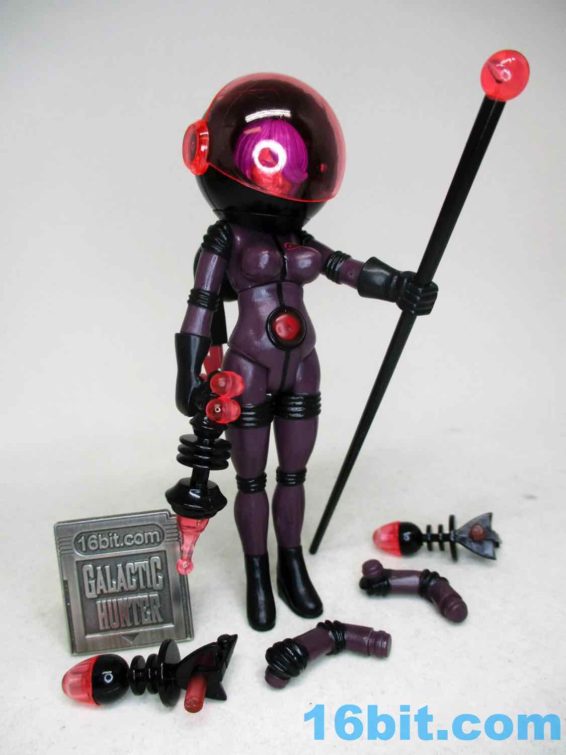 I like this Galactic Holiday Voidrillia of the Voidrillion Command Luna Eclipse because her colors don't match any other human action figures I have in my toybox. She stands out. This 3 3/4-inch scale repaint of a resculpt turned out well, but according to Matt Doughty has some design connections to Queen Kirallius [FOTD #2,186], the figure from early 2020 that you regret missing. As a repaint of the original Luna Eclipse [FOTD #2,371], she has pretty much the same form factor. You can swap arms between bent and straight, she has a backpack, and there's a removable helmet with an opening visor. The figure one-ups the previous releases by adding a pair of blasters from the Cyclops action figure and a wild paint job, but you lose the glow-in-the-dark elements. Win some, lose some.