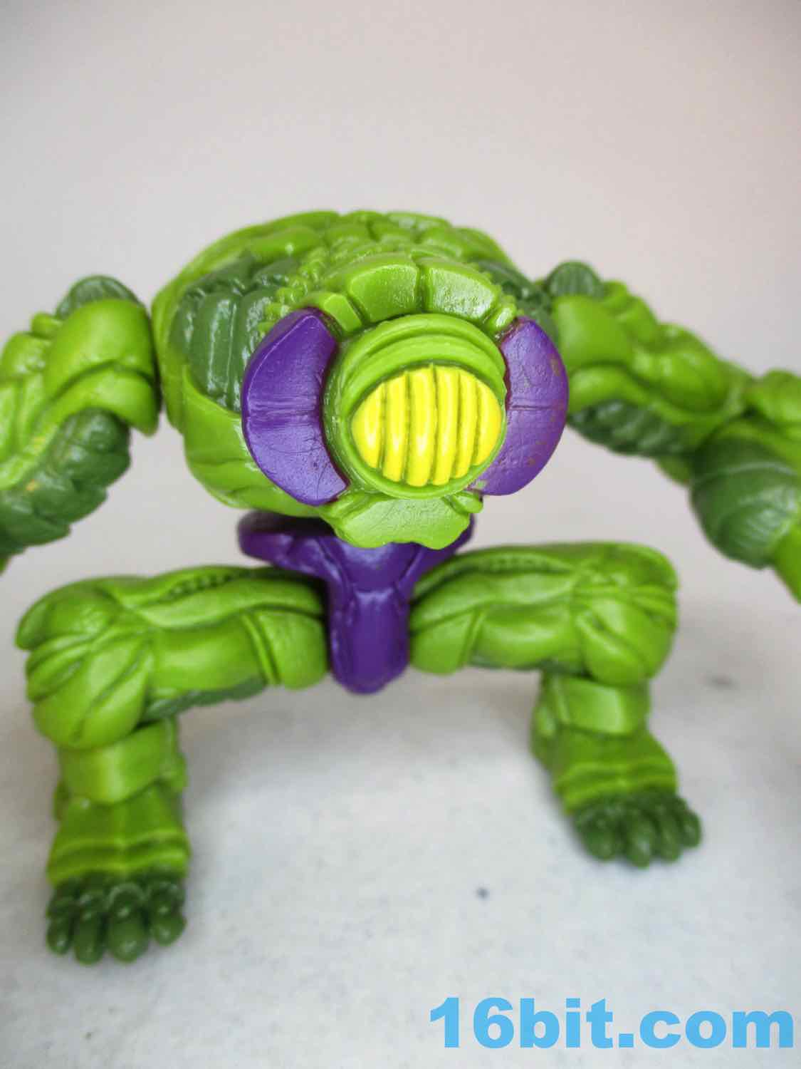 Articulation is more or less the same as your average The Outer Space Men figure with swivel forearms, shoulders, knees, ankles, waist, wrists, hips, and neck. Each joint pops apart and can be swapped for other pieces - like the included mutant arm, or the weird eye accessory. You can rip him apart and build other creatures, and they found some doozies here. The head has a secondary face on the back of the hair/helmet, plus you get a neat scarf-like collar piece you can remove. The joints are generally good, but when you start adding heavy things to his hands for him to throw around, they sag quickly. It's a well-made figure that works wonderfully under his own weight, but if you want to have him throw around Walrus Man with a Democrusher arm, he may need extra support. Swapping limbs is a breeze, as always, and the quality and feel of the plastic is good. Nobody cut the detail here.