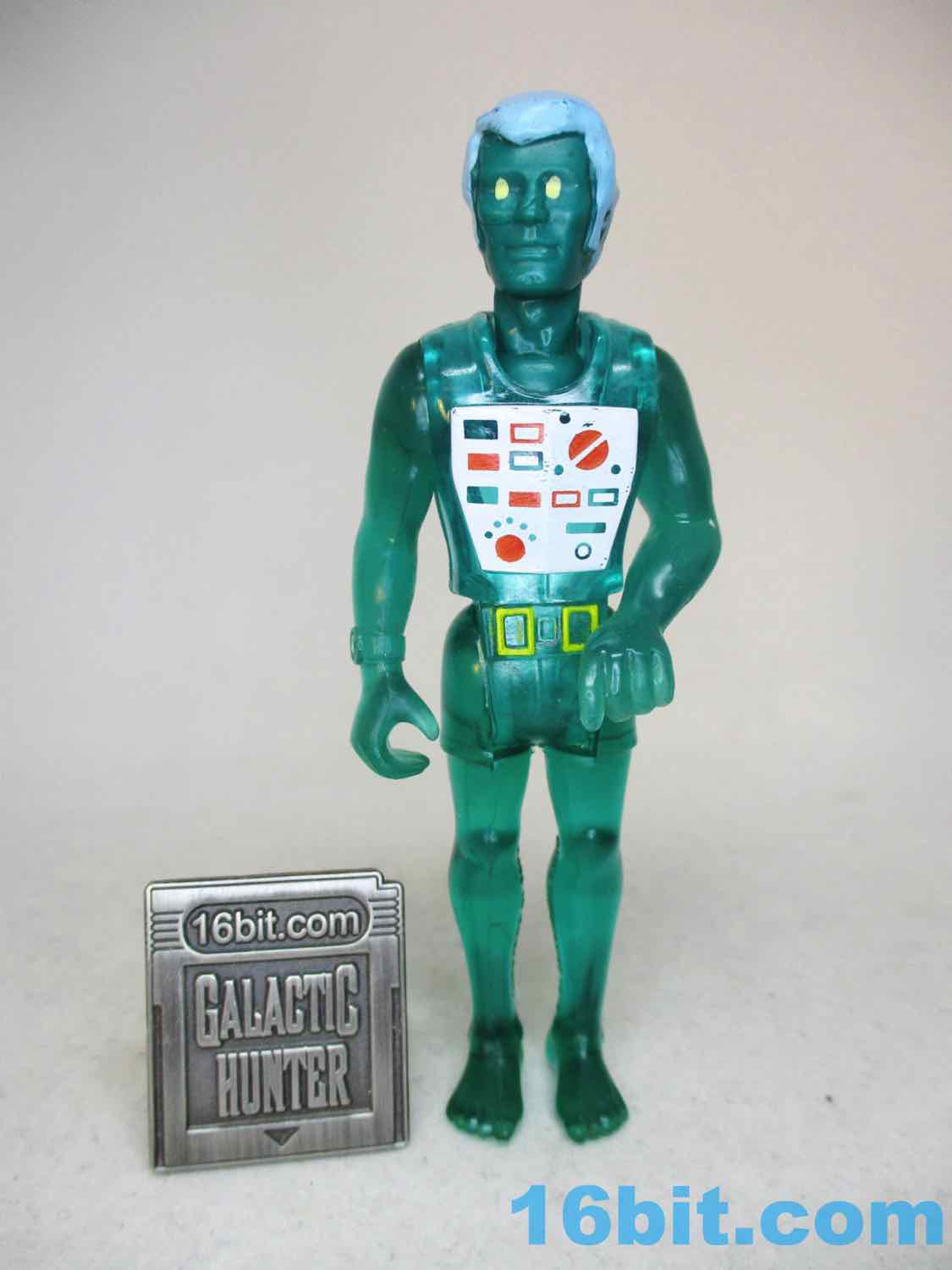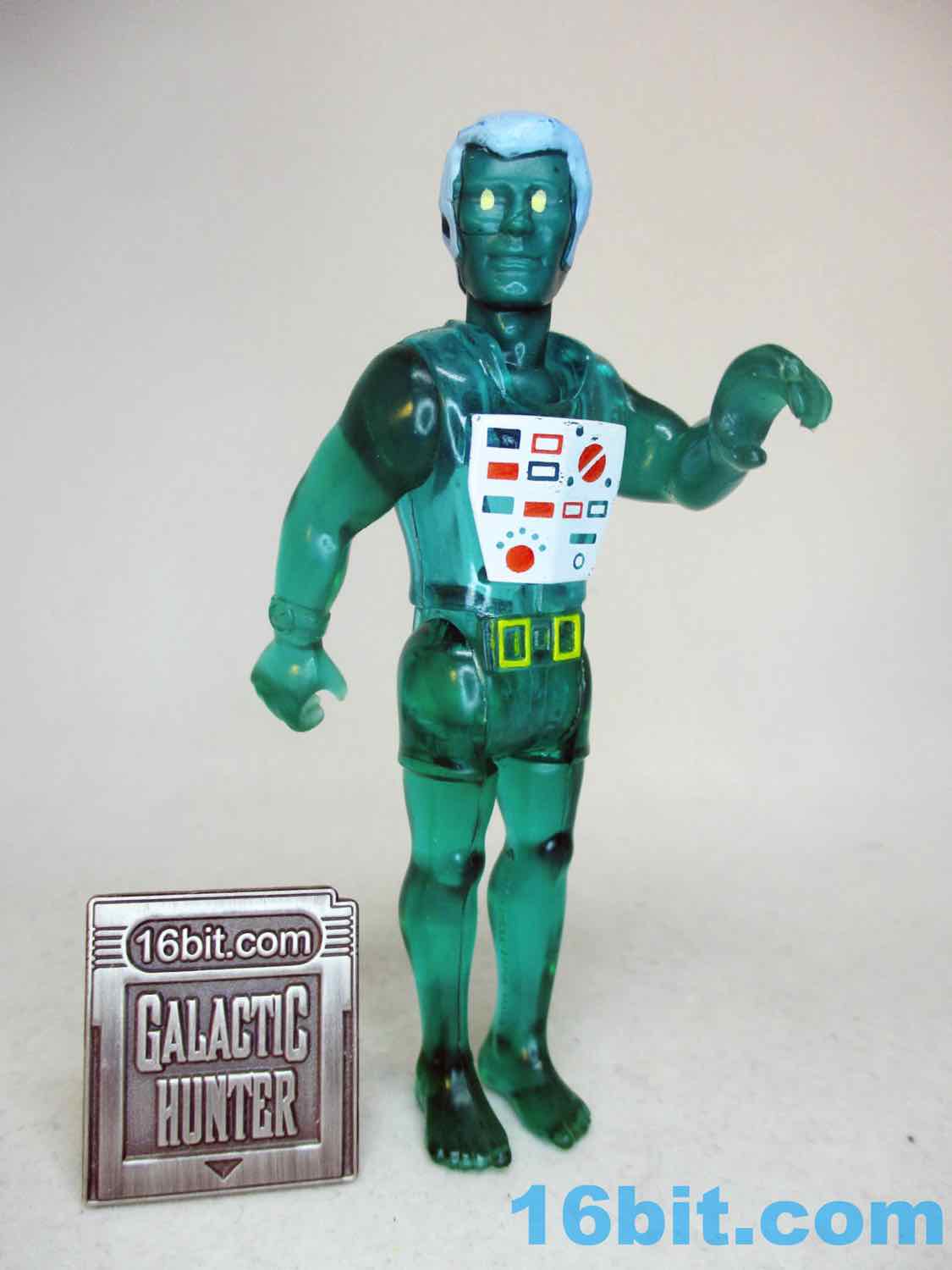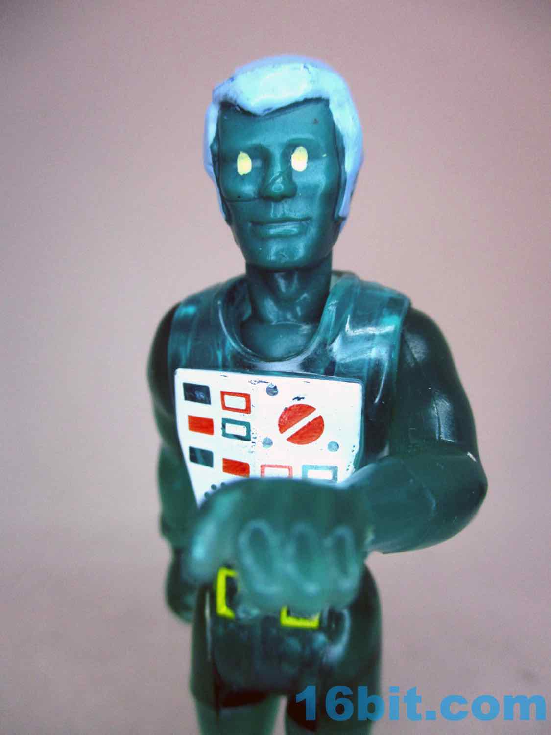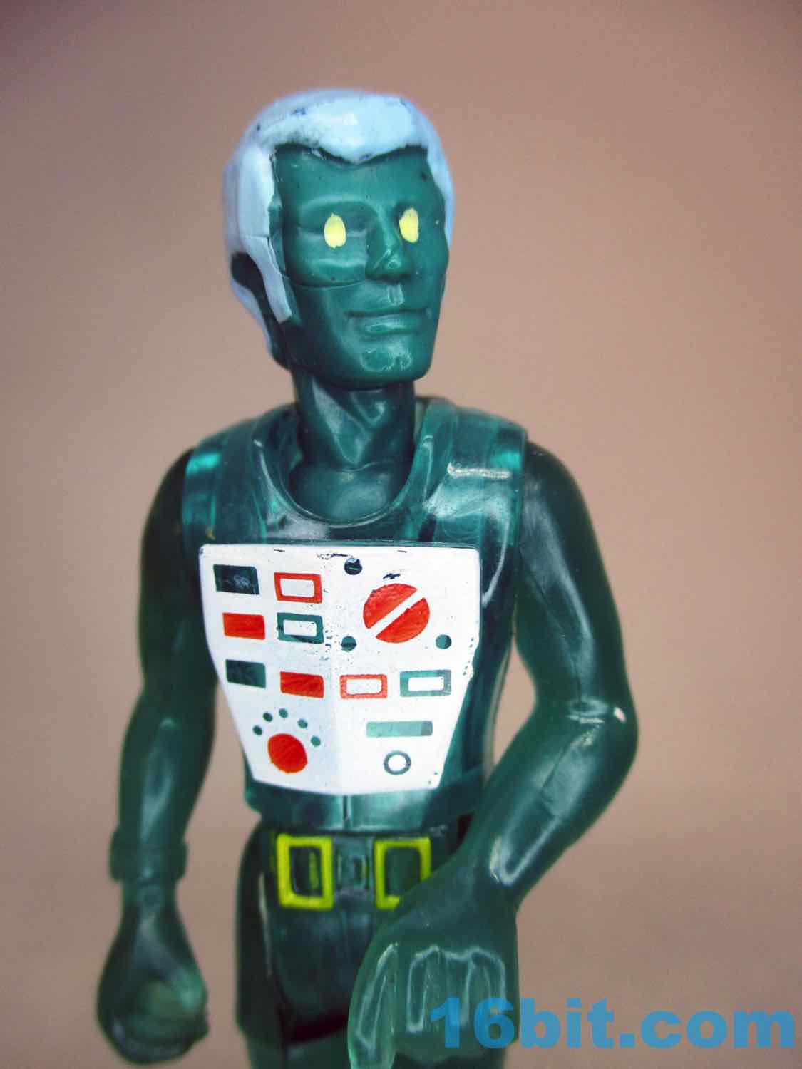 The chest decoration is pretty gorgeous with dials, switches, buttons, and knobs whose functions are known only to people who aren't me. He has yellowish gold belt buckles, bare feet, and on his wrist is a meter to check for water depth. Presumably this man from an alternate dimension digs SCUBA. On the whole, though, the figure shows you the best of what his era of toy design has to offer in that there's clever mold reuse and limited paint applications. Having said that, the chest deco is impressive even by modern standards, comparing it to the "we painted a vest" figures of the 1980s must have blown kids minds. I wouldn't know as I didn't have this one, but the mirrored finish on the Alpha Star pilot certainly impressed me back then.