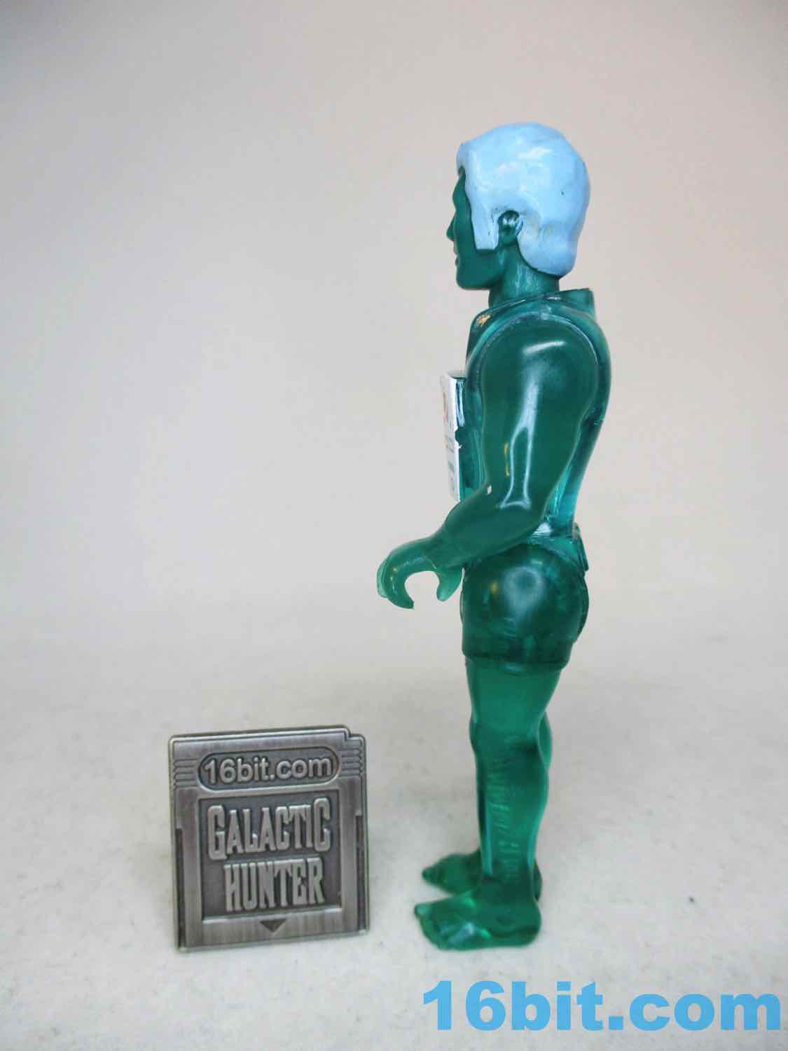 This figure is fantastic, and something of an icon in the toy world. Countless bootleg custom toy makers have riffed on it. Onell Design Rayexx [FOTD #1,665] brought the deco to Glyos, and others were also made in other lines - yet, sadly, no The Outer Space Men yet. But you can get a swell X-Ray Battler, X-Ray Scarab, Bio-Mass Monster Rayexx Spliced, and Zullen X-Ray can be yours, maybe, probably. Maybe on eBay. Hopefully they'll go back to the well on the deco because I was a little short on spare toy funds for some of these and would flip over Toy Pizza or Healey Made or Delphi figures using these colors. But I digress - Fisher-Price even made two Imaginext figures of X-Ray Man, the 2018 X-Ray Man & Dog [FOTD #2,014] and FP-636 [FOTD #2,312] from 2021. It's an iconic look, basically a photo negative of a pinkish human with dark hair. Go ahead and run some sort of "invert" filter on these figures in Photoshop - I'll wait. The blue hair turns brownish, the yellow eyes turn blueish, and you get skin that looks like a pink person has gone streaking. So I'm glad Fisher-Price took their Diver figure and just cast it in clear green plastic with an opaque green head, it looks much less scandalous.