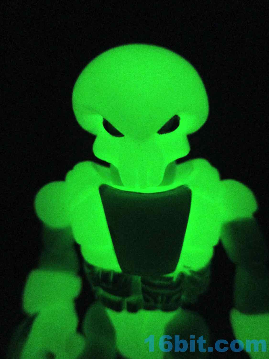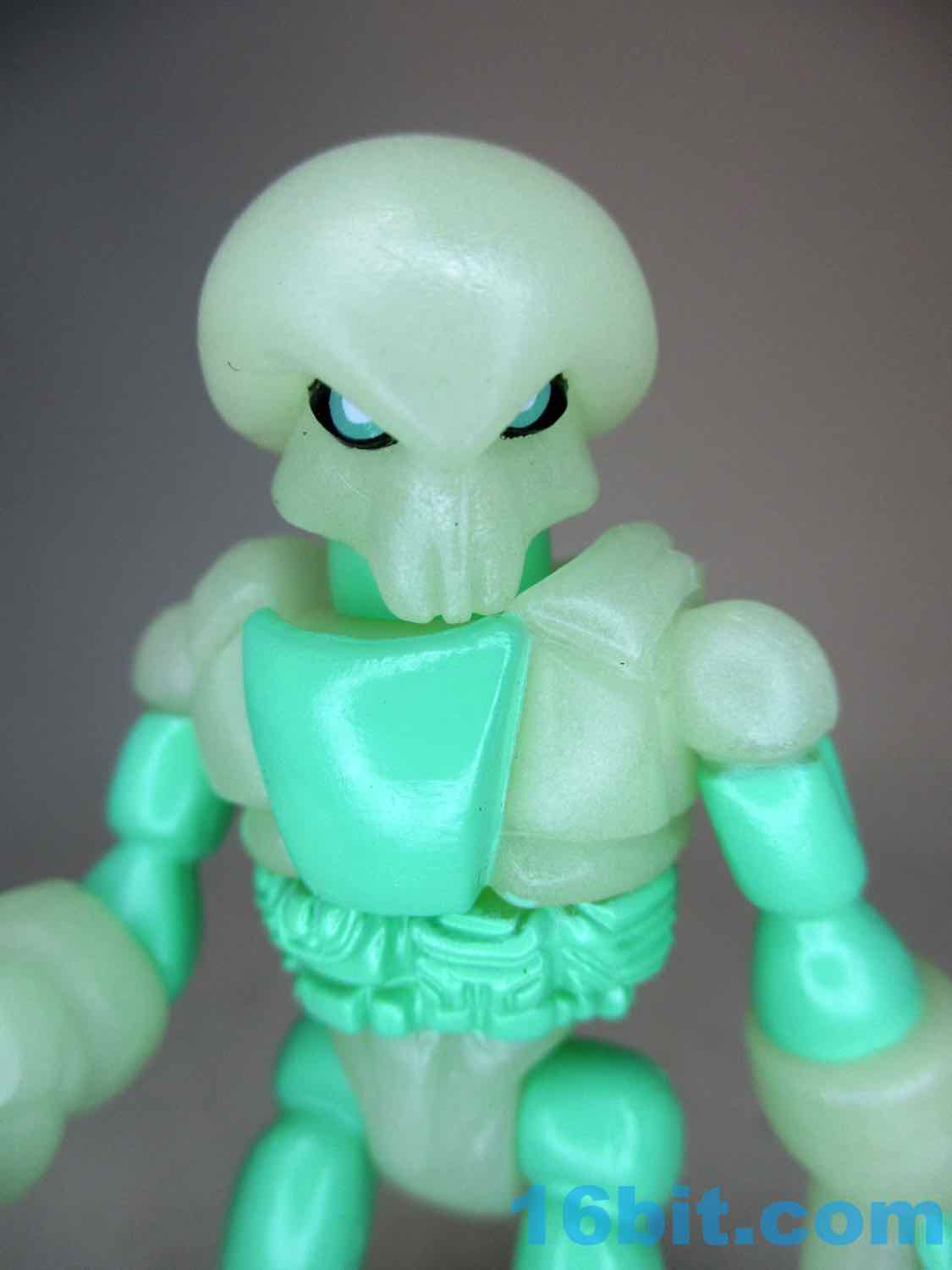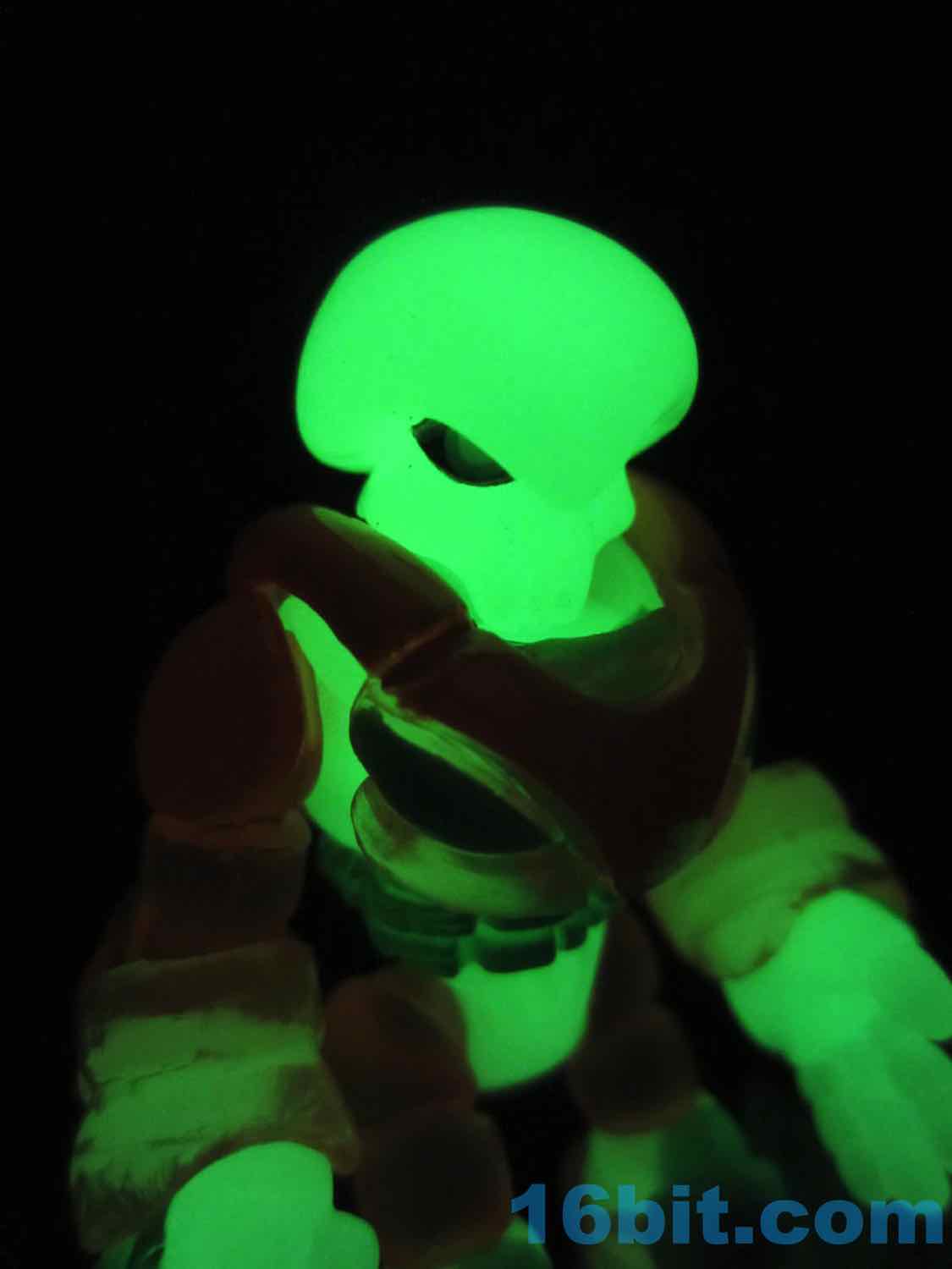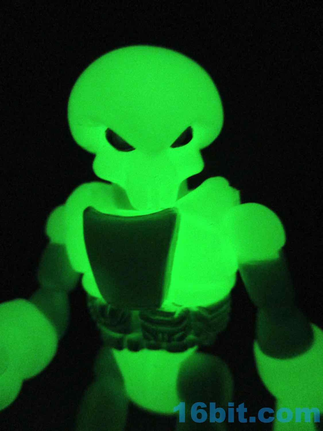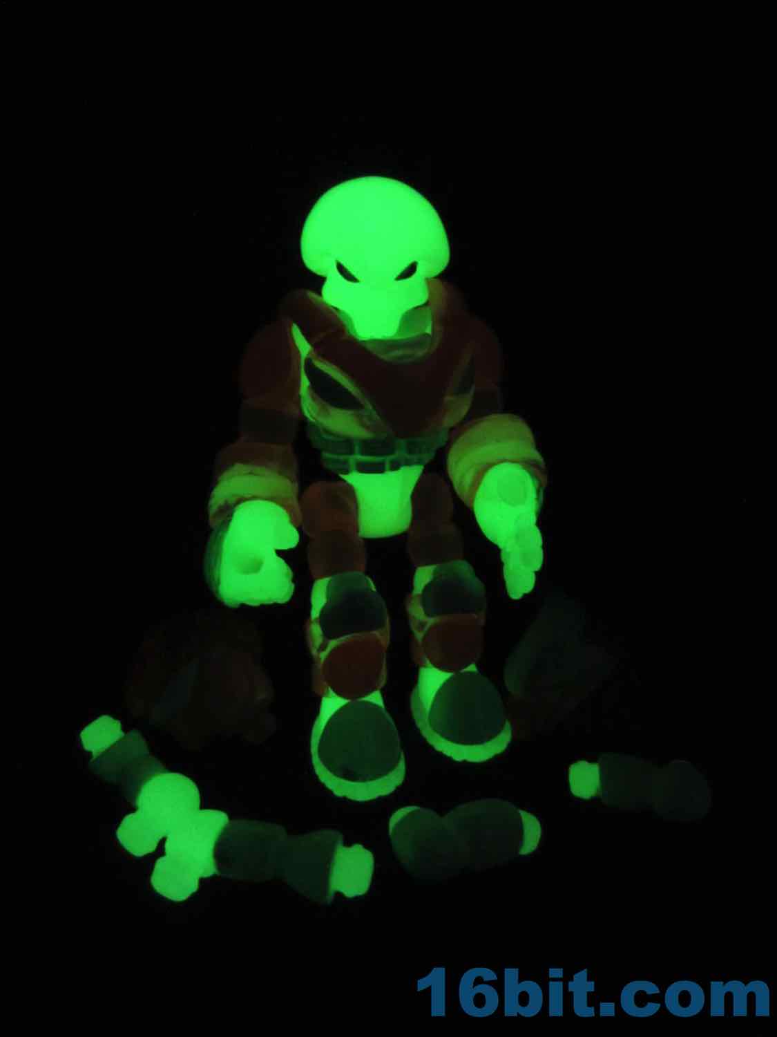 As usual, Pheyden has 13 pieces and 12 joints, cast in that off-white-ish green glow plastic we all know and love. It does a great job of lighting up a dark room, and this time he has extra green painted details on his knees, the backs of his hands his belts, and the toes of his boots. The eyes are black, green, and white, and he stands about 2 3/4-inches tall. He can pop apart at each joint, and you'll need to make use fo that feature if you want to dress him up in his Glyarmor or swap out the heads.