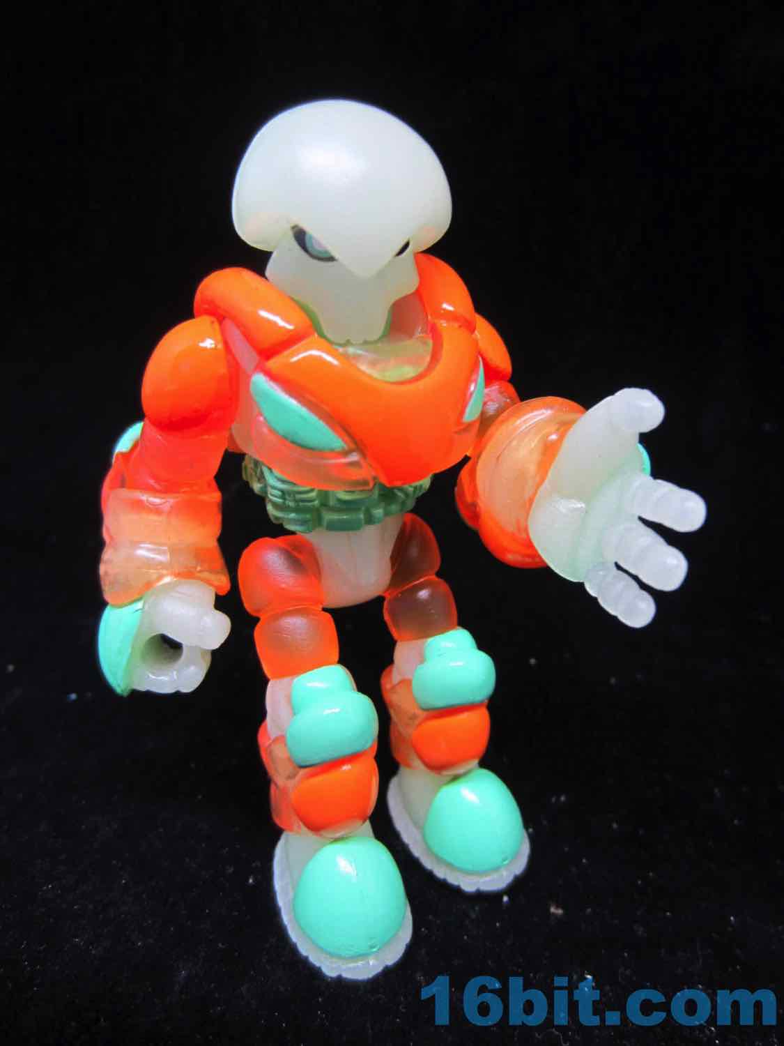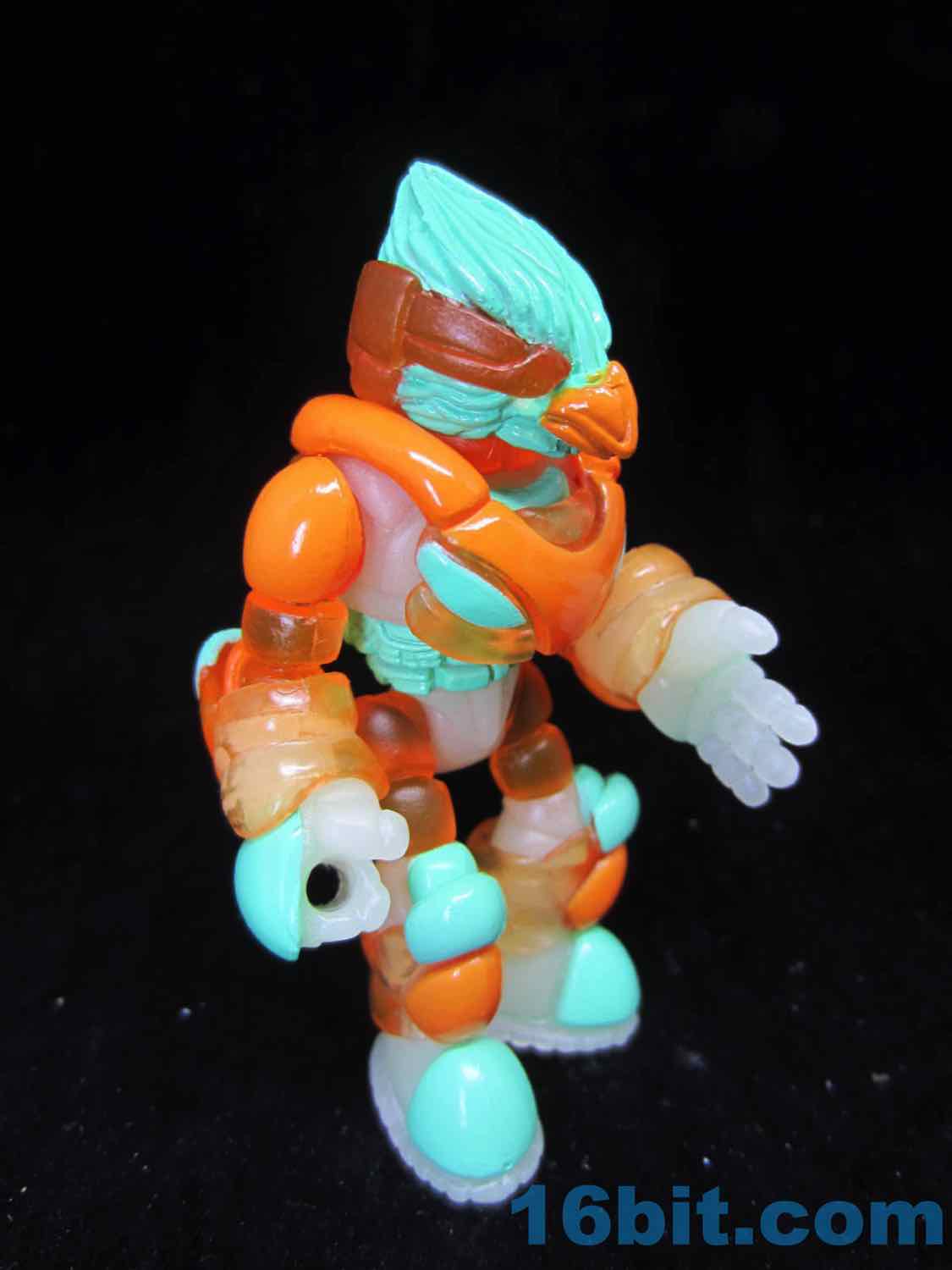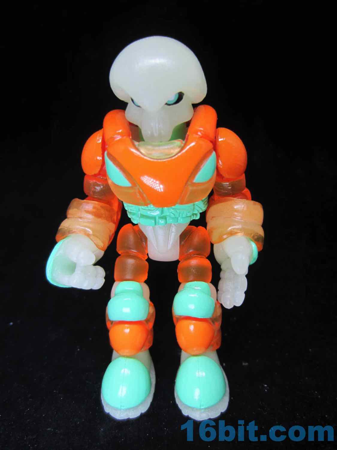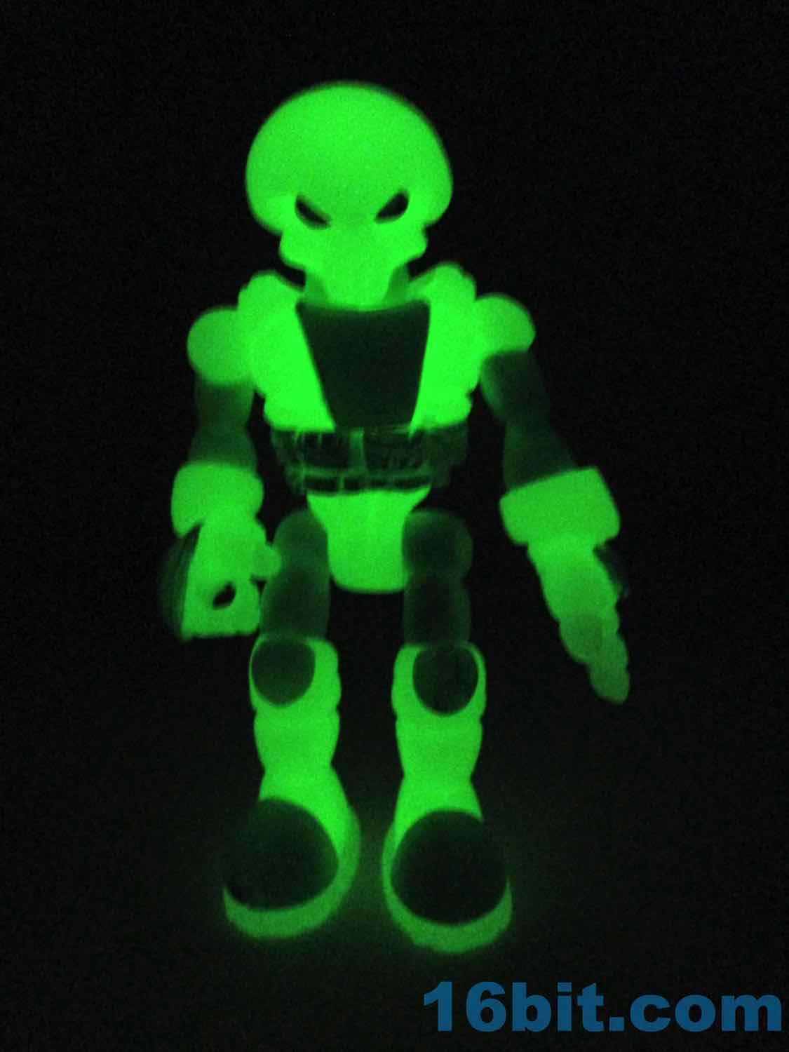 As usual, Pheyden has 13 pieces and 12 joints, cast in that off-white-ish green glow plastic we all know and love. It does a great job of lighting up a dark room, and this time he has extra green painted details on his knees, the backs of his hands his belts, and the toes of his boots. The eyes are black, green, and white, and he stands about 2 3/4-inches tall. He can pop apart at each joint, and you'll need to make use fo that feature if you want to dress him up in his Glyarmor or swap out the heads.
