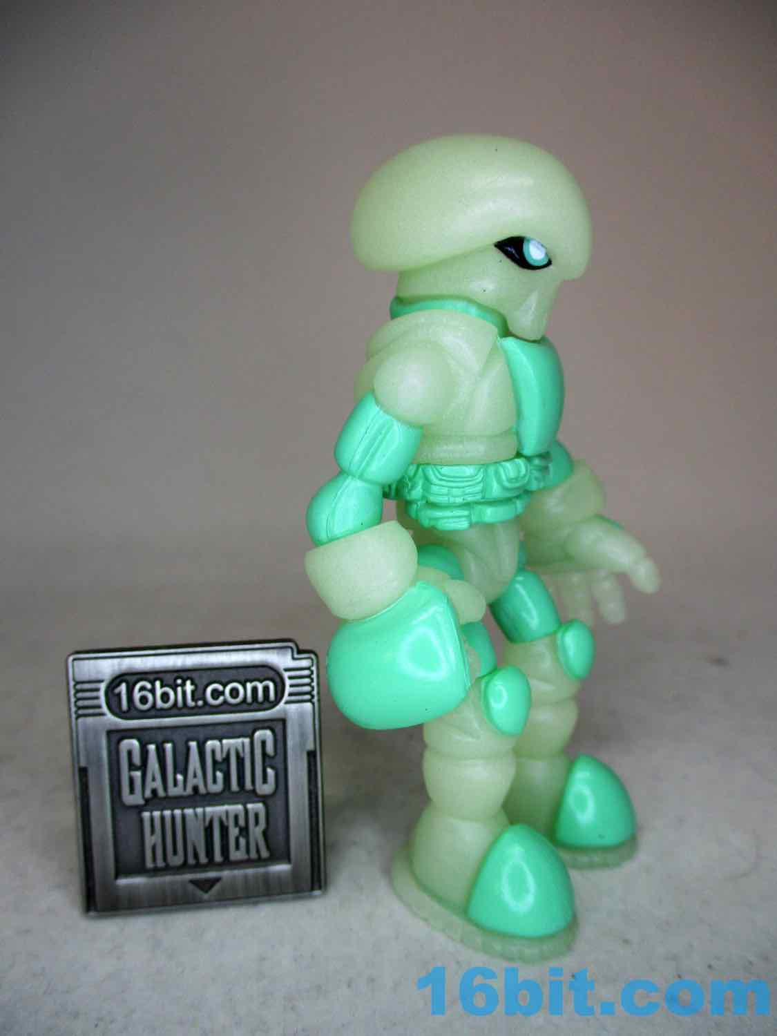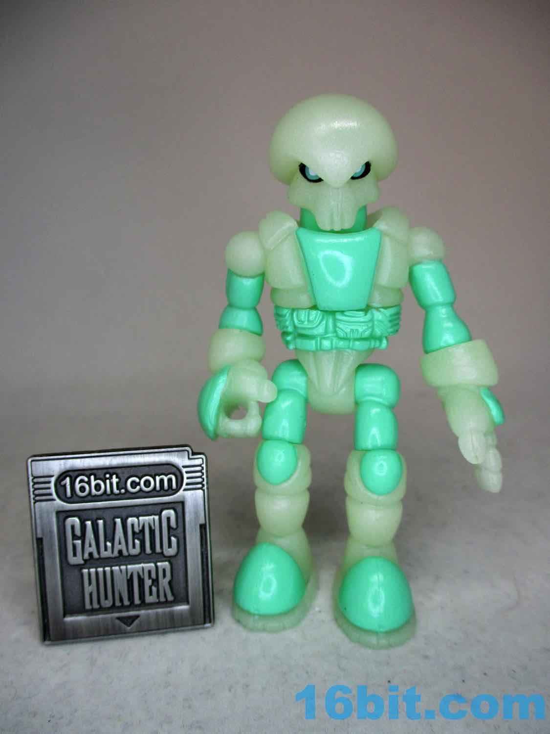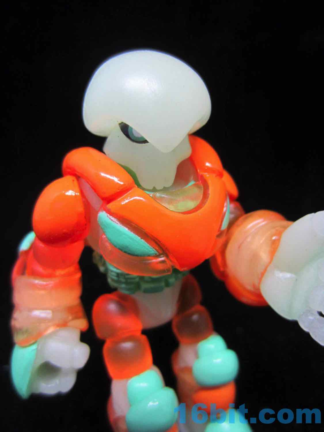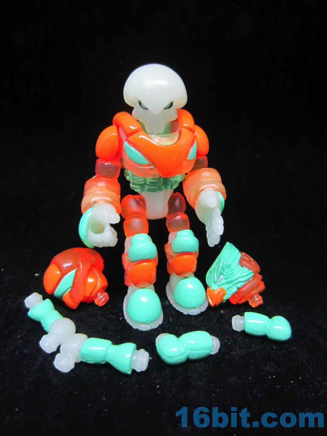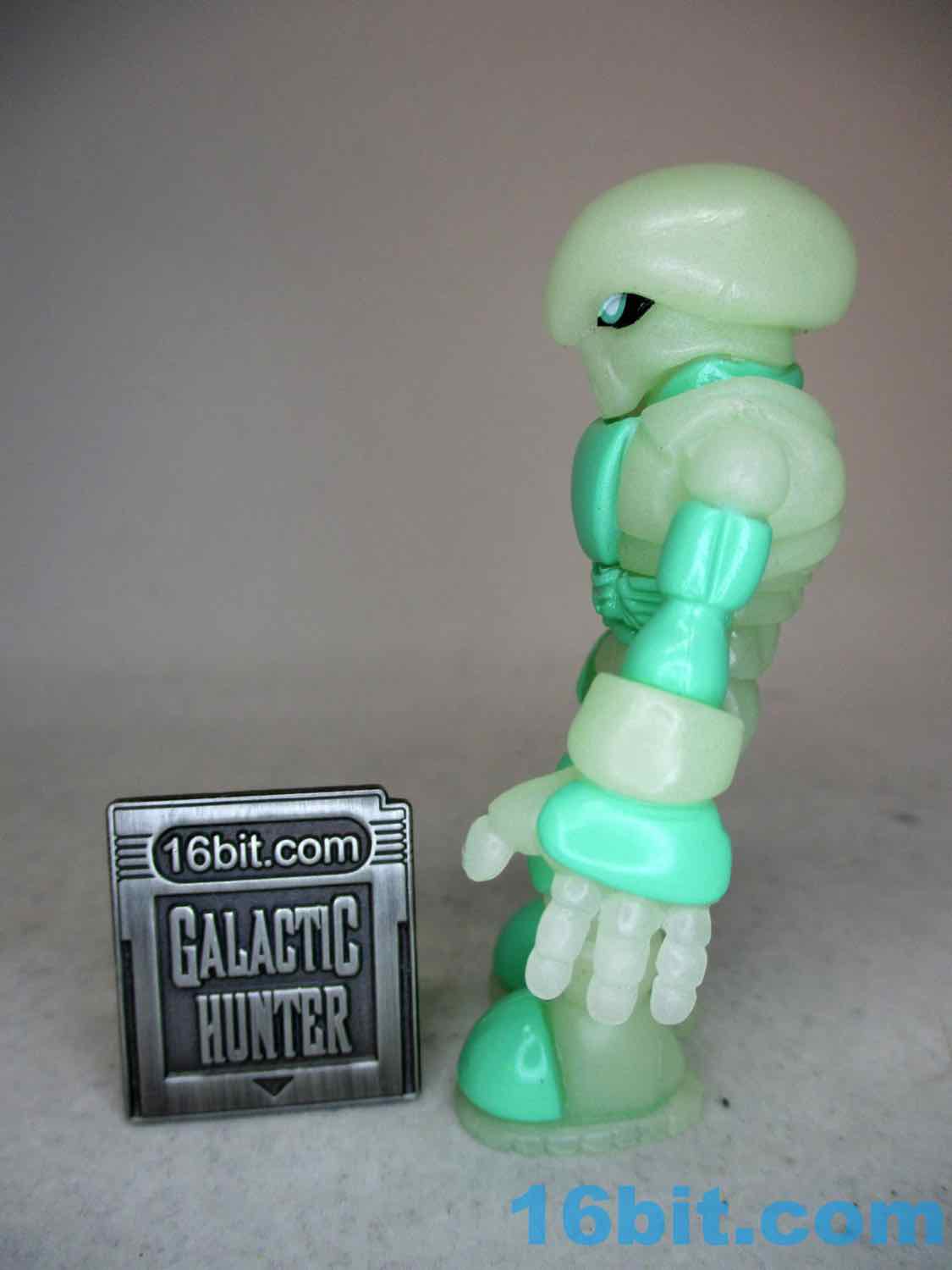 As usual, Pheyden has 13 pieces and 12 joints, cast in that off-white-ish green glow plastic we all know and love. It does a great job of lighting up a dark room, and this time he has extra green painted details on his knees, the backs of his hands his belts, and the toes of his boots. The eyes are black, green, and white, and he stands about 2 3/4-inches tall. He can pop apart at each joint, and you'll need to make use fo that feature if you want to dress him up in his Glyarmor or swap out the heads.